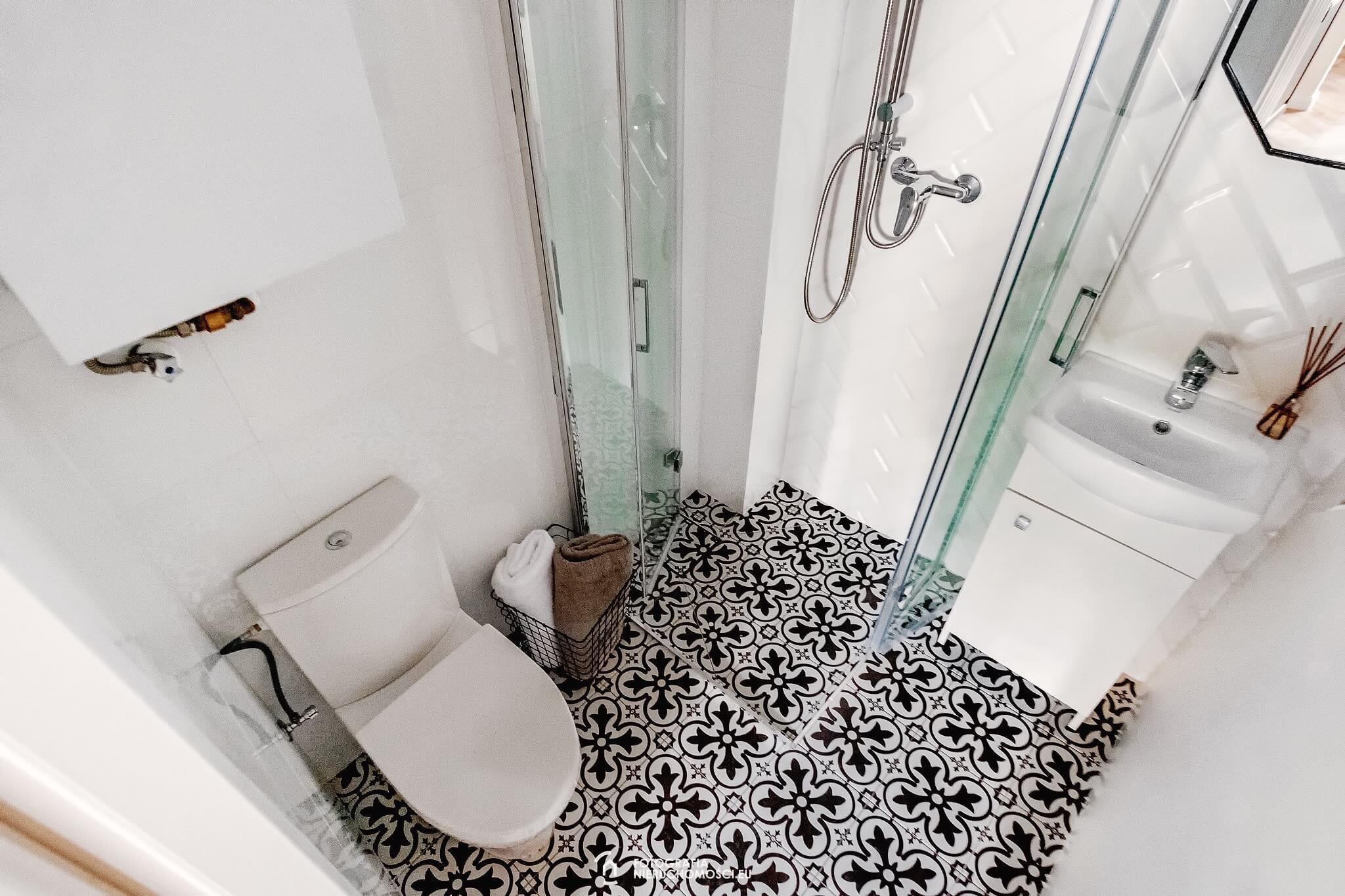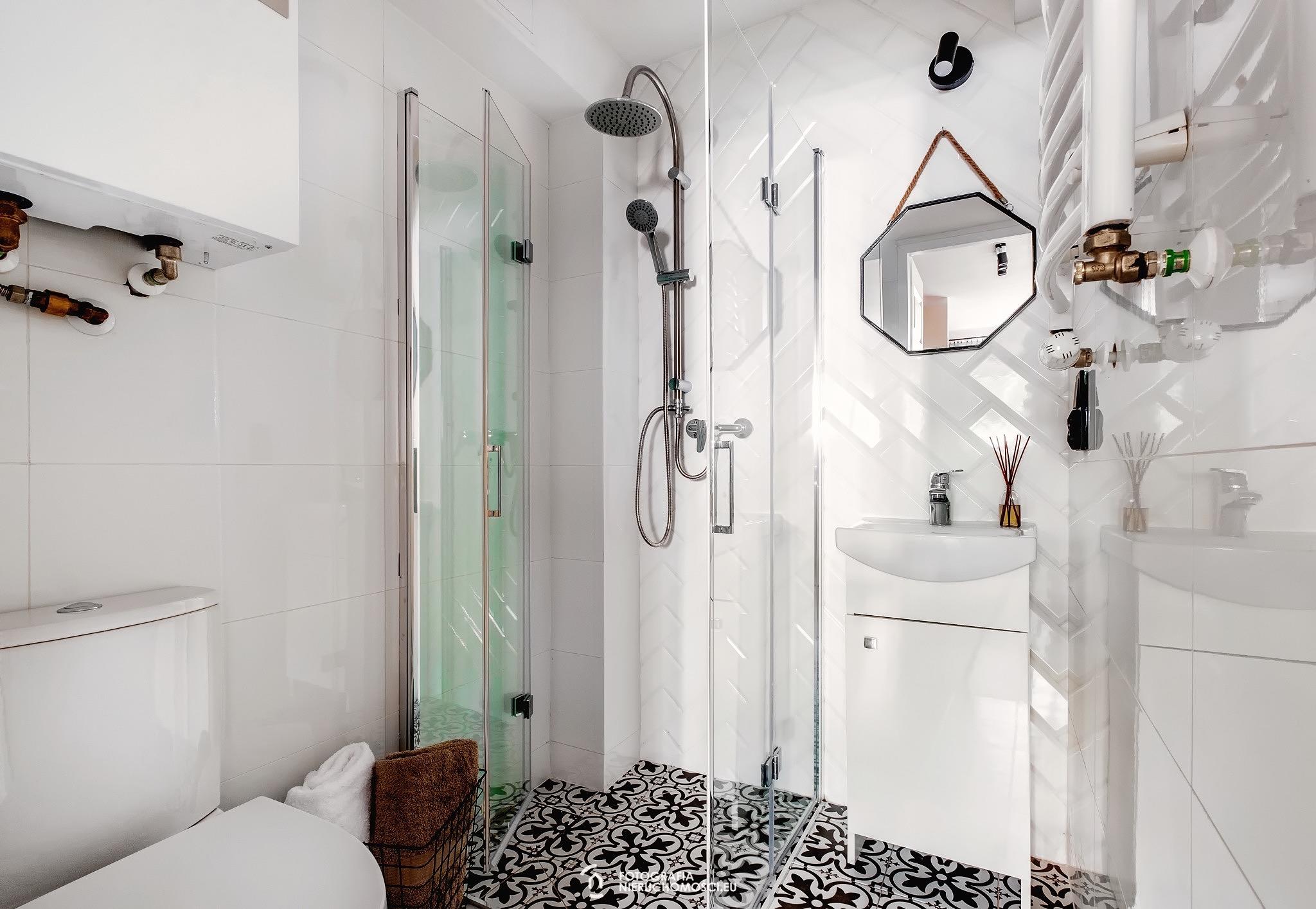 Sypialnia z wygodnym łóżkiem z materacem oraz stolikami i szafą. Łazienka z dużym prysznicem, pralką, nowoczesną umywalką i lustrem.