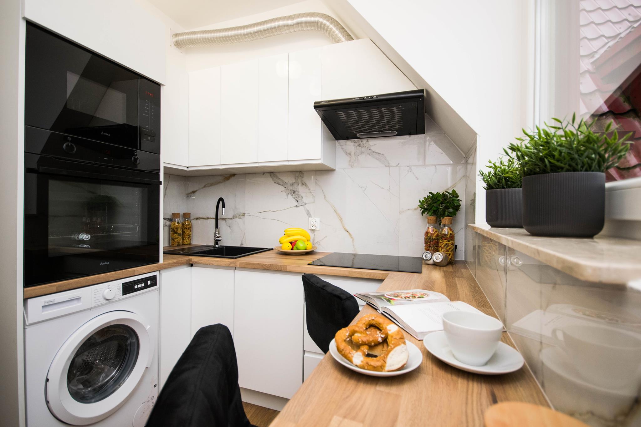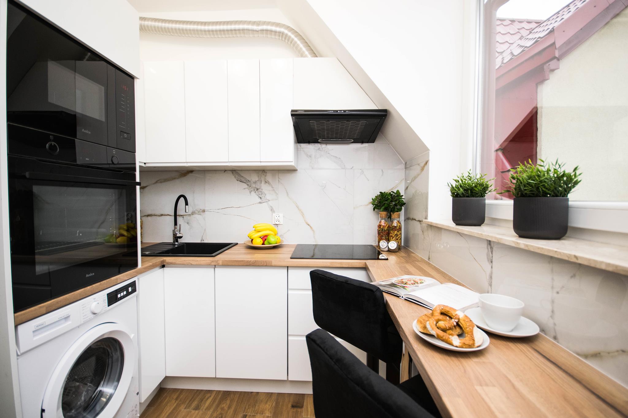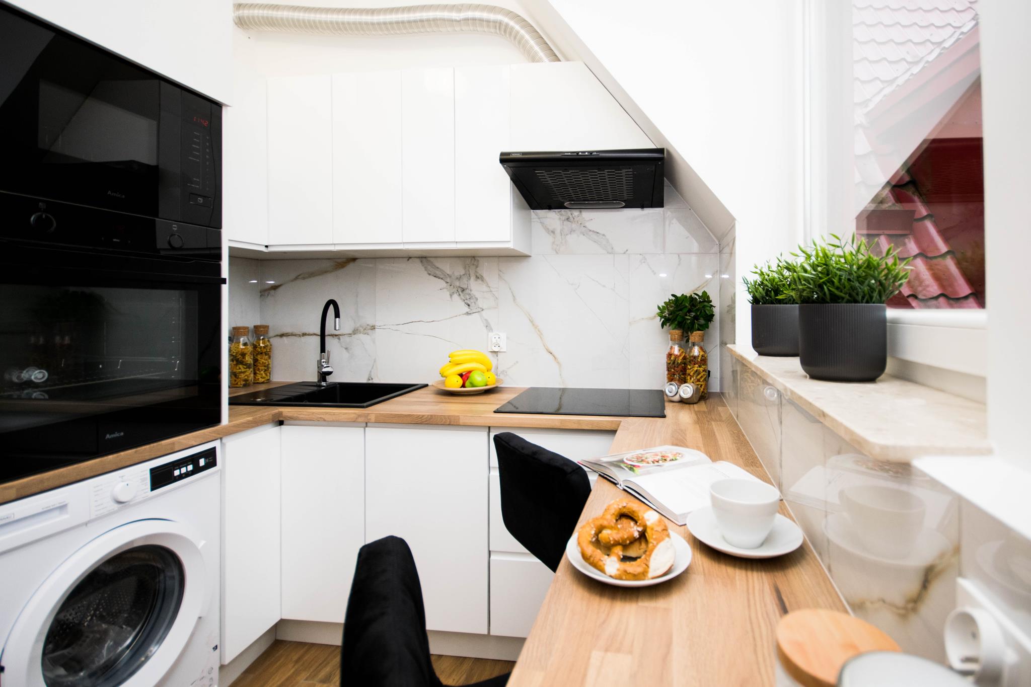 🍳 Duża kuchnia z pełnym wyposażeniem włącznie ze zmywarką i pralką oraz blatem z krzesłami barowymi