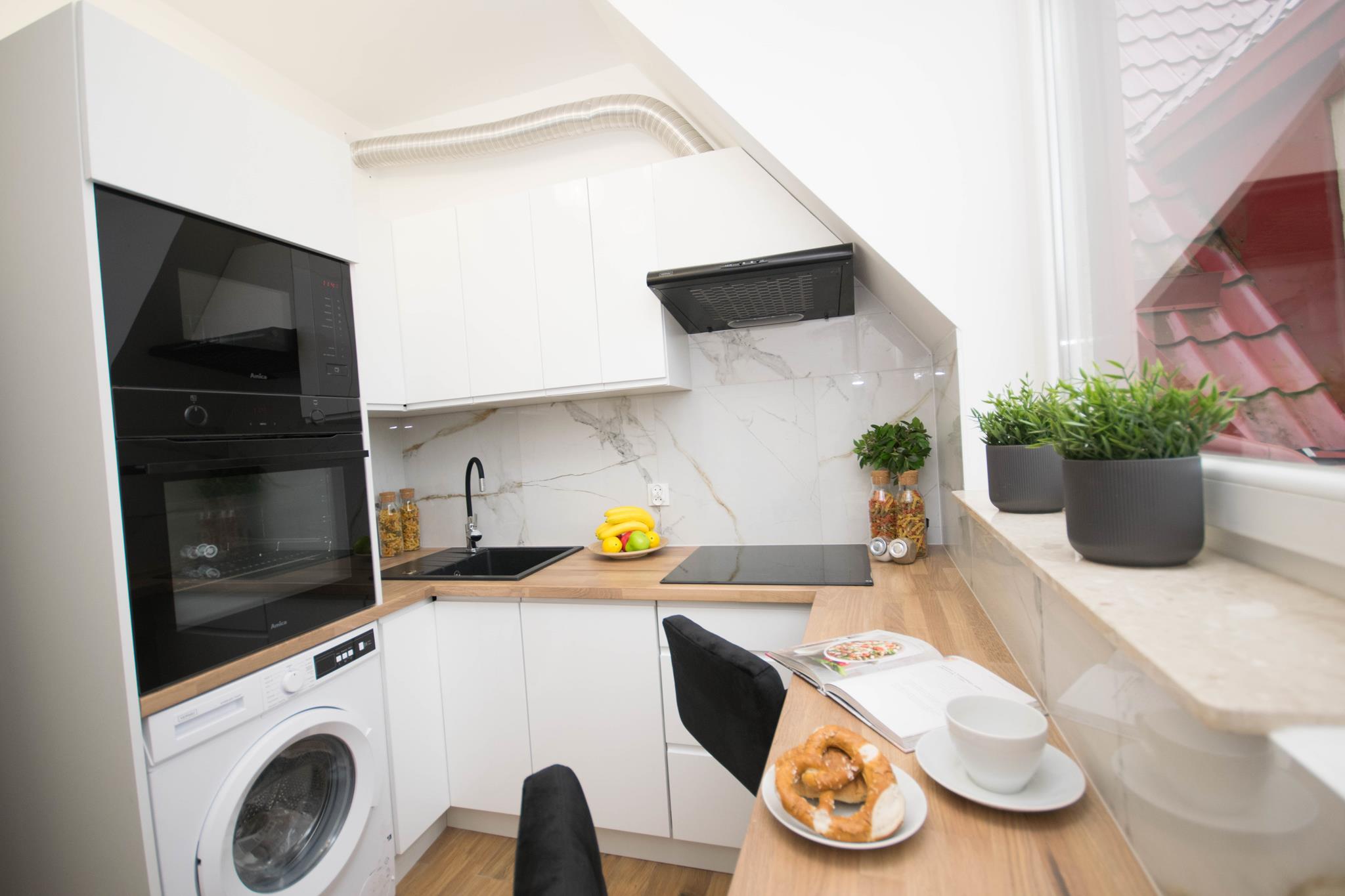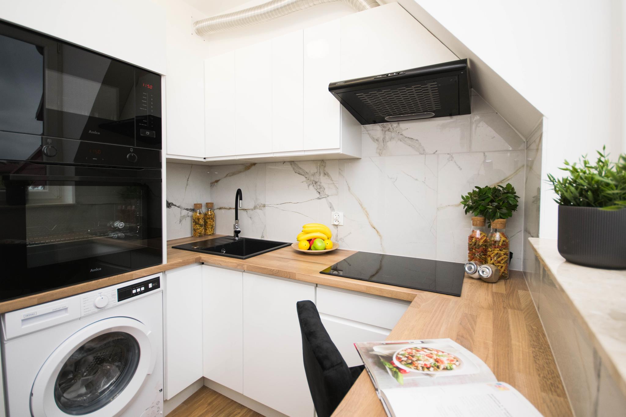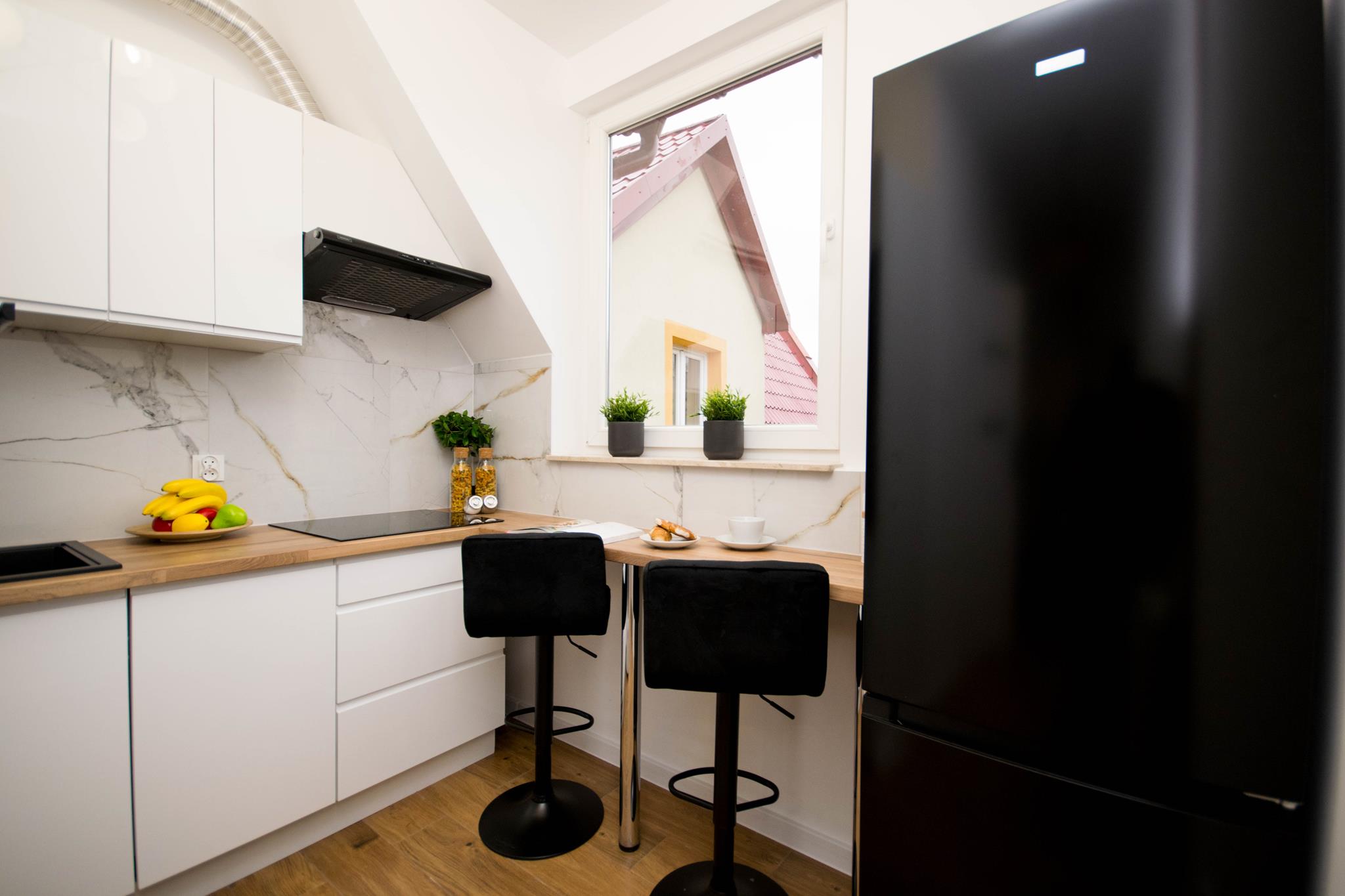 🍳 Duża kuchnia z pełnym wyposażeniem włącznie ze zmywarką i pralką oraz blatem z krzesłami barowymi