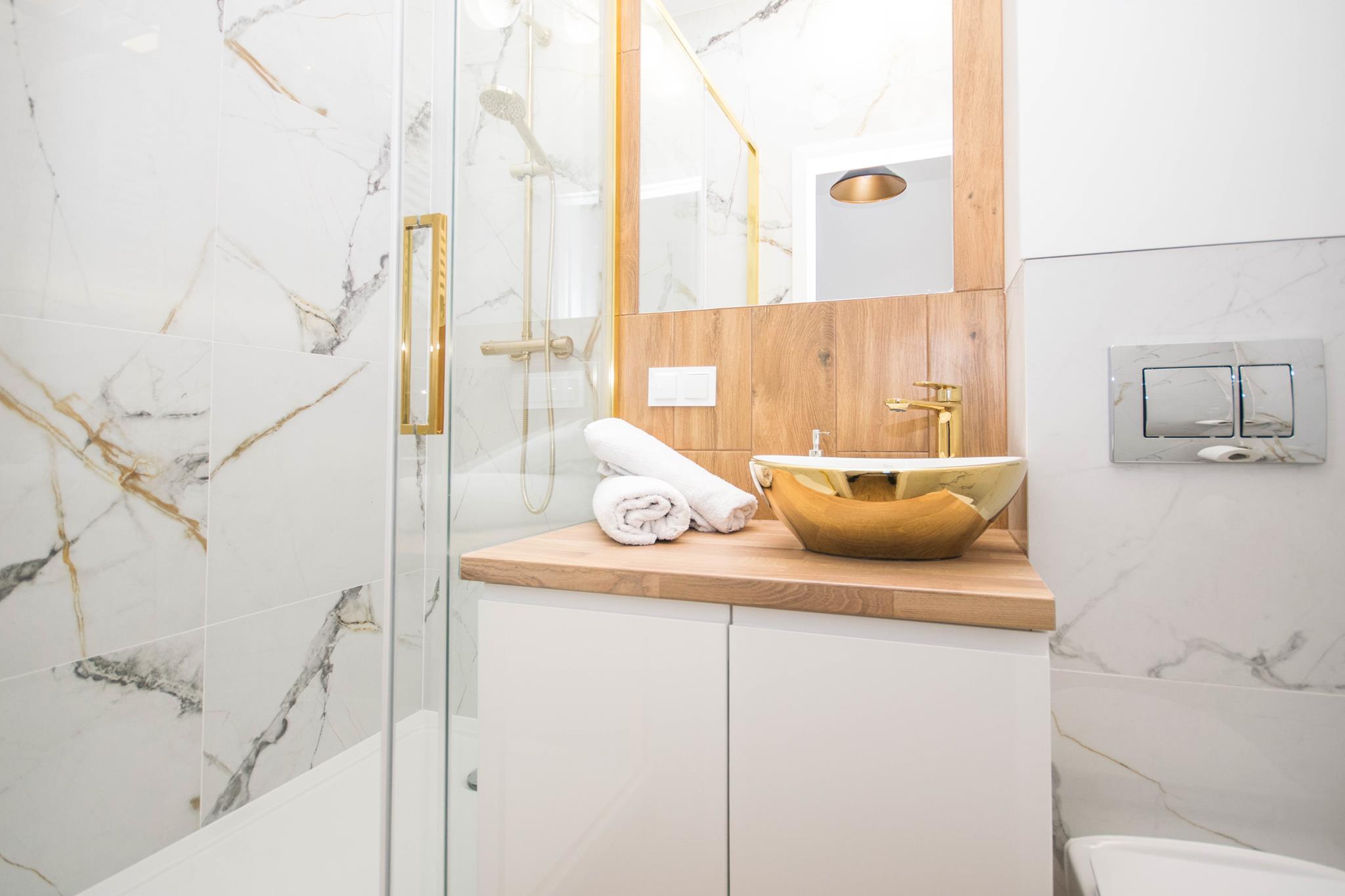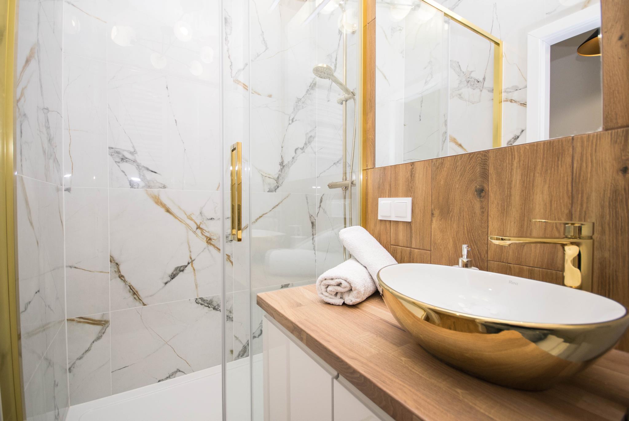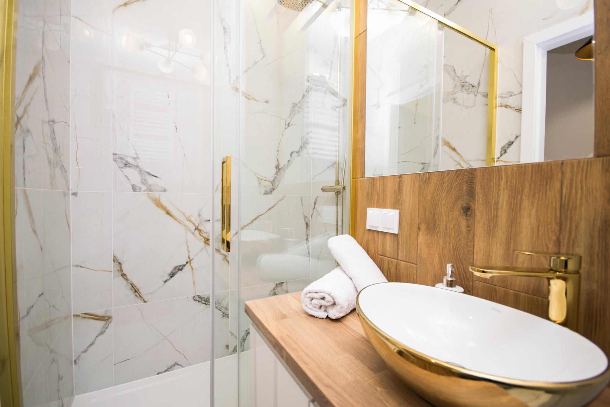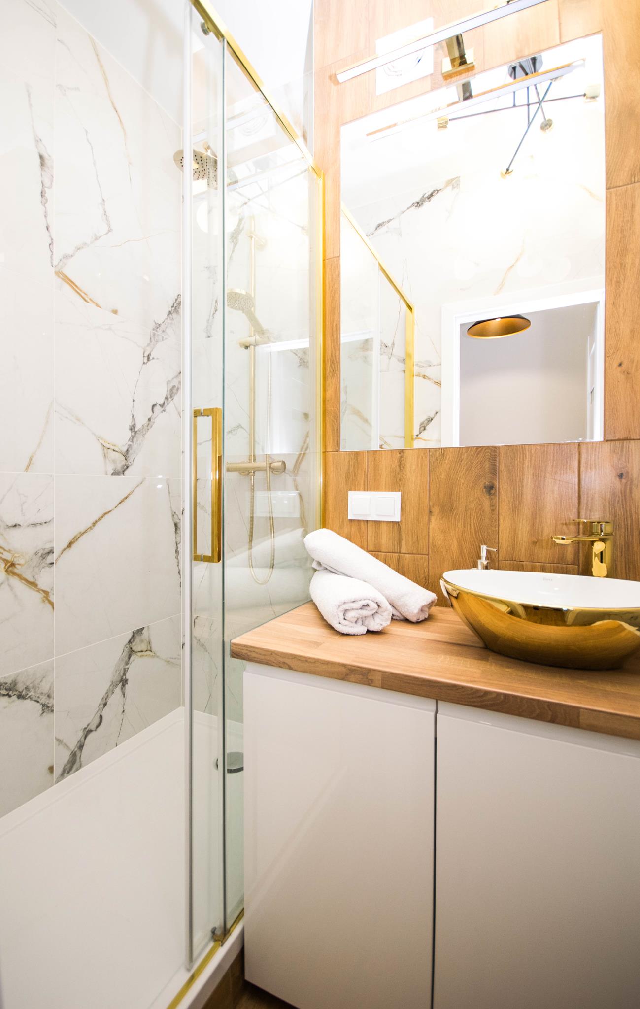 🛁 Łazienka z dużym prysznicem oraz złotymi dodatkami