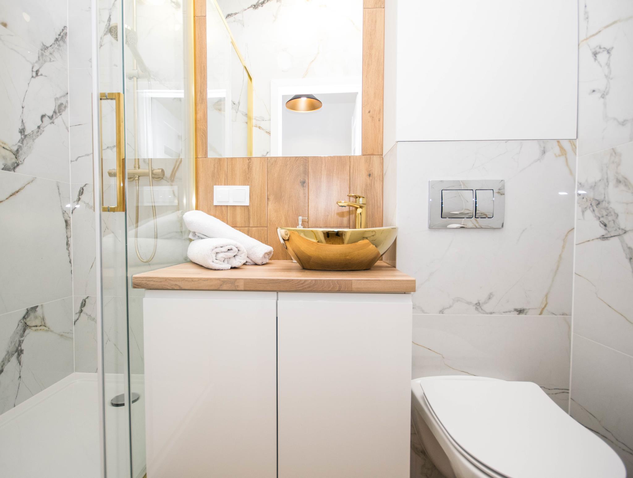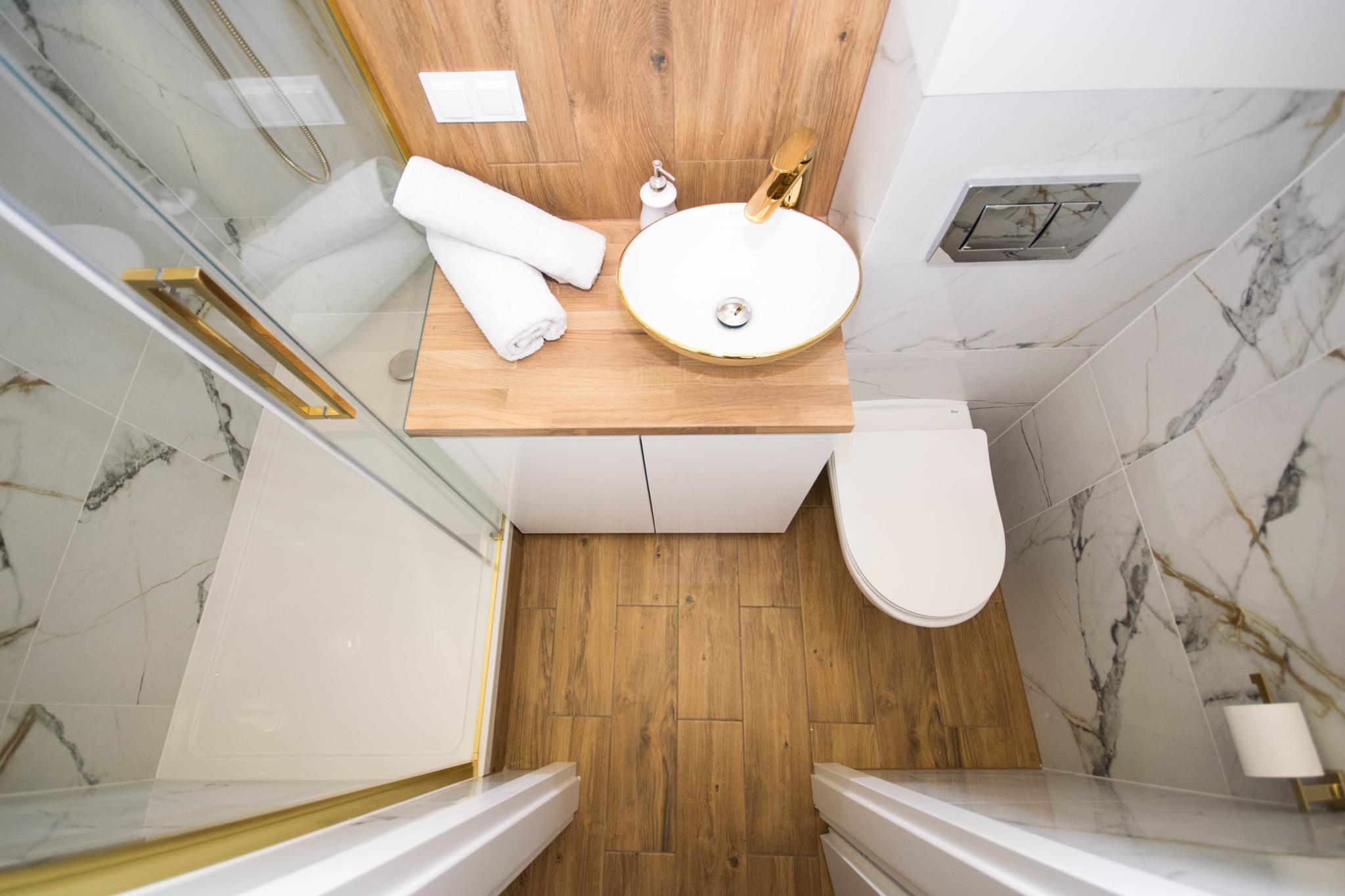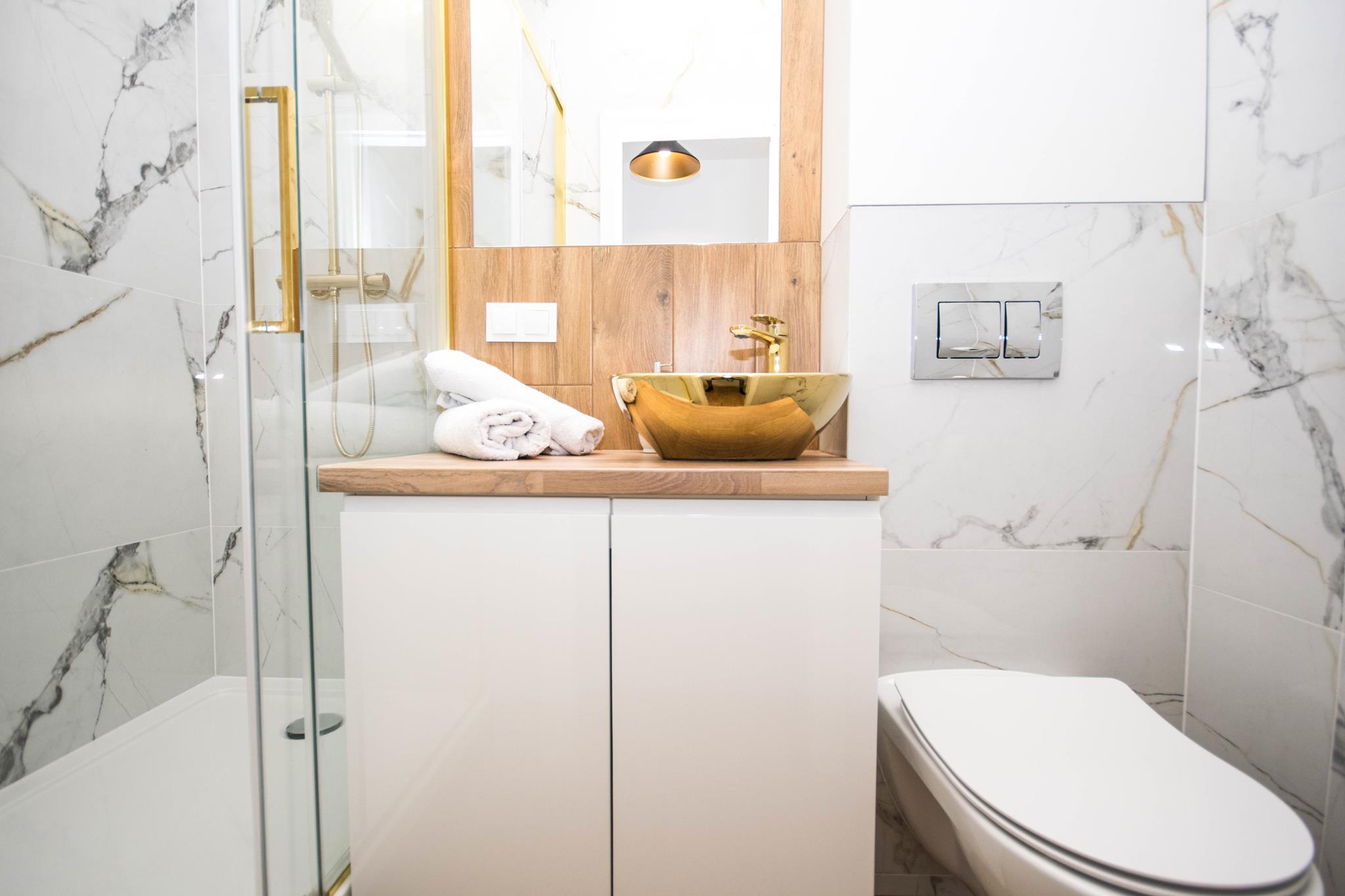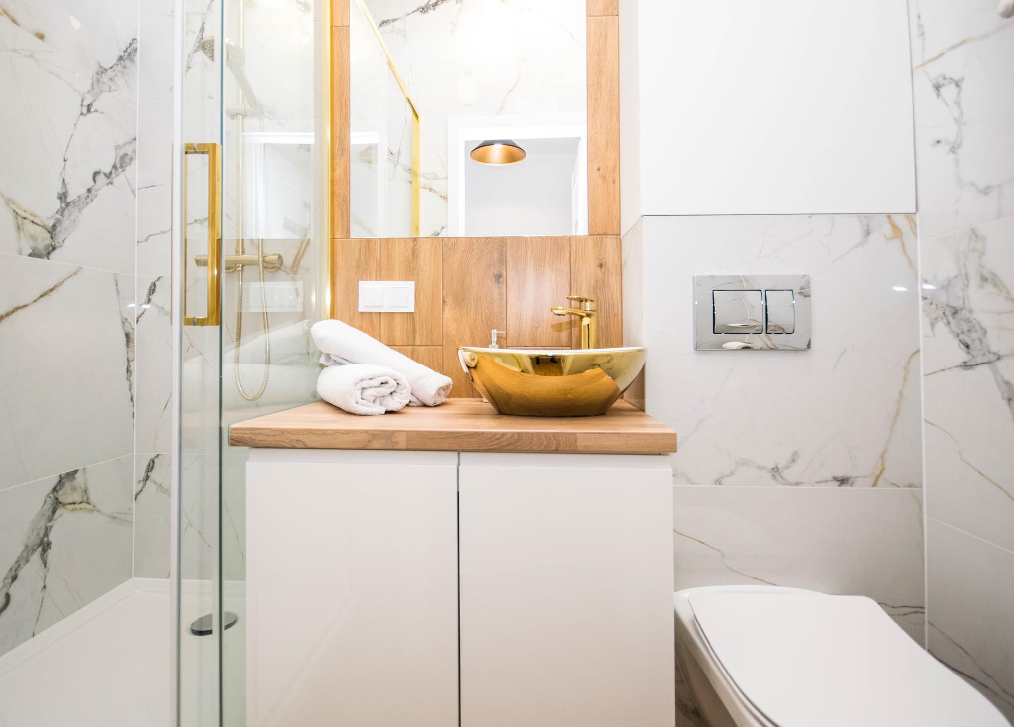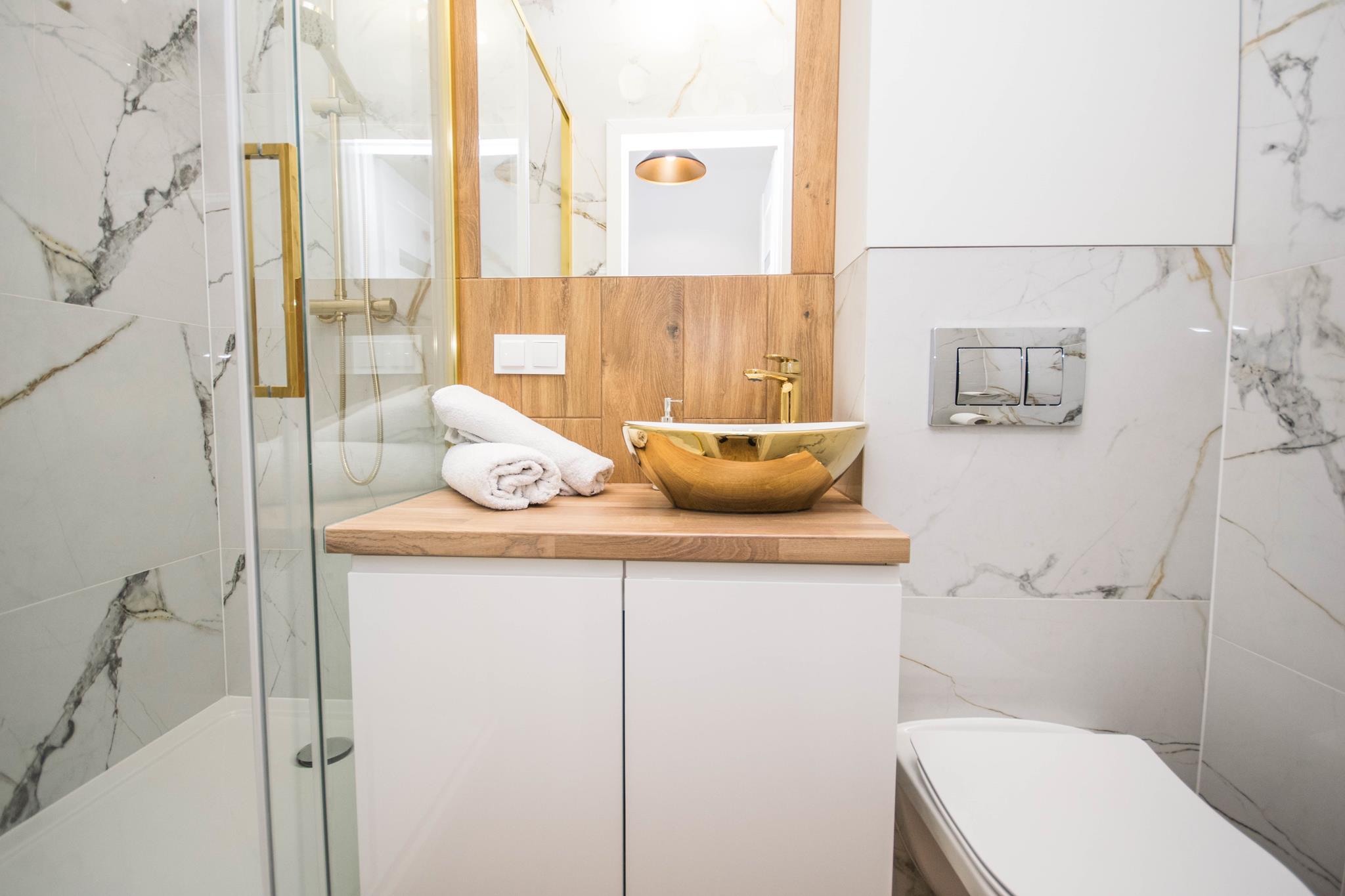 🛁 Łazienka z dużym prysznicem oraz złotymi dodatkami