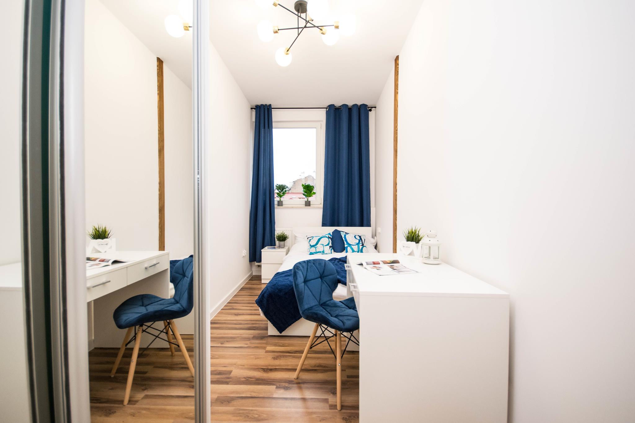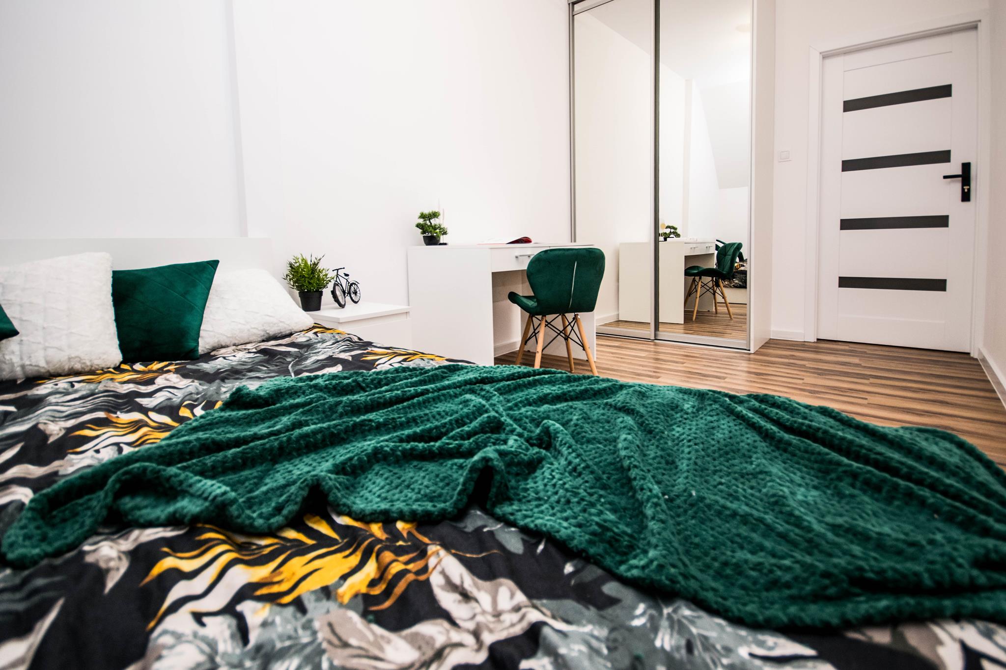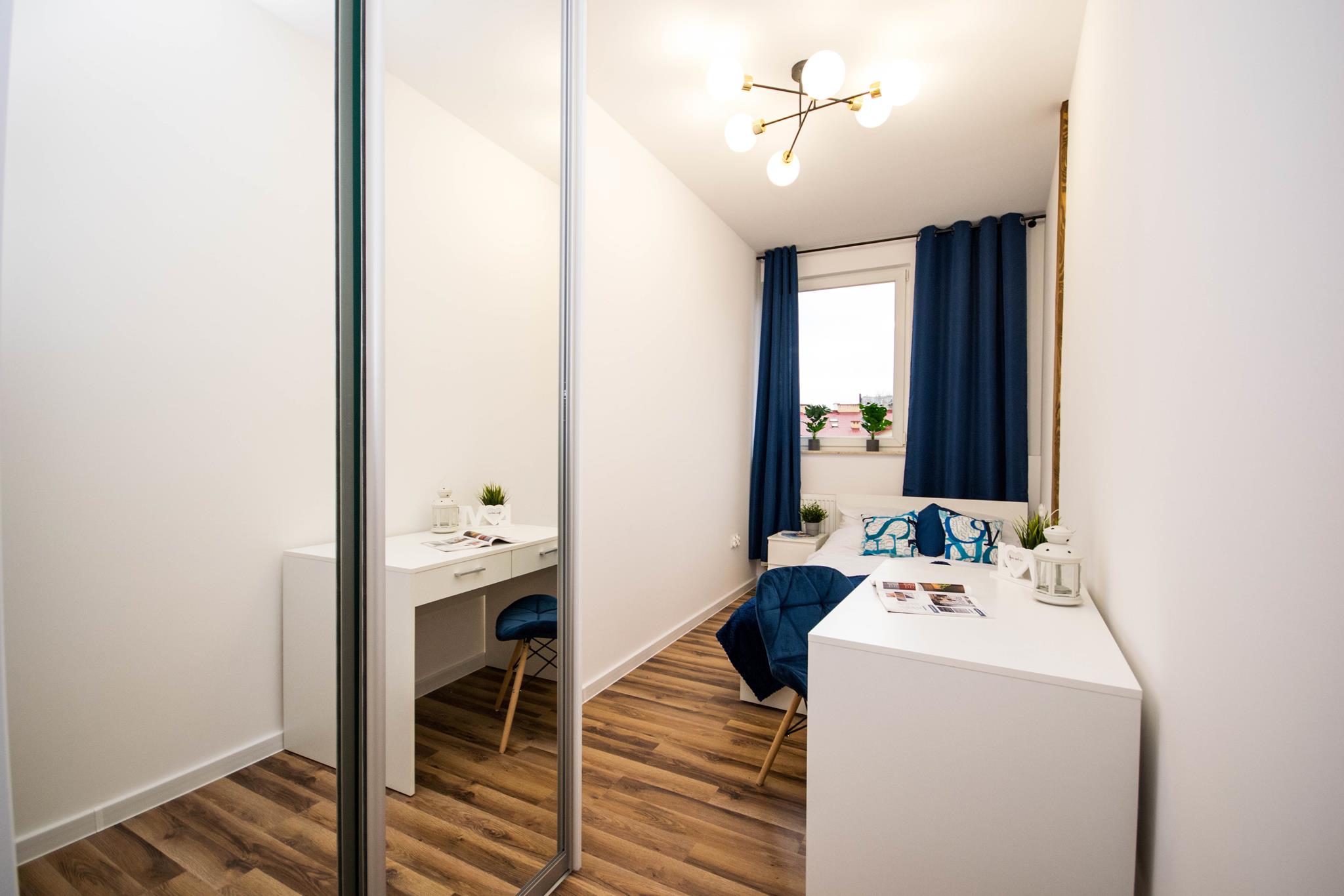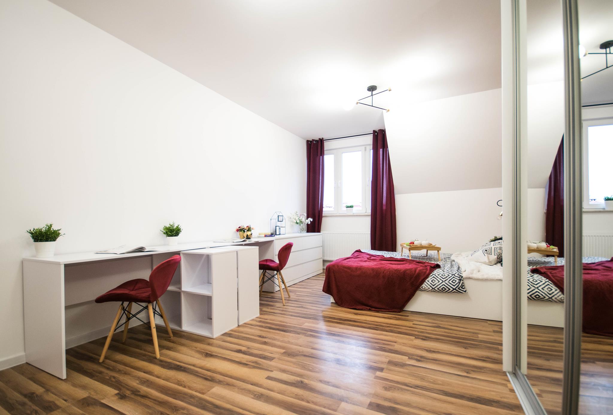 Trzy niezależne sypialnie z wygodnym łóżkiem z materacem, pojemną szafą z lustrami oraz biurkiem z krzesłem idealnym do pracy czy nauki.
