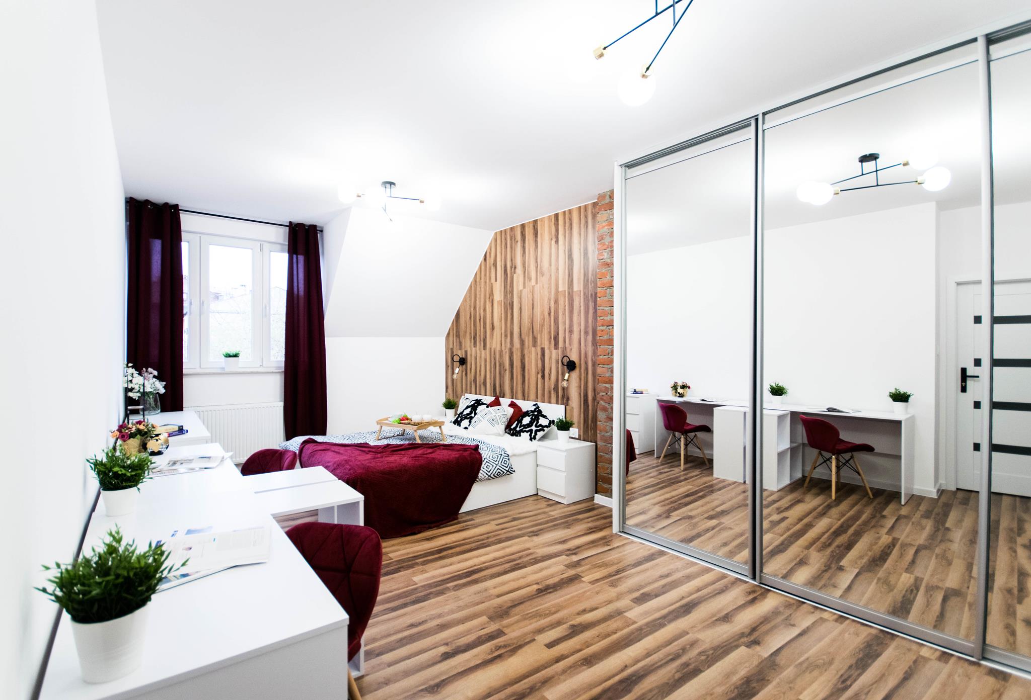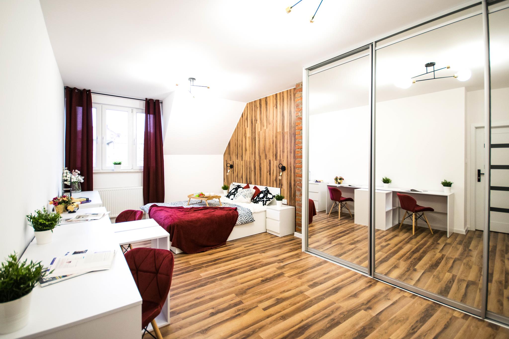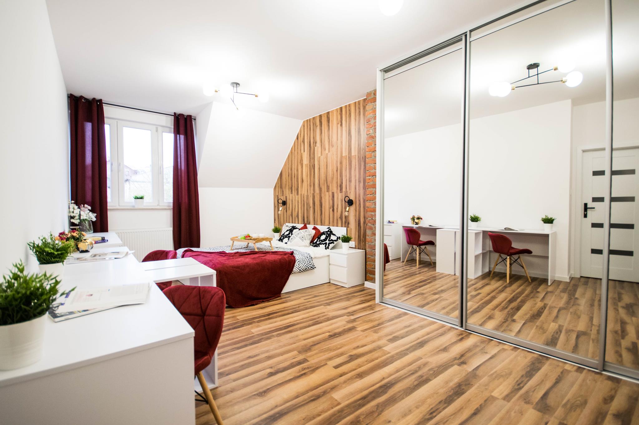 Trzy niezależne sypialnie z wygodnym łóżkiem z materacem, pojemną szafą z lustrami oraz biurkiem z krzesłem idealnym do pracy czy nauki.