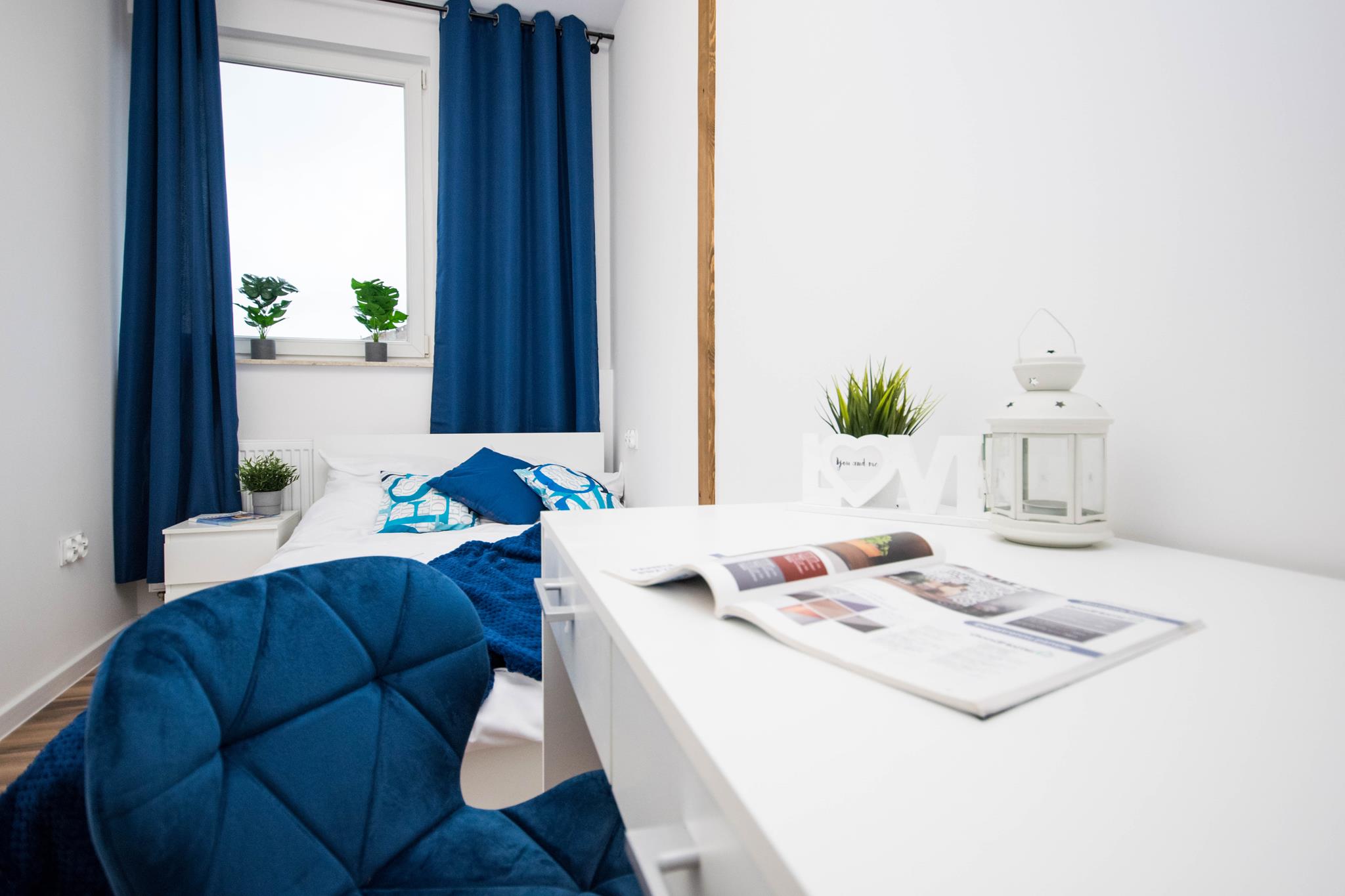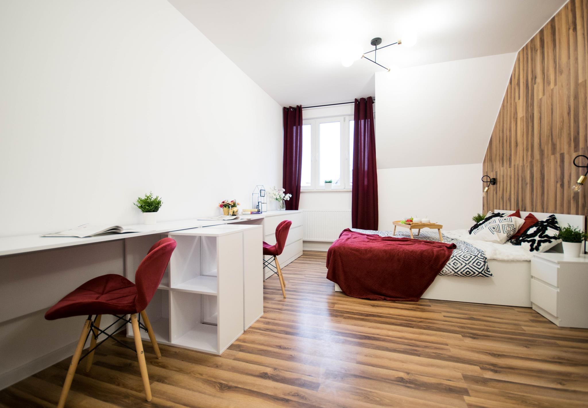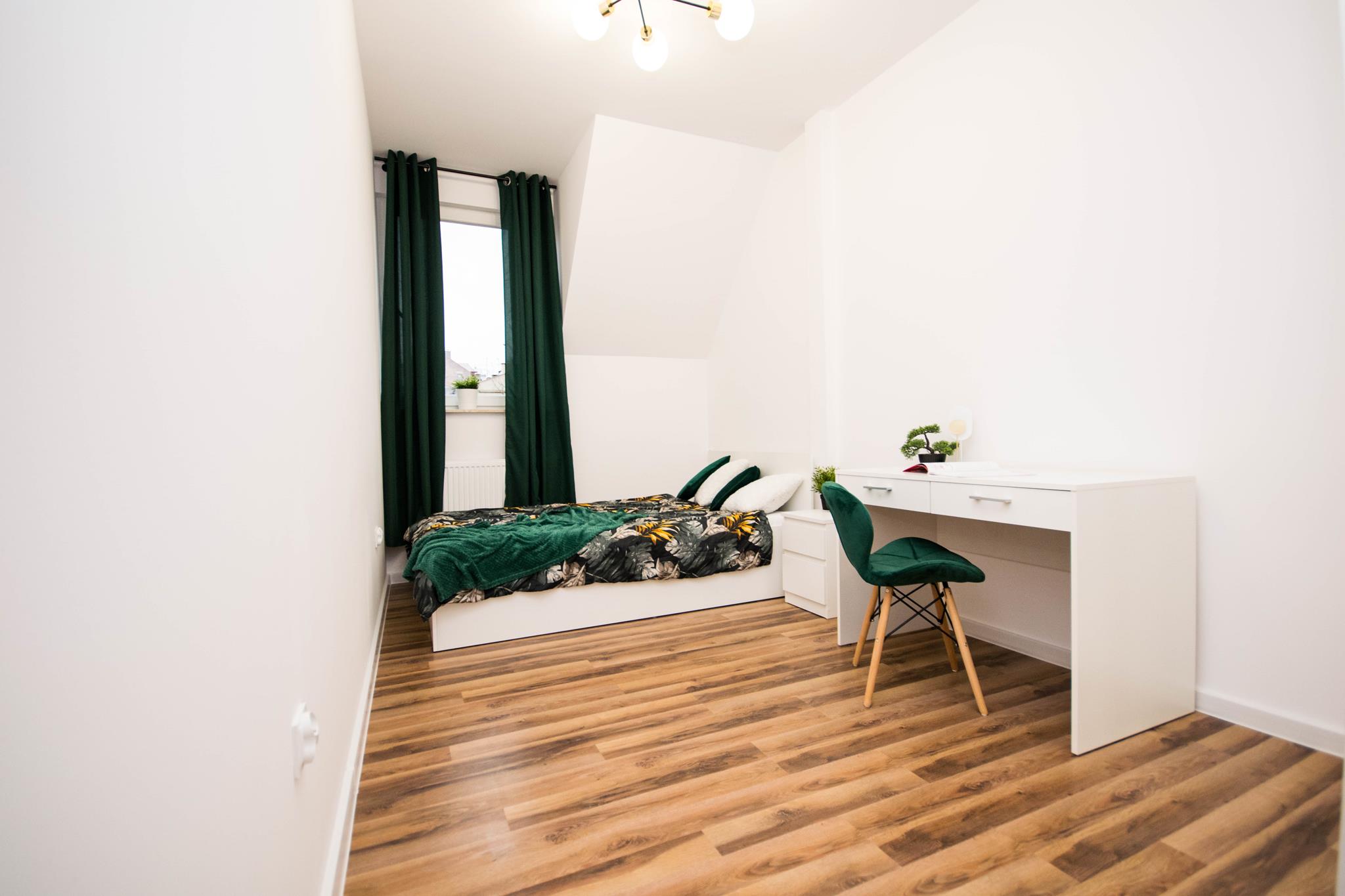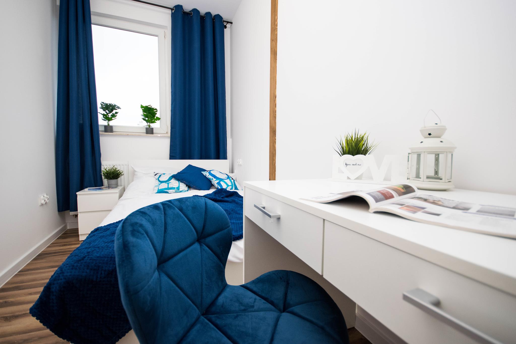 Trzy niezależne sypialnie z wygodnym łóżkiem z materacem, pojemną szafą z lustrami oraz biurkiem z krzesłem idealnym do pracy czy nauki.