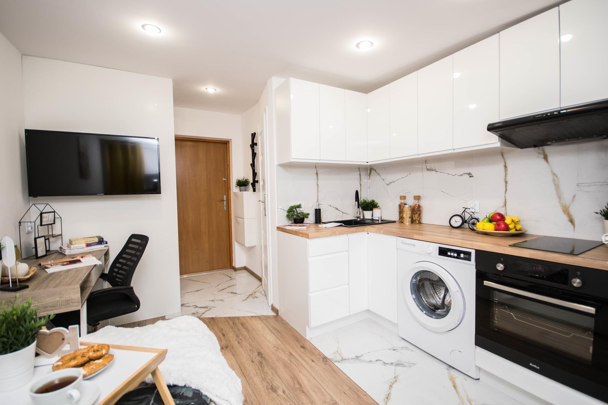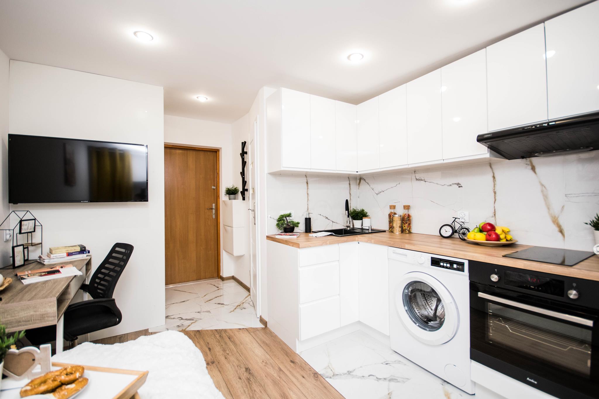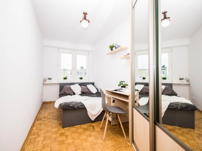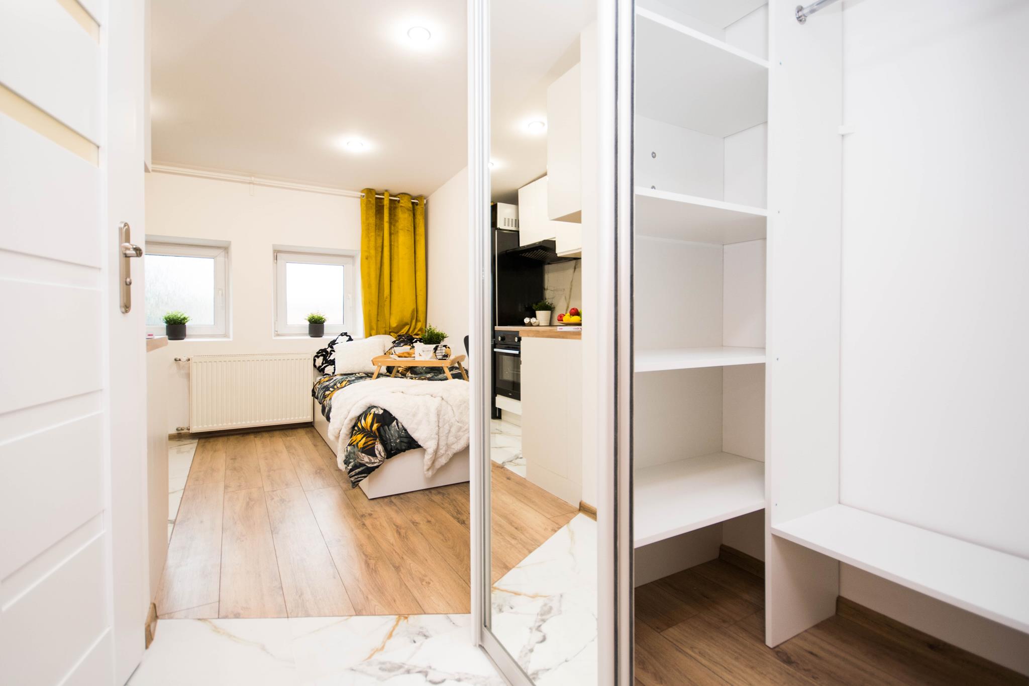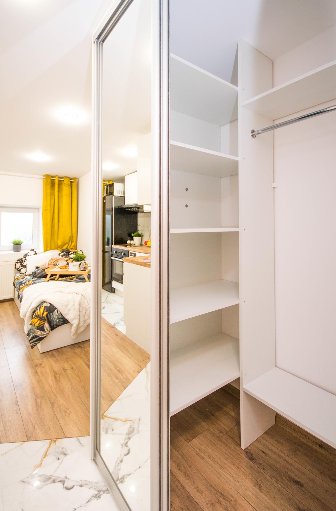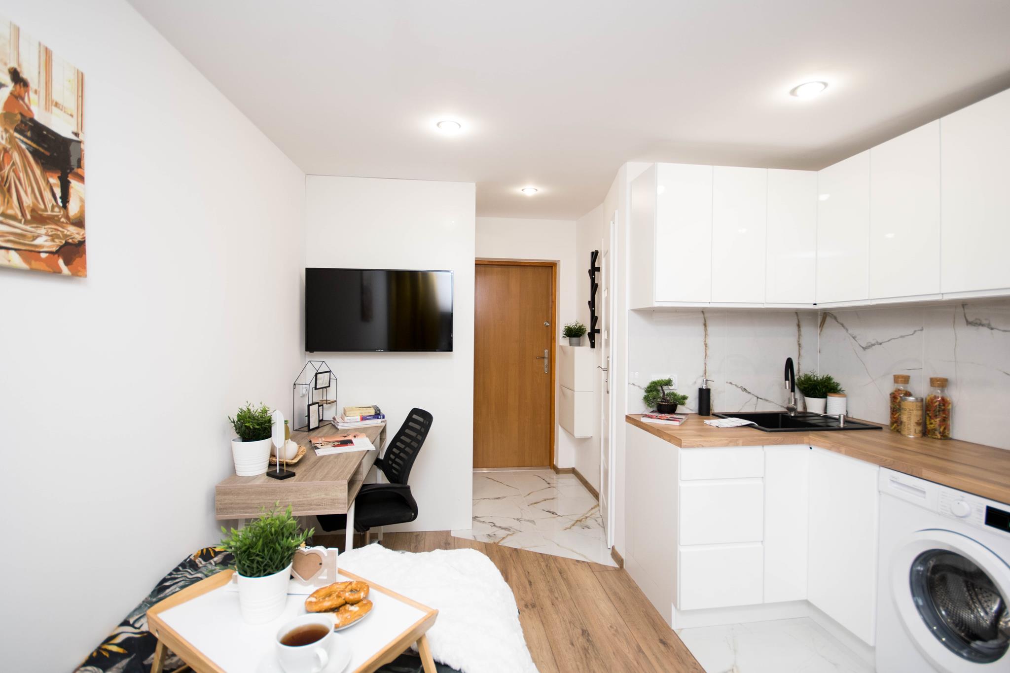 W mieszkaniu, przy wejściu znajduje się pojemna, zabudowana szafa z lustrem oraz szafka na buty. W dalszej części mieszkania salon wyposażony w duże, wygodne łóżko, biurko z krzesłem- do pracy lub nauki oraz TV. Aneks kuchenny wraz z pełnym wyposażeniem takim jak: