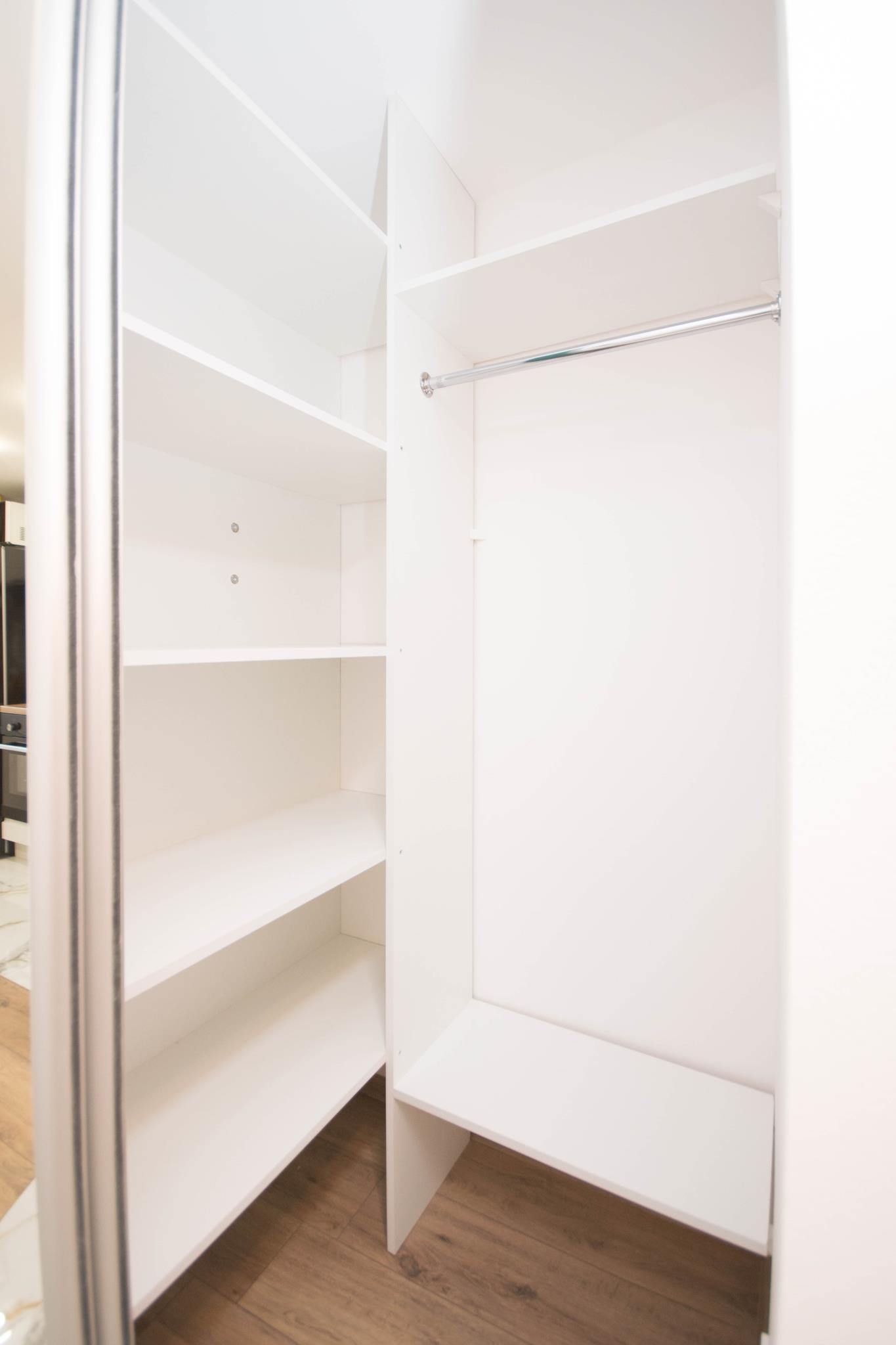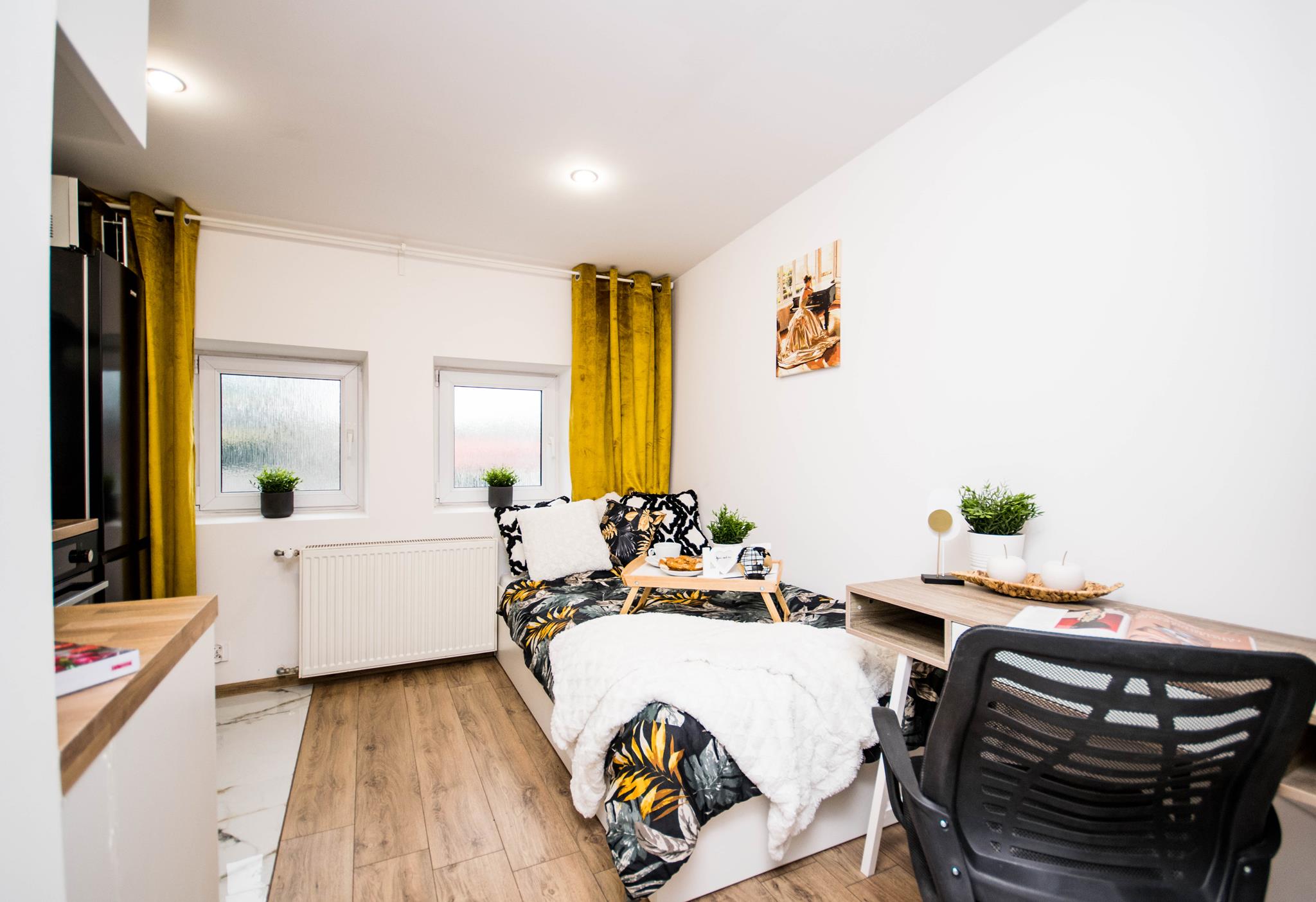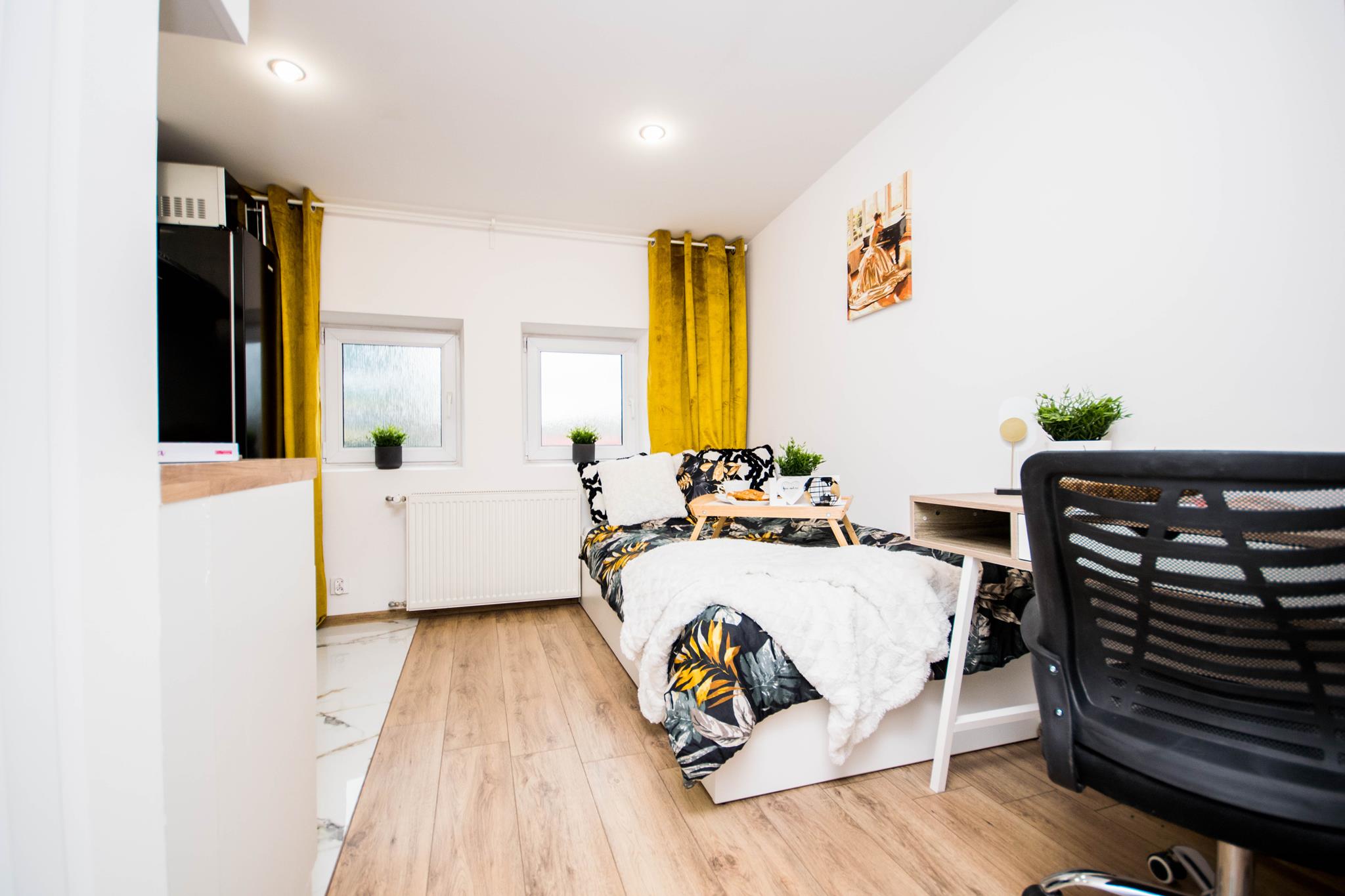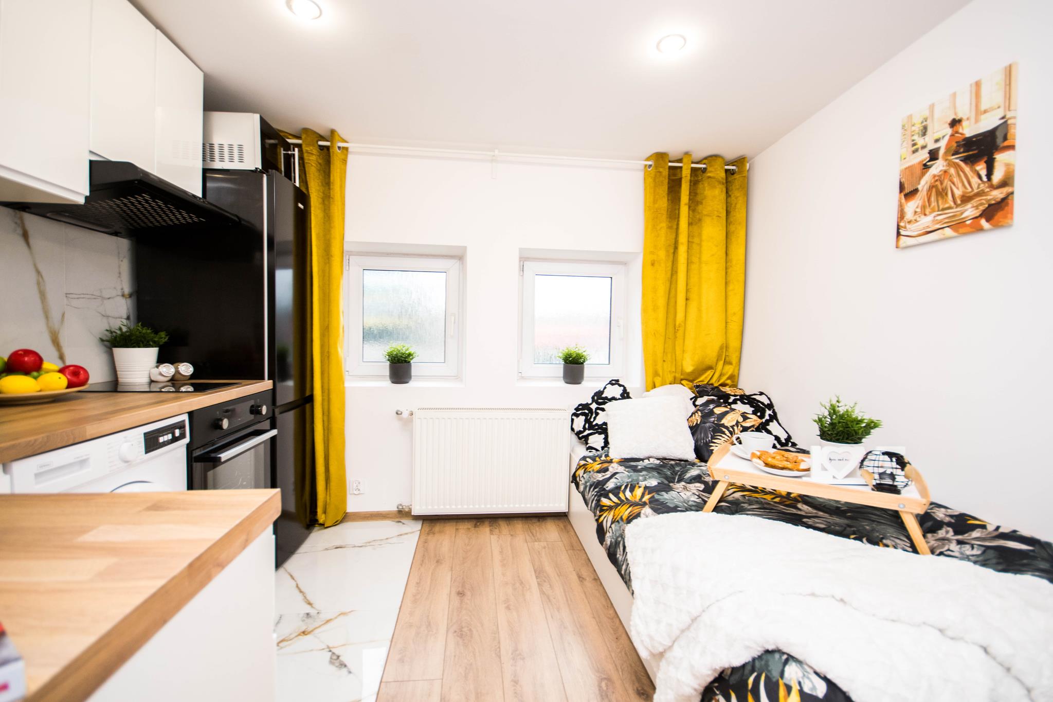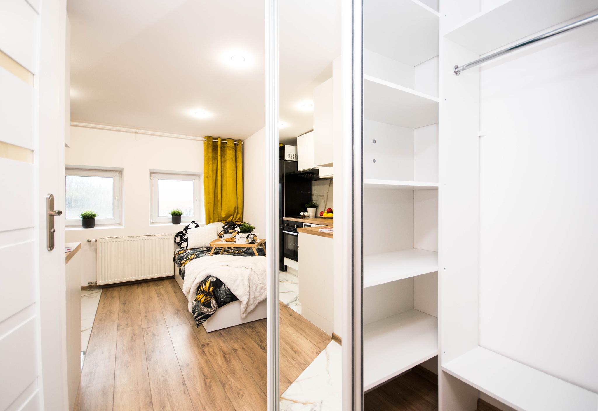 W mieszkaniu, przy wejściu znajduje się pojemna, zabudowana szafa z lustrem oraz szafka na buty. W dalszej części mieszkania salon wyposażony w duże, wygodne łóżko, biurko z krzesłem- do pracy lub nauki oraz TV. Aneks kuchenny wraz z pełnym wyposażeniem takim jak: