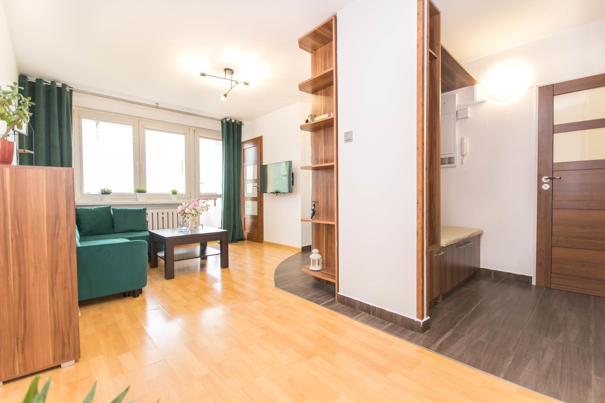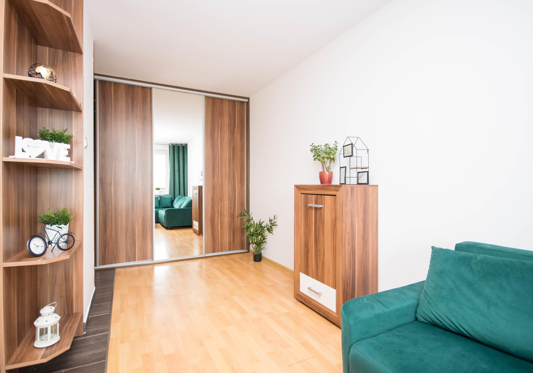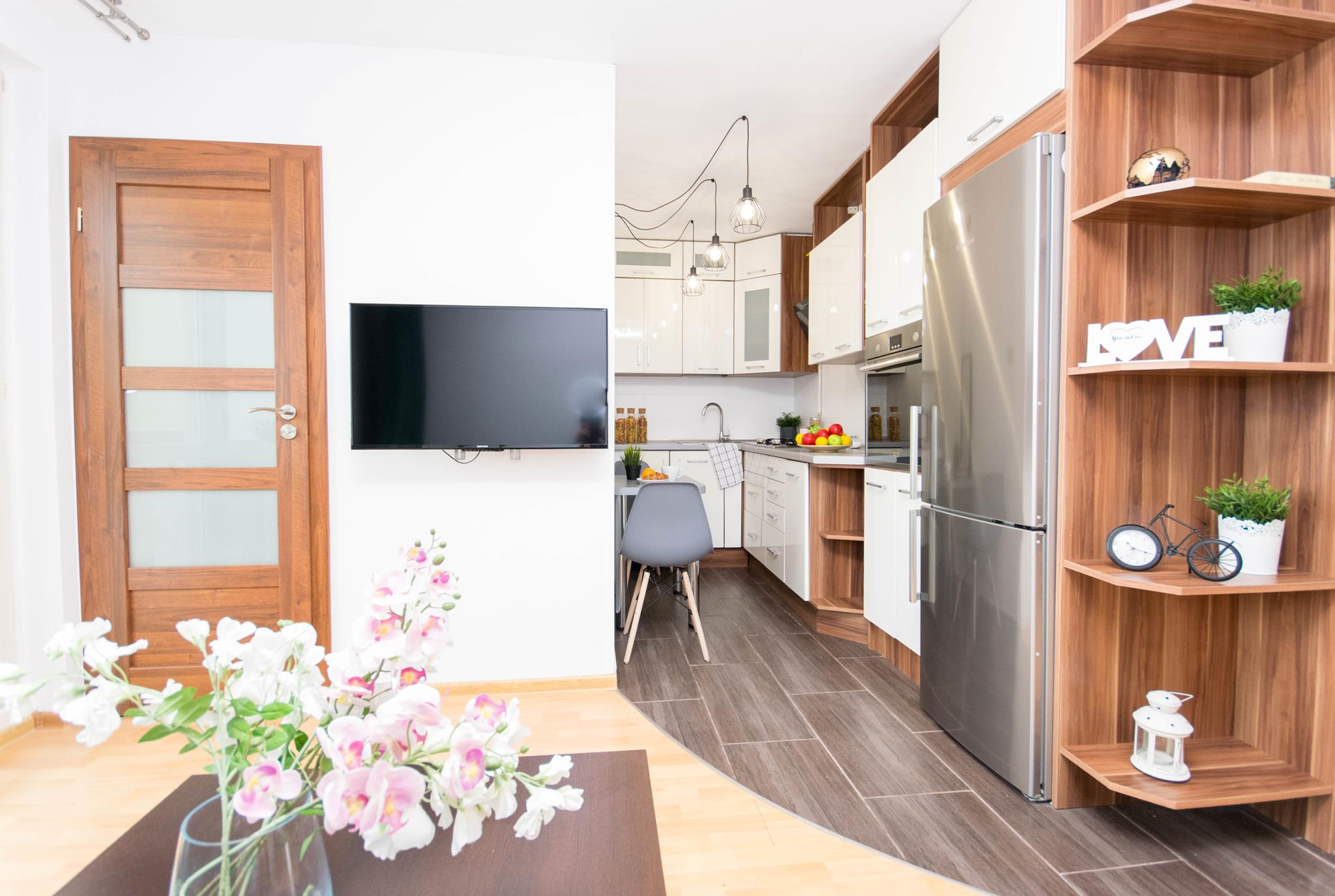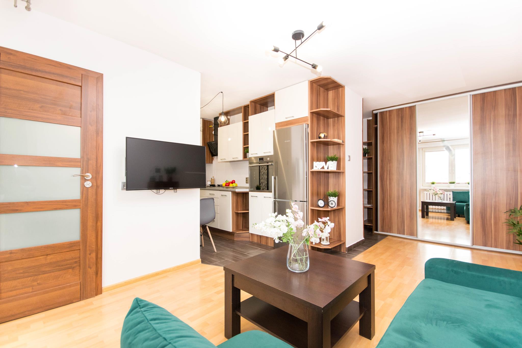 W mieszkaniu znajdziesz przedpokój z dużą szafą z lustrem. Przestronny salon z częścią wypoczynkową z rozkładaną sofą, stolikiem oraz oczywiście telewizorem ze smart TV. Kuchnia, w której znajdziesz wszystkie niezbędne sprzęty AGD, takie jak: