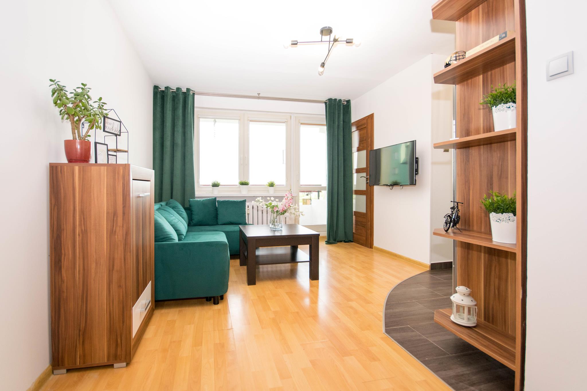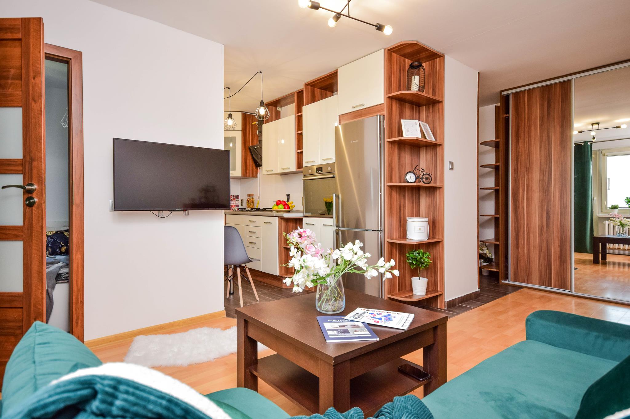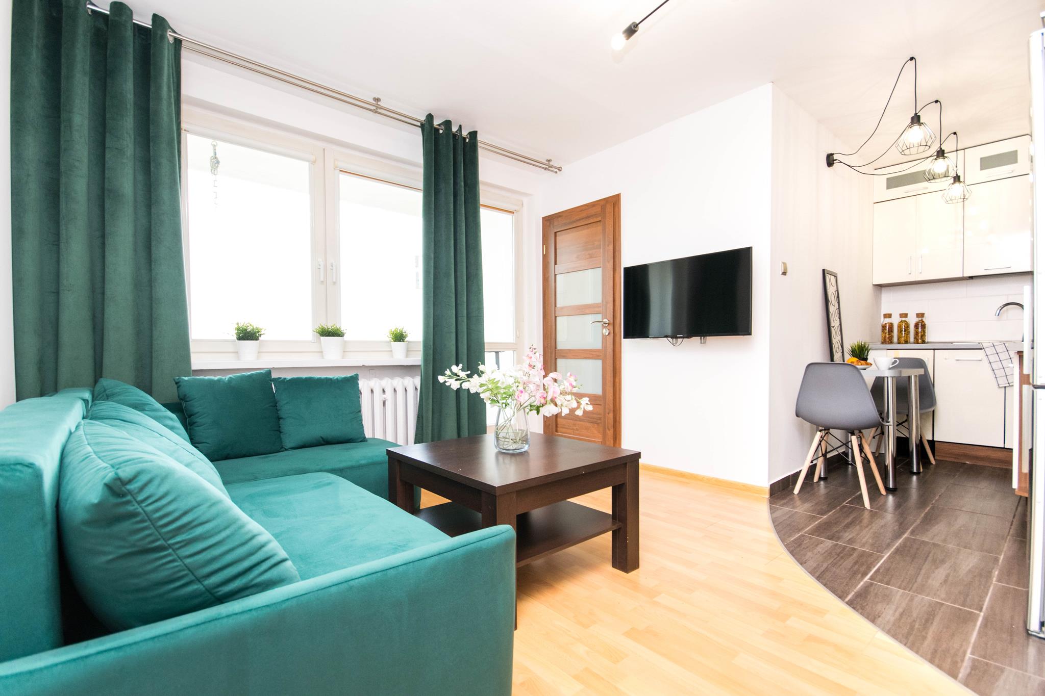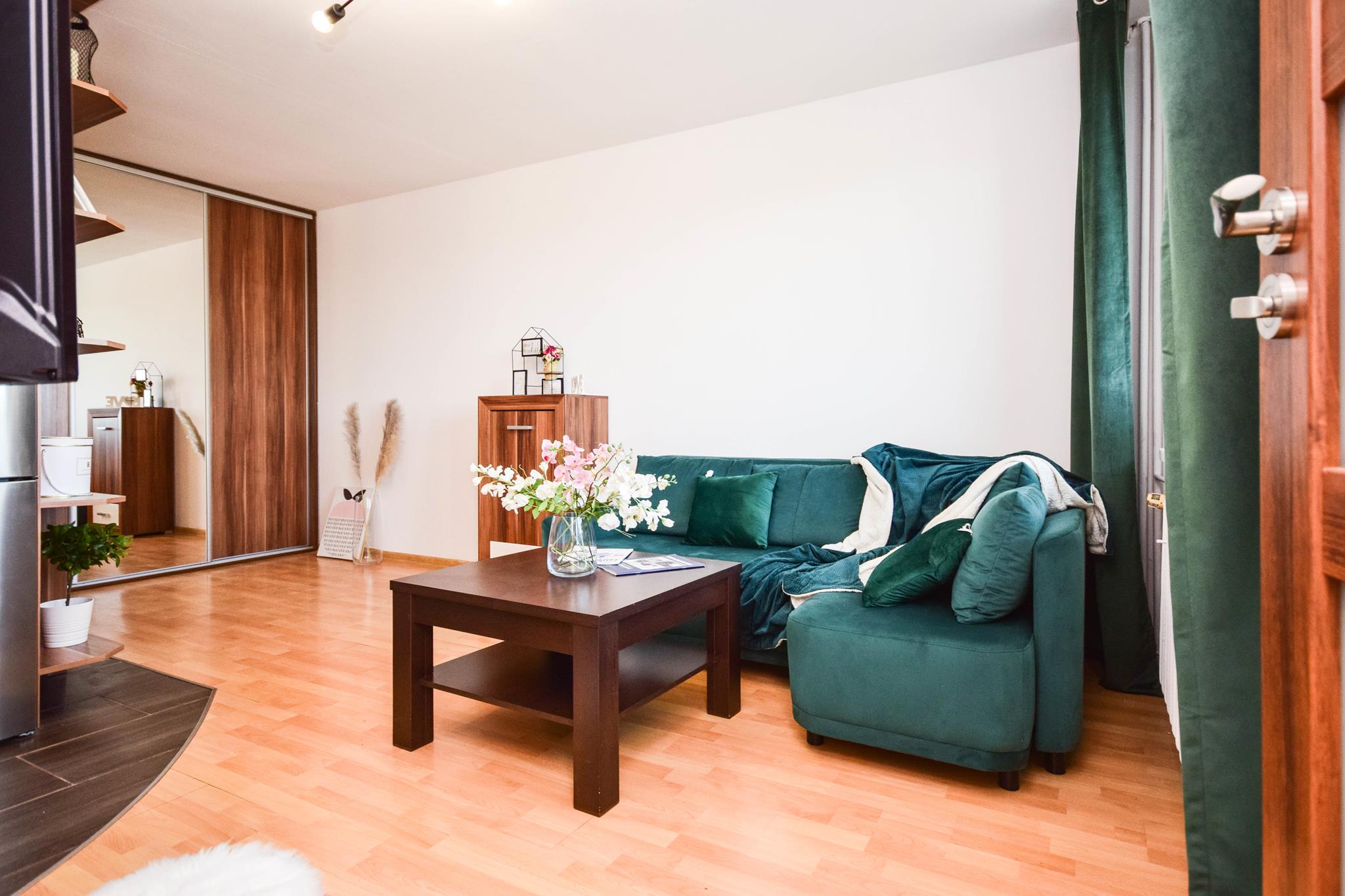 W mieszkaniu znajdziesz przedpokój z dużą szafą z lustrem. Przestronny salon z częścią wypoczynkową z rozkładaną sofą, stolikiem oraz oczywiście telewizorem ze smart TV. Kuchnia, w której znajdziesz wszystkie niezbędne sprzęty AGD, takie jak: