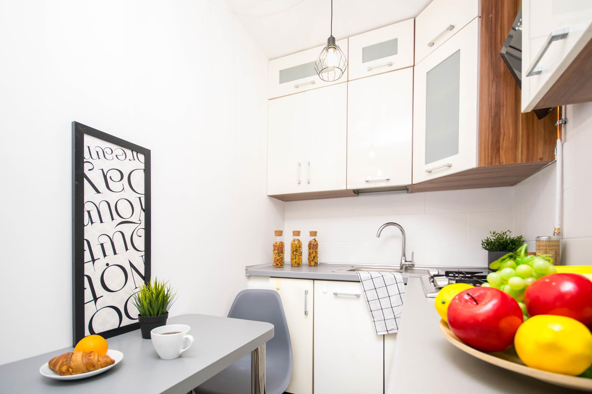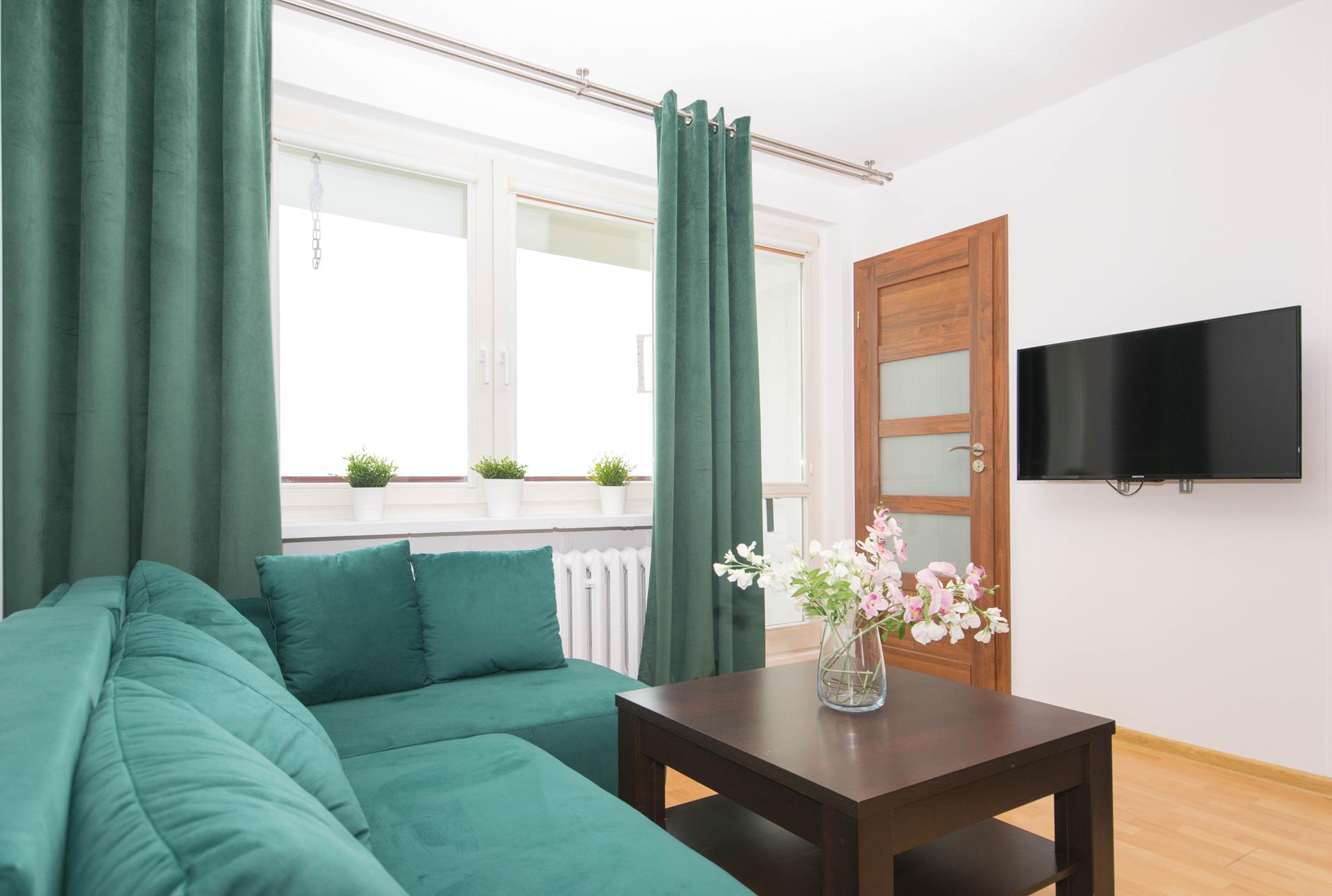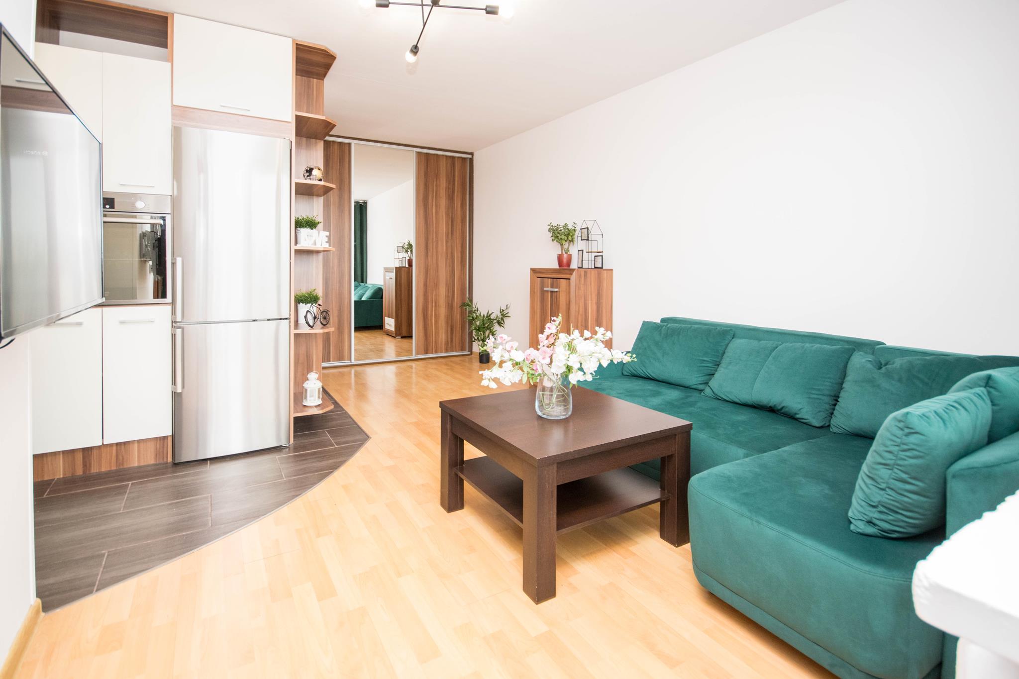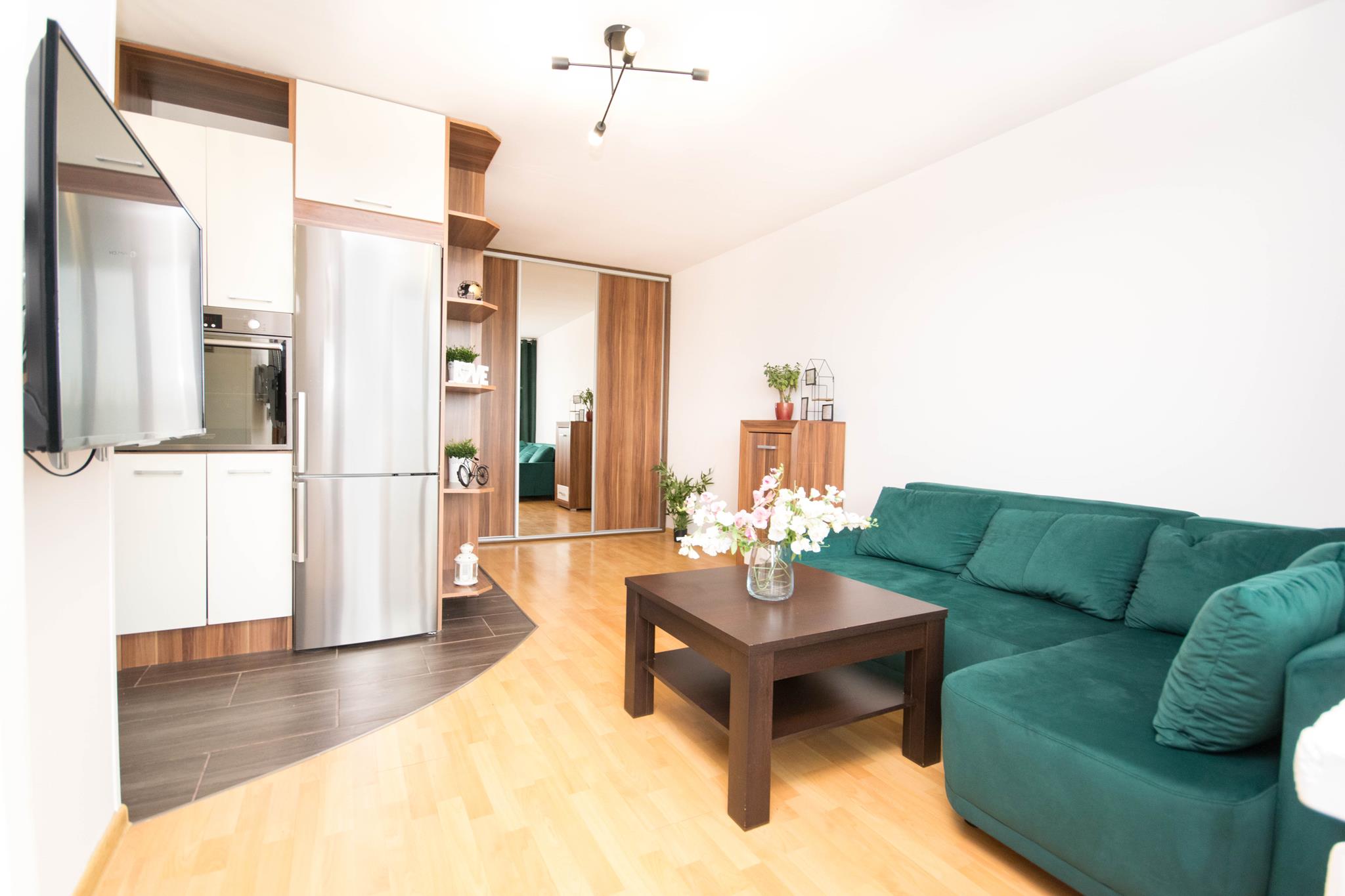 W mieszkaniu znajdziesz przedpokój z dużą szafą z lustrem. Przestronny salon z częścią wypoczynkową z rozkładaną sofą, stolikiem oraz oczywiście telewizorem ze smart TV. Kuchnia, w której znajdziesz wszystkie niezbędne sprzęty AGD, takie jak: