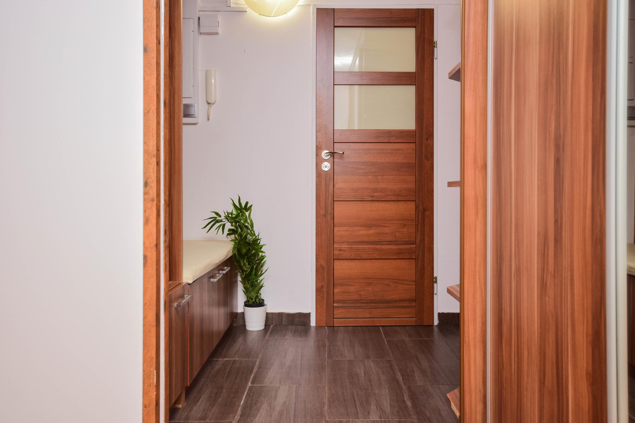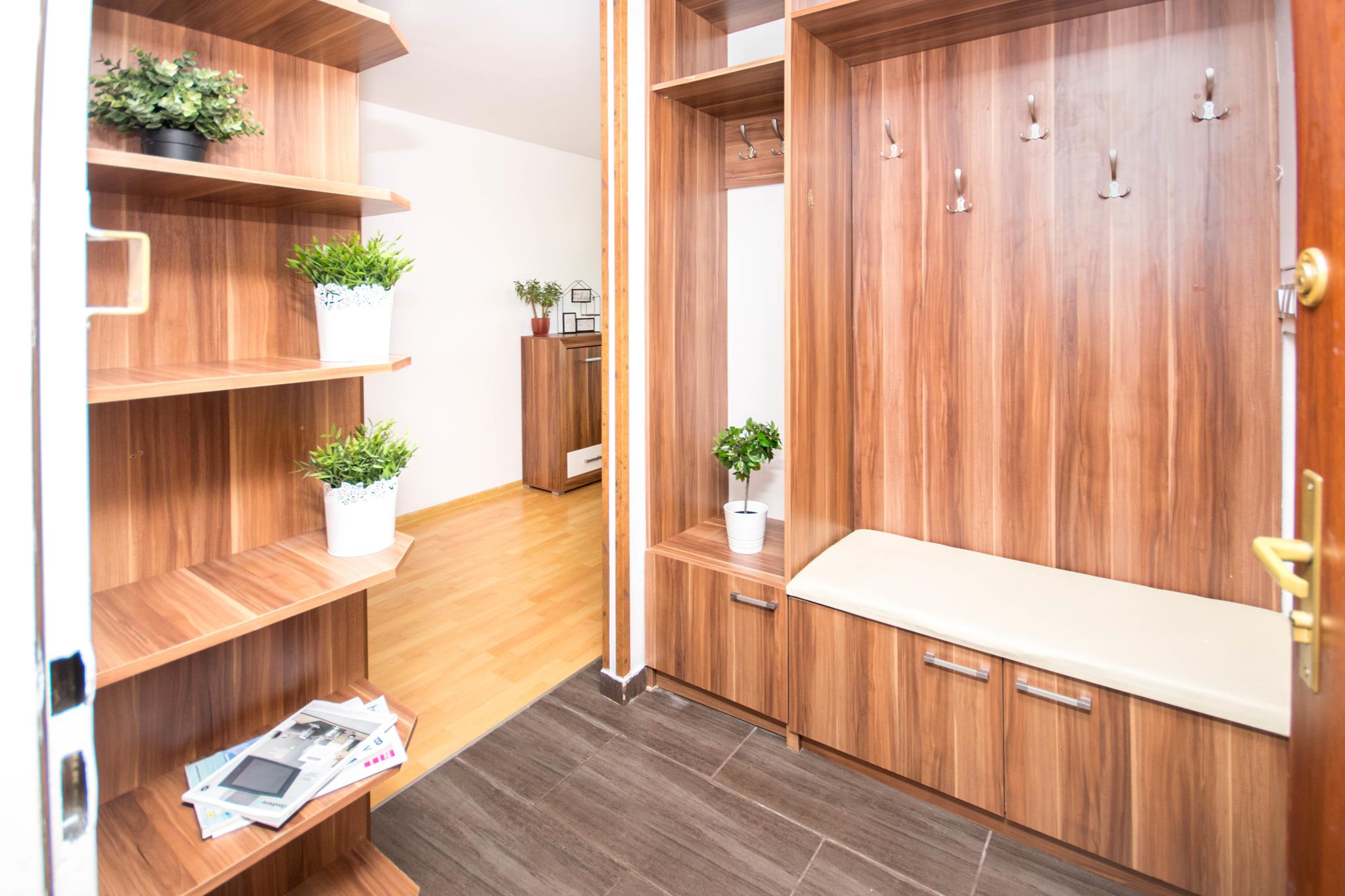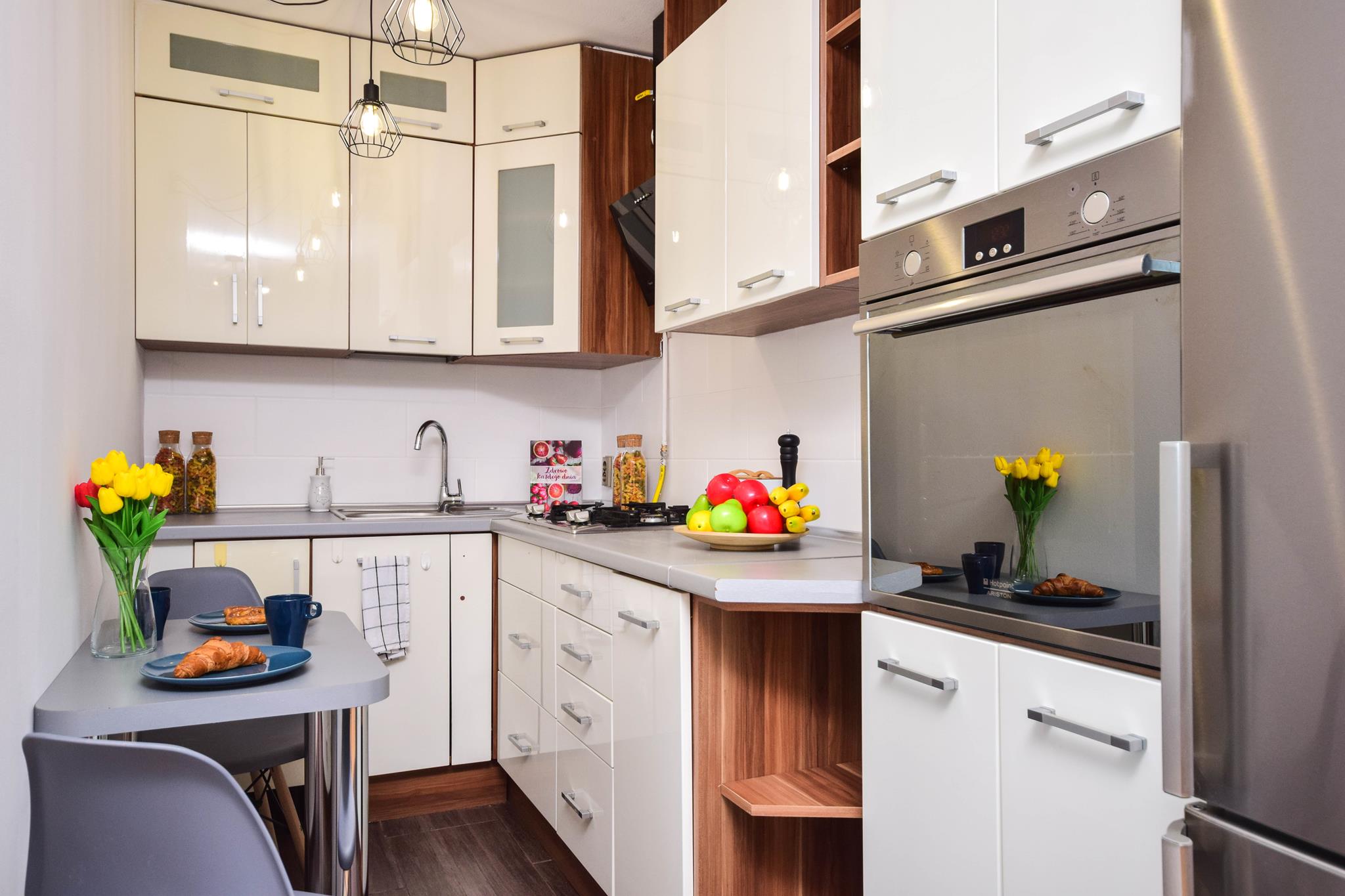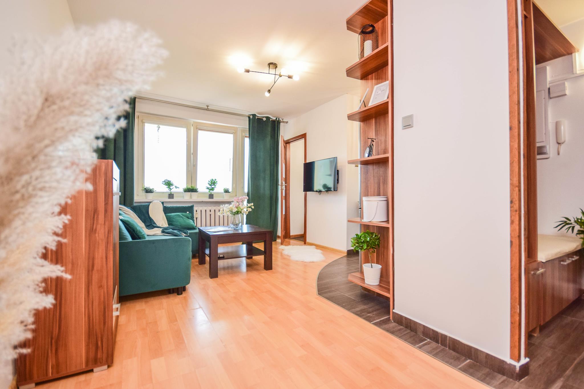W mieszkaniu znajdziesz przedpokój z dużą szafą z lustrem. Przestronny salon z częścią wypoczynkową z rozkładaną sofą, stolikiem oraz oczywiście telewizorem ze smart TV. Kuchnia, w której znajdziesz wszystkie niezbędne sprzęty AGD, takie jak: