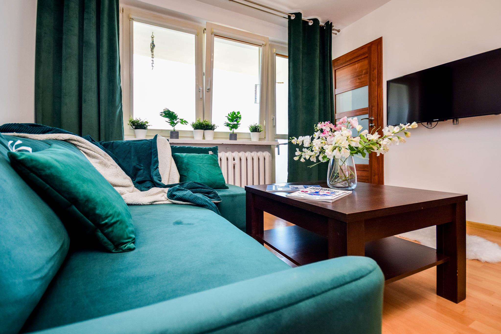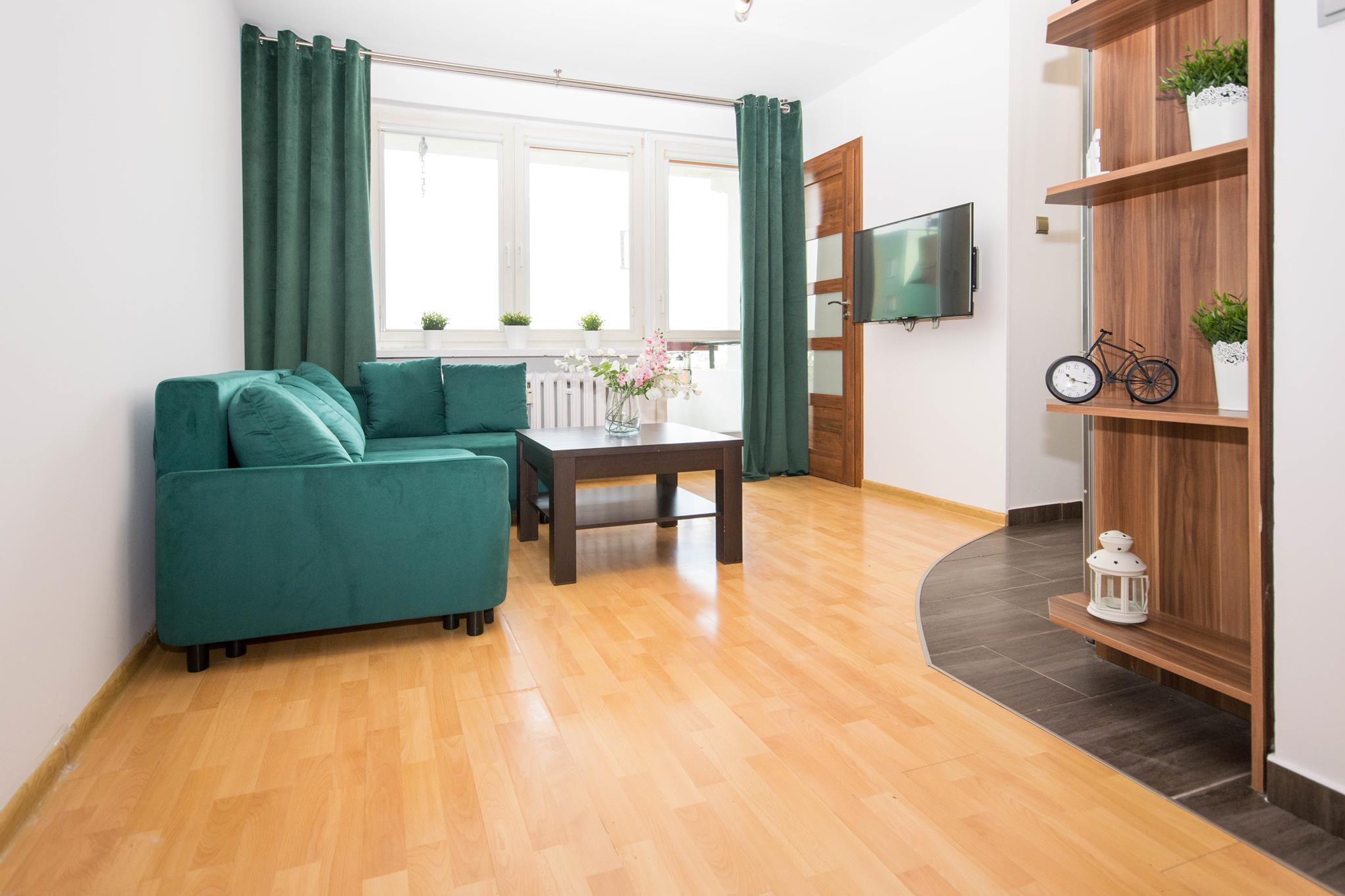 ☀️ Przestronny salon z bardzo wygodną, dużą rozkładaną sofą, stolikiem oraz TV z funkcją Smart