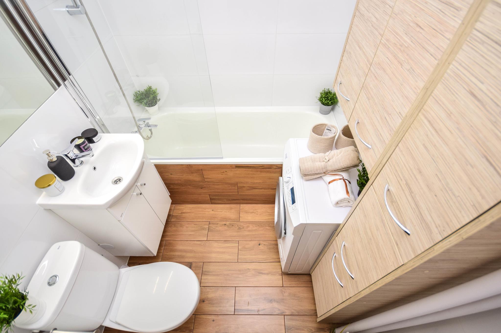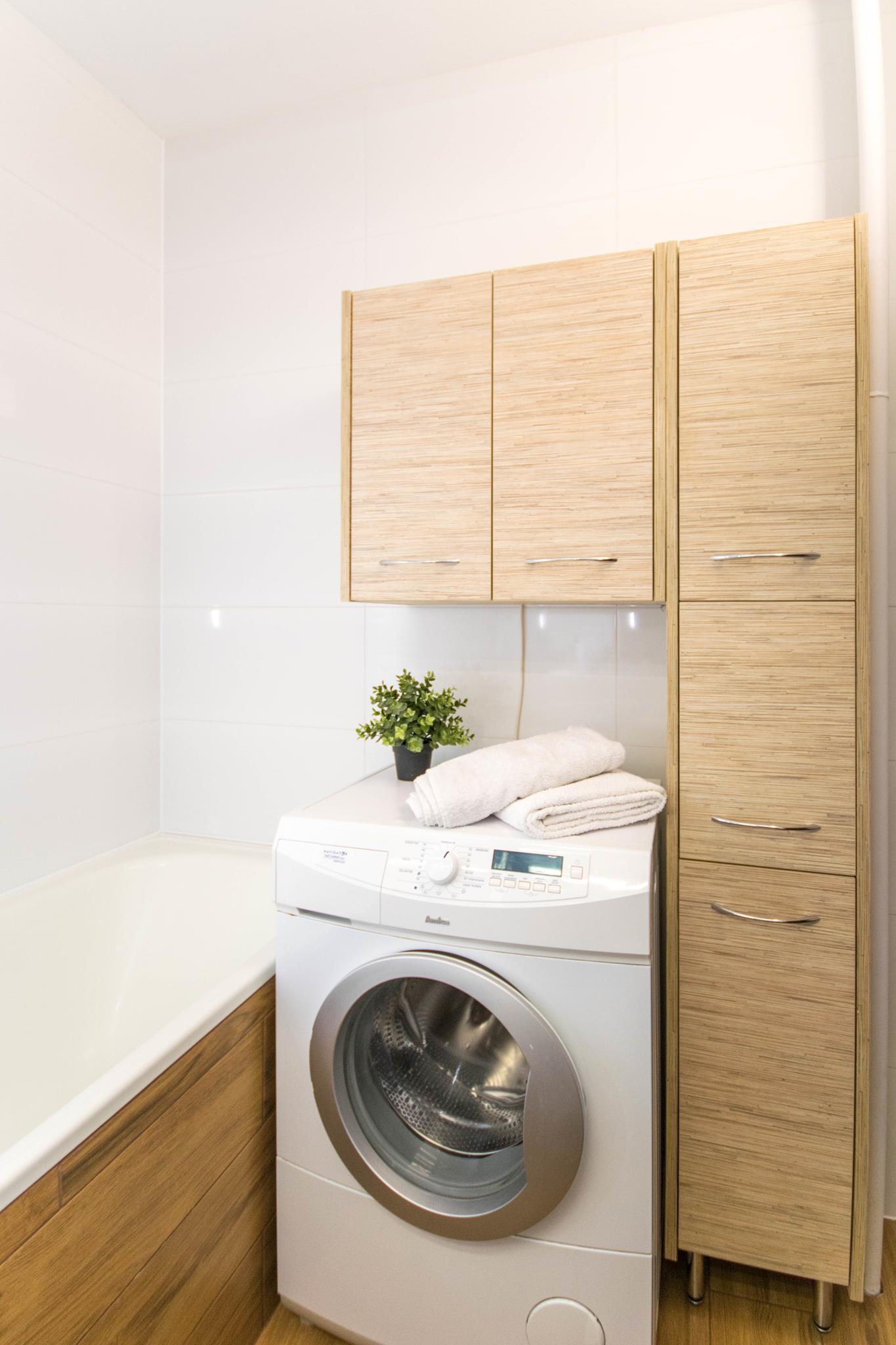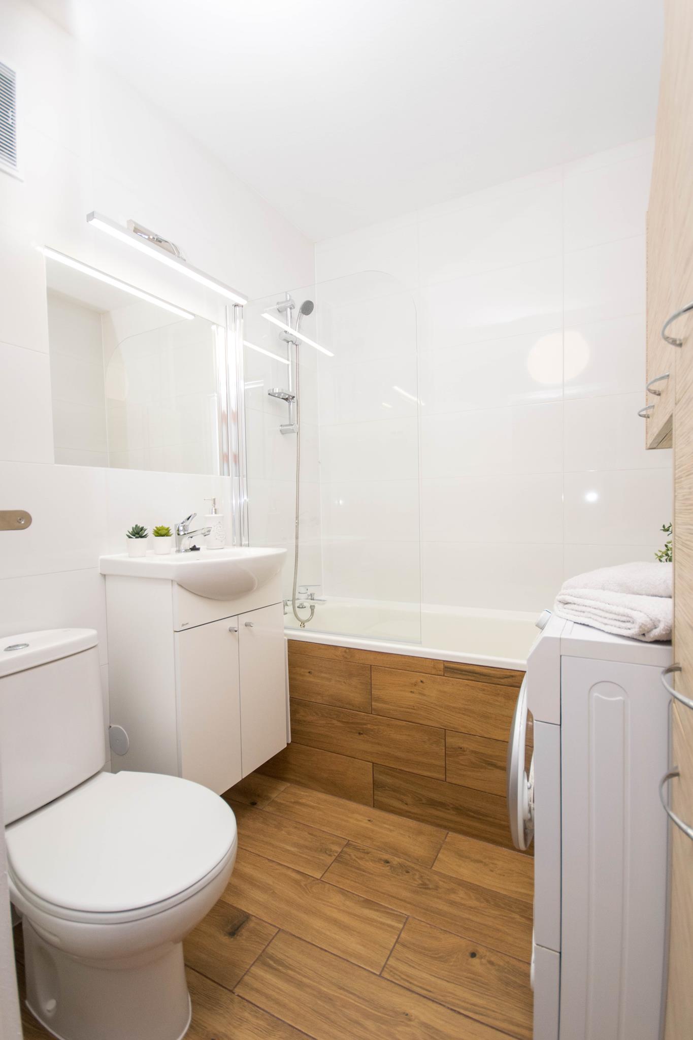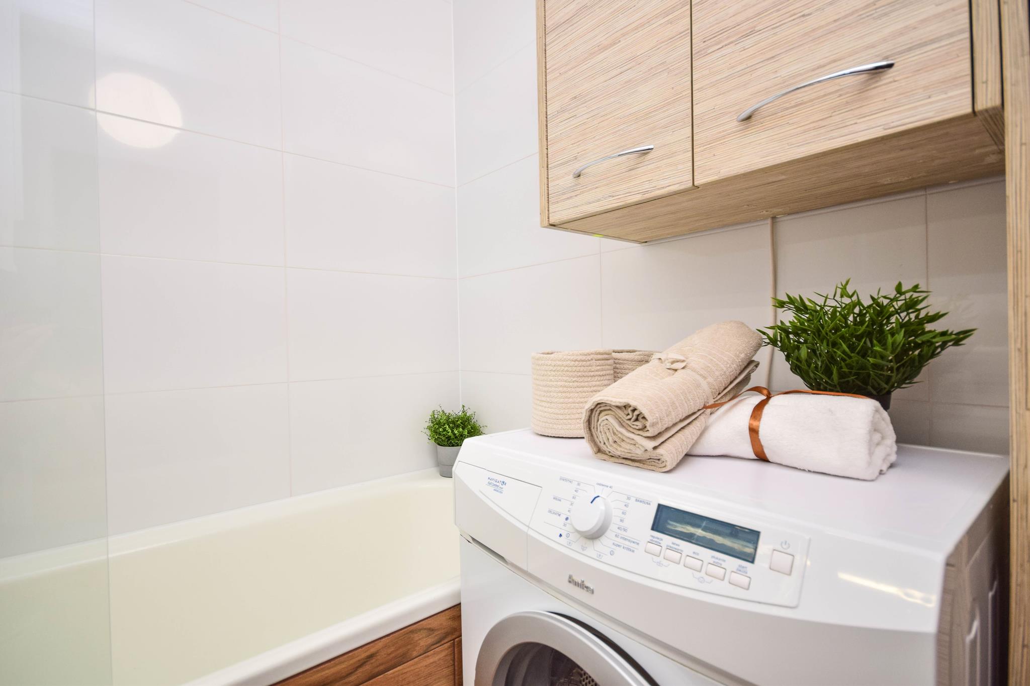 🛁 Łazienka z wanną z wbudowanym parawanem nawannowym oraz pralką