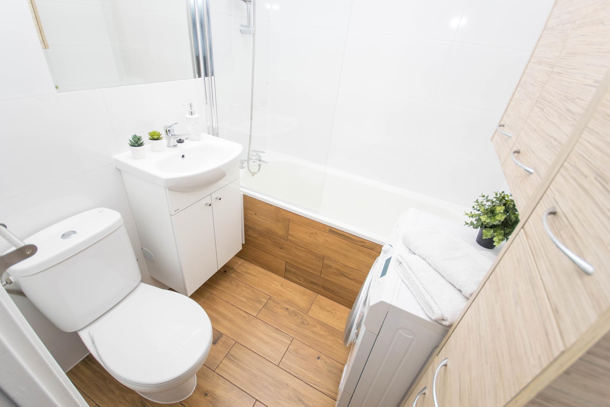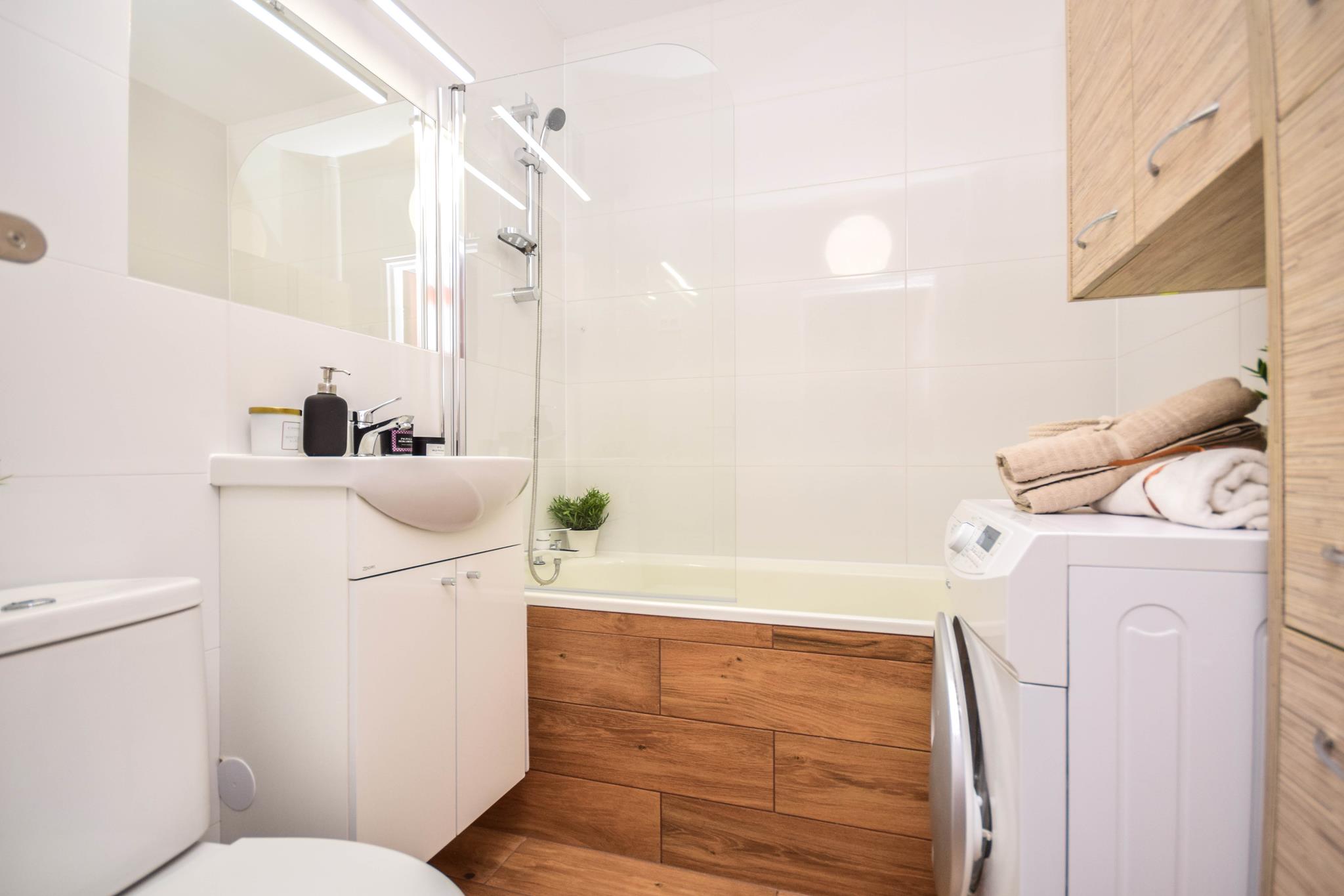 Łazienka z wanną, pralką, nowoczesną umywalką z lustrem oraz dużą ilością miejsca do przechowywania.