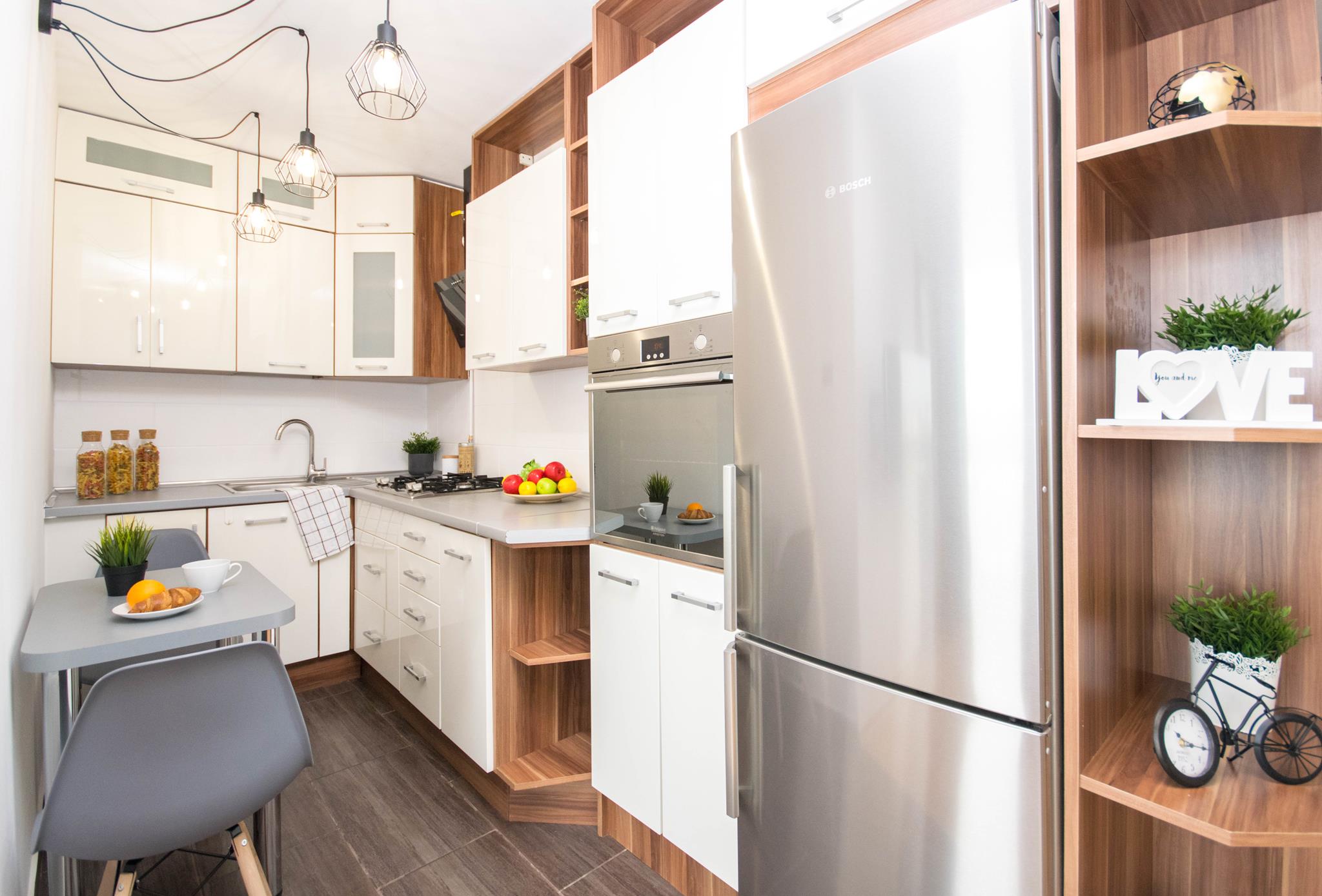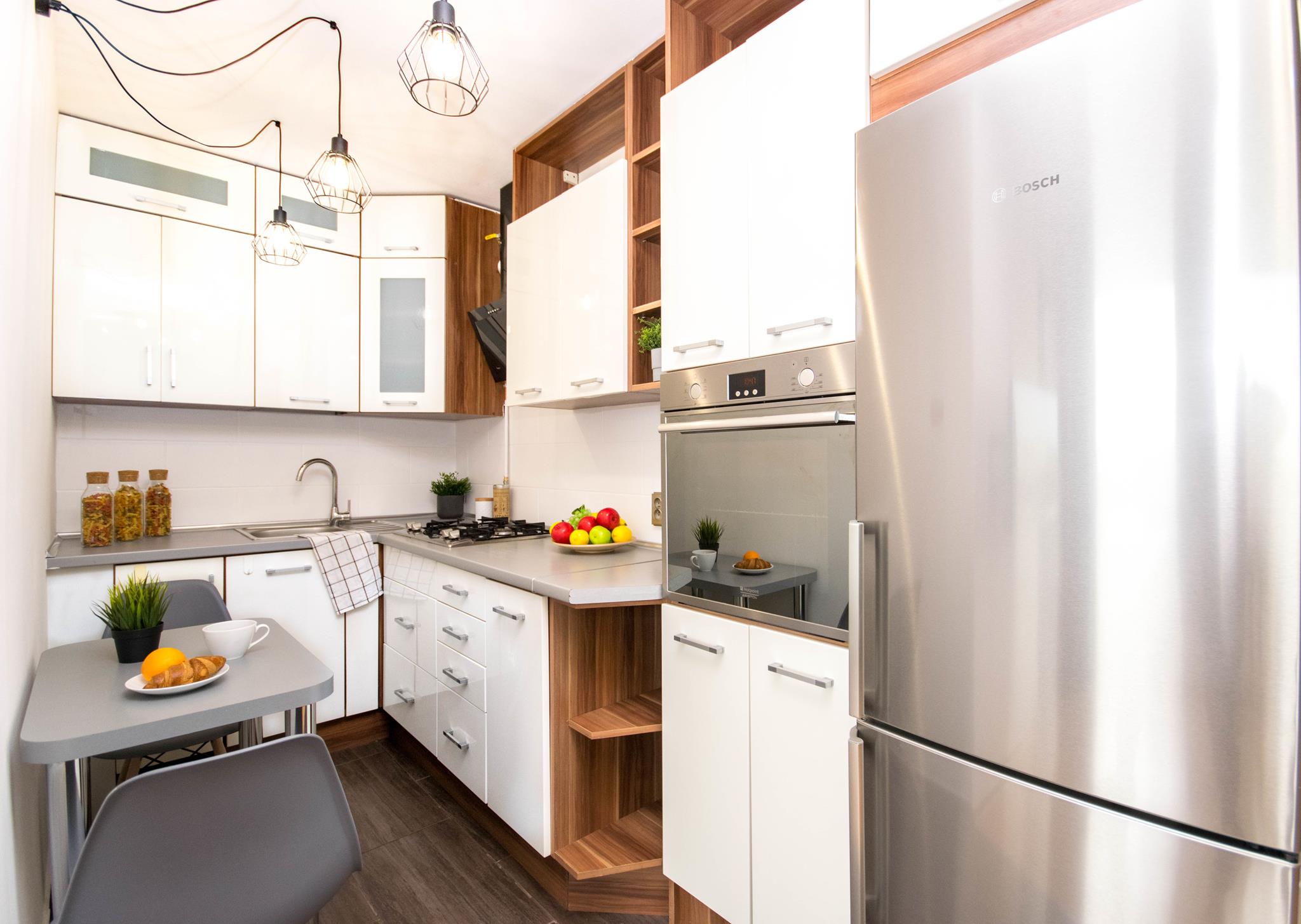 🍳 Kuchnia z lodówko-zamrażarką, piekarnikiem, mikrofalówką i stolikiem z krzesłami