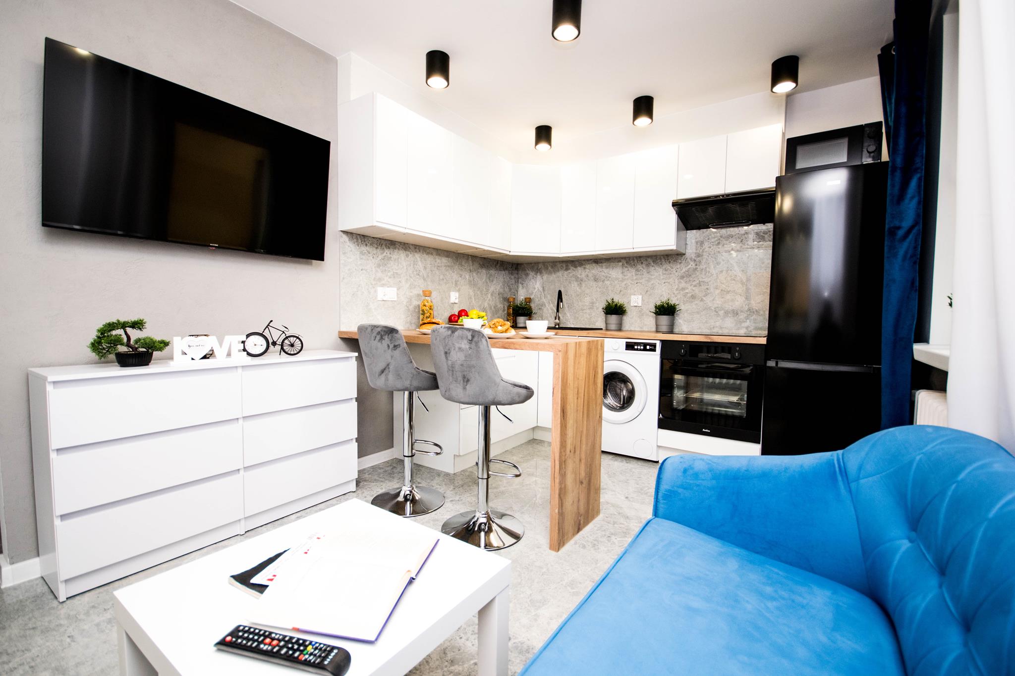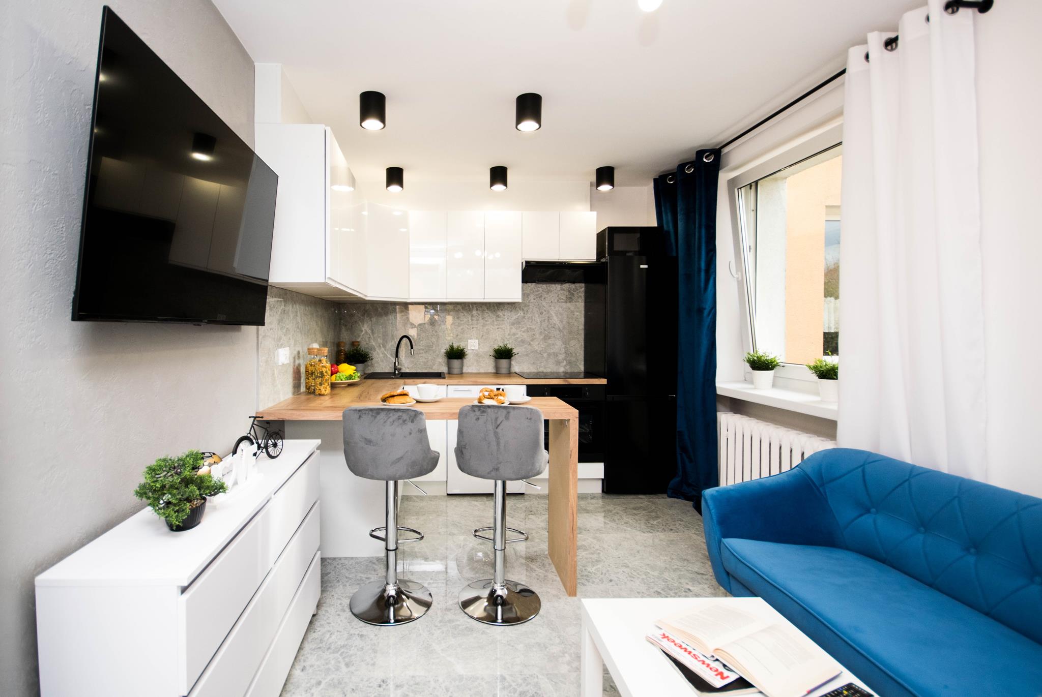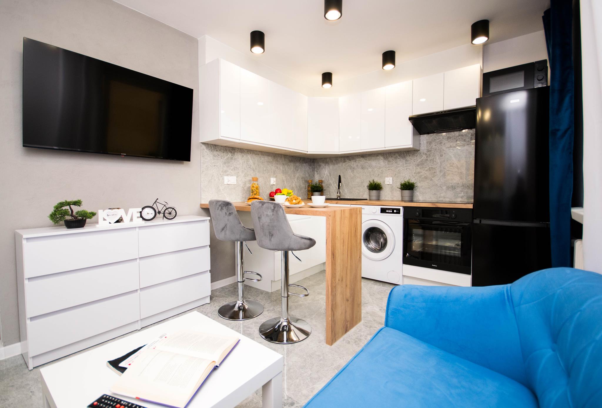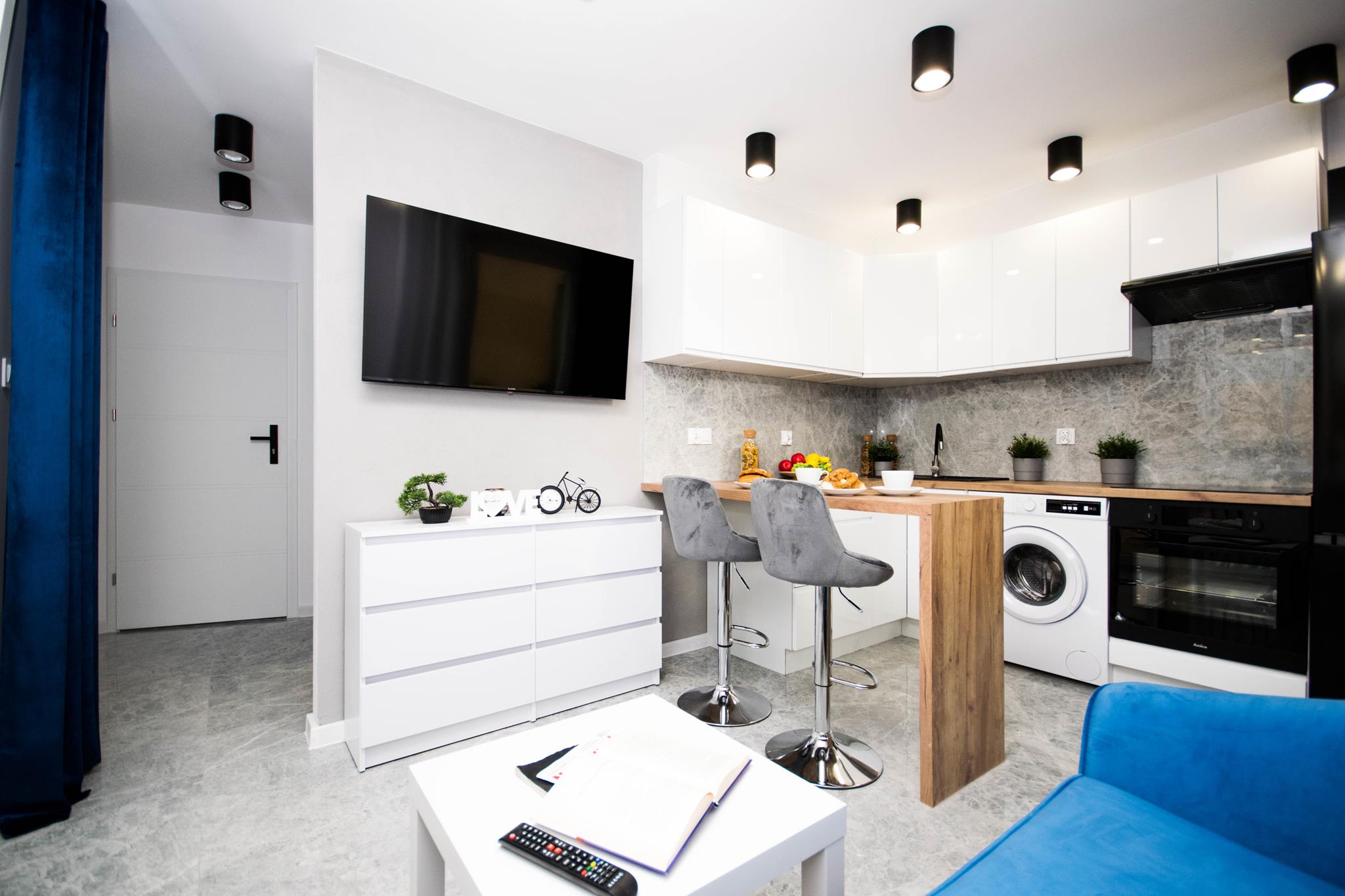 Nowoczesny salon z częścią wypoczynkową z sofą oraz stolikiem, pojemną komodą oraz oczywiście telewizorem ze smart TV. Przestronna kuchnia, w której znajdziesz wszystkie niezbędne sprzęty AGD, takie jak: