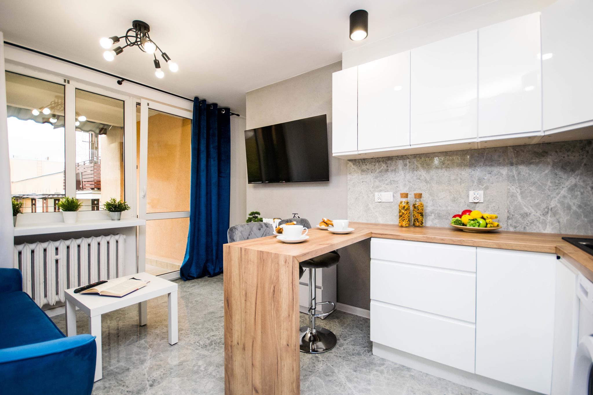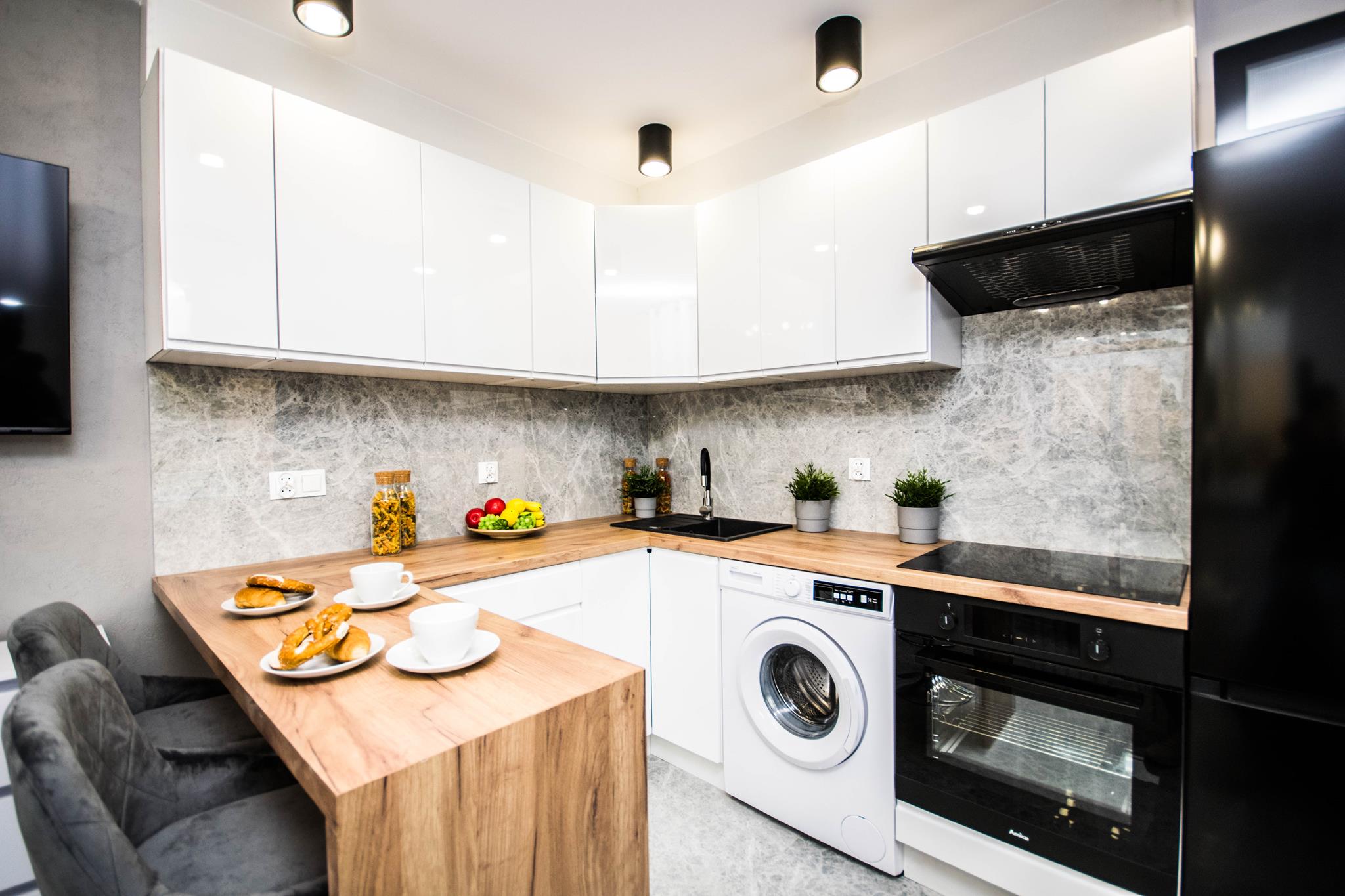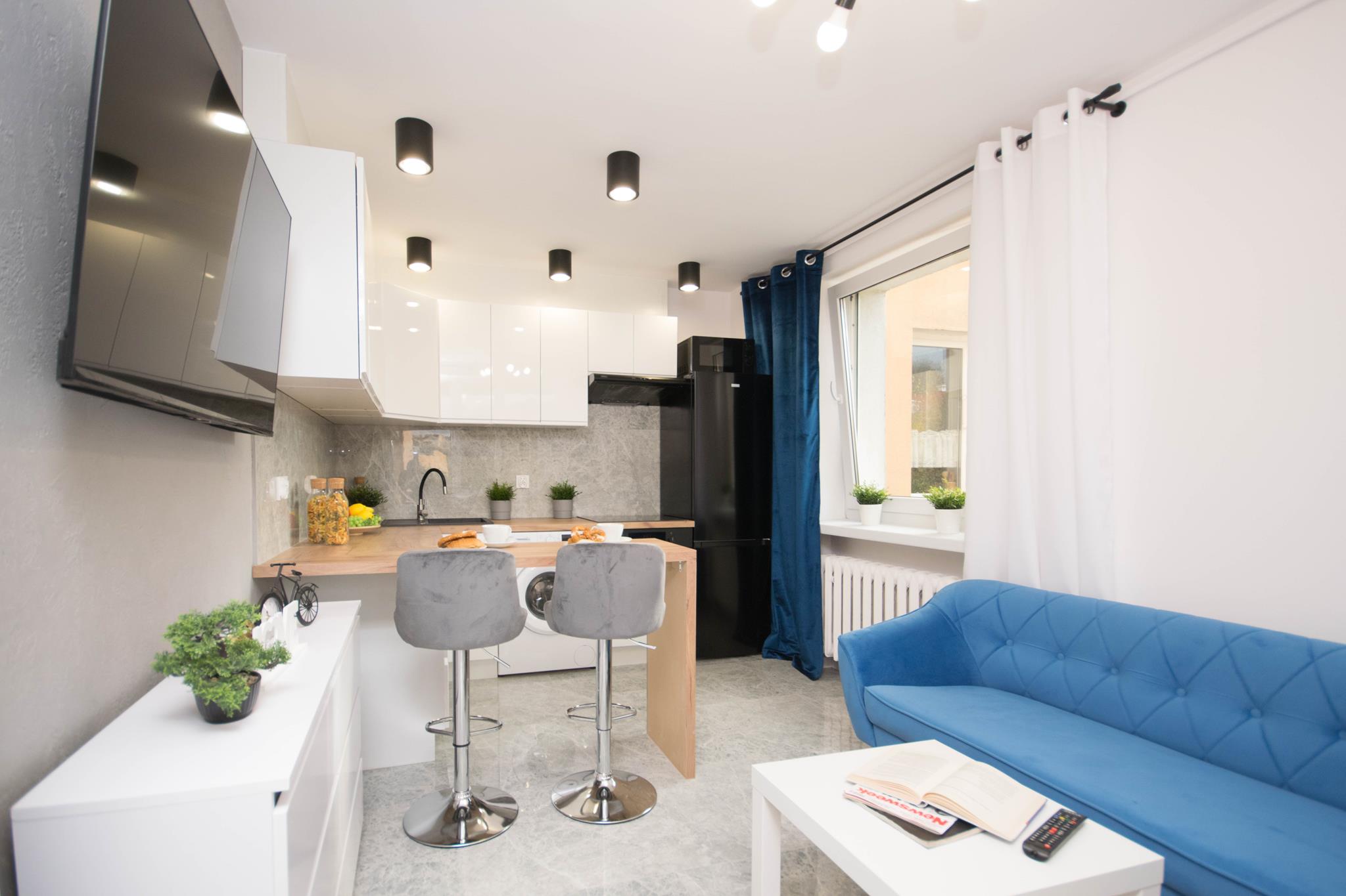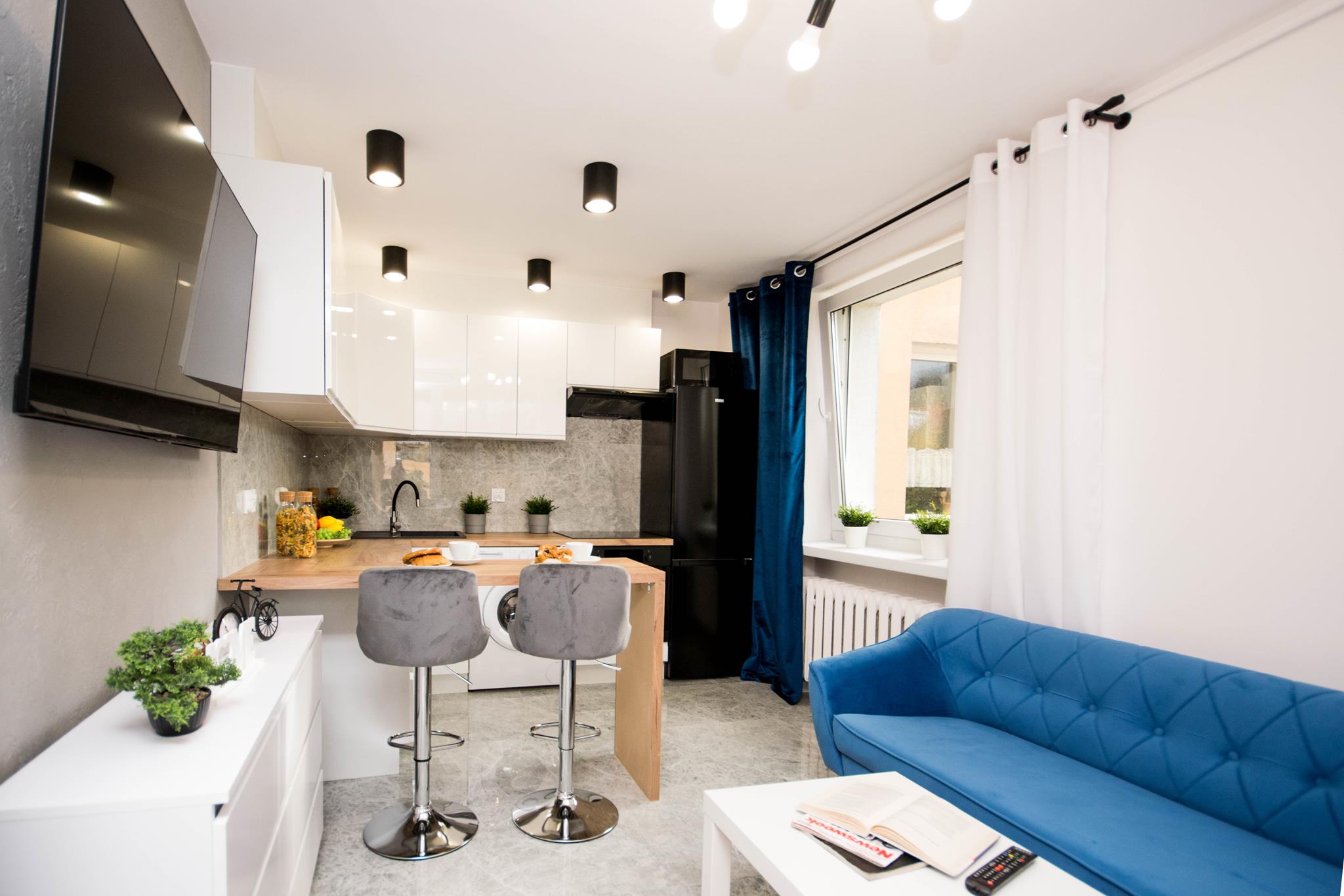 Nowoczesny salon z częścią wypoczynkową z sofą oraz stolikiem, pojemną komodą oraz oczywiście telewizorem ze smart TV. Przestronna kuchnia, w której znajdziesz wszystkie niezbędne sprzęty AGD, takie jak: