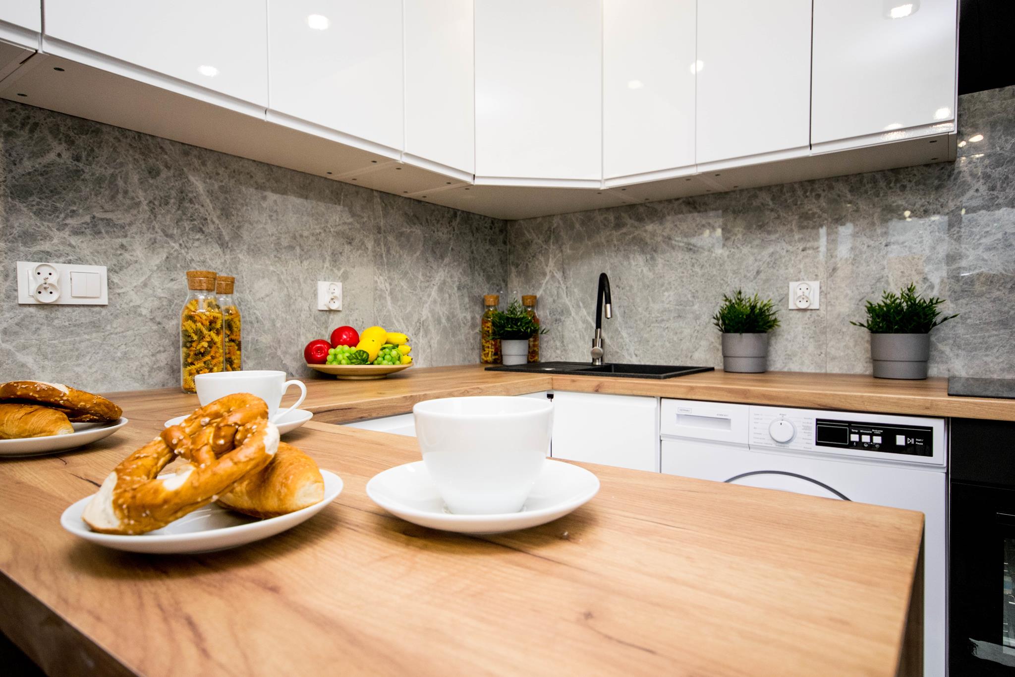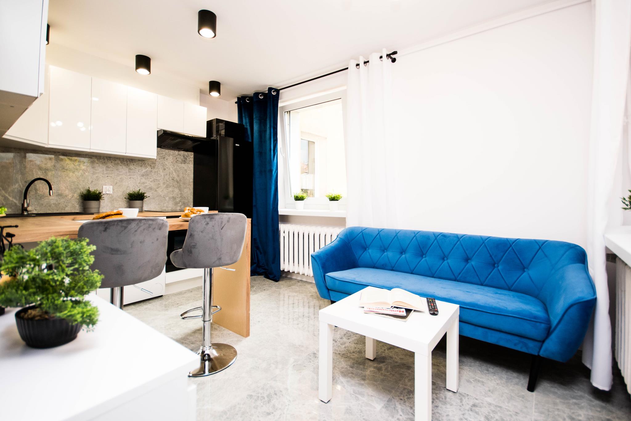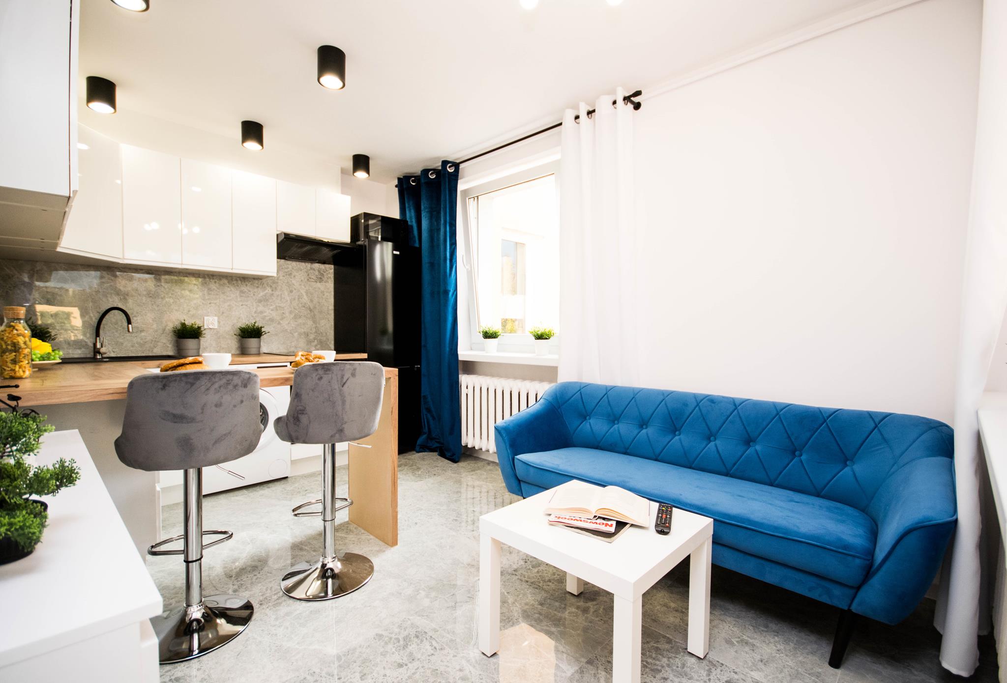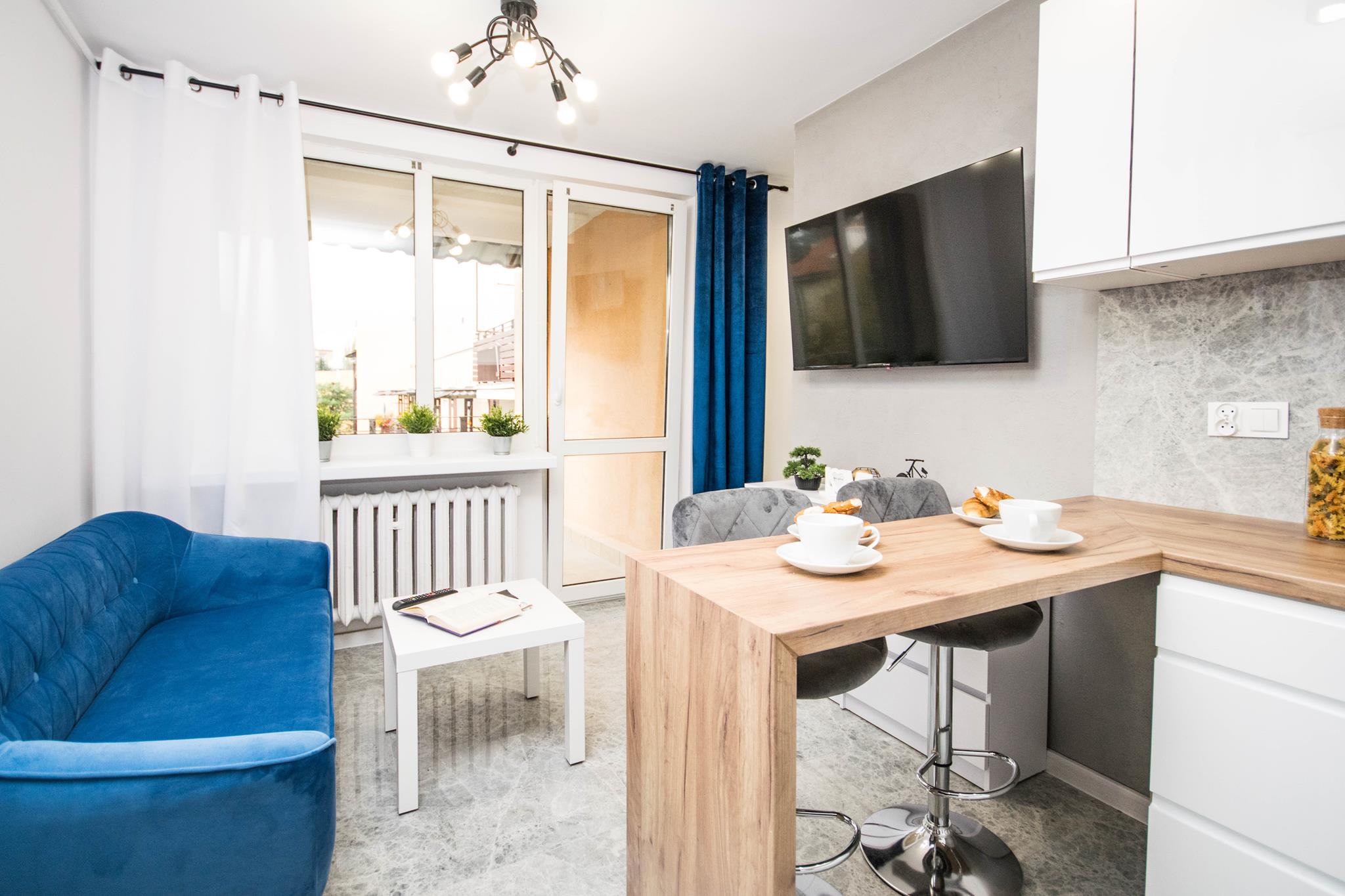 Nowoczesny salon z częścią wypoczynkową z sofą oraz stolikiem, pojemną komodą oraz oczywiście telewizorem ze smart TV. Przestronna kuchnia, w której znajdziesz wszystkie niezbędne sprzęty AGD, takie jak: