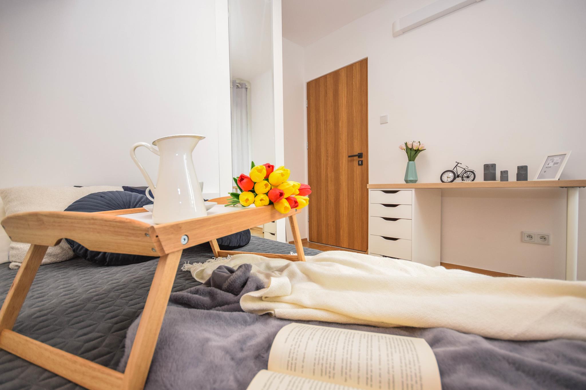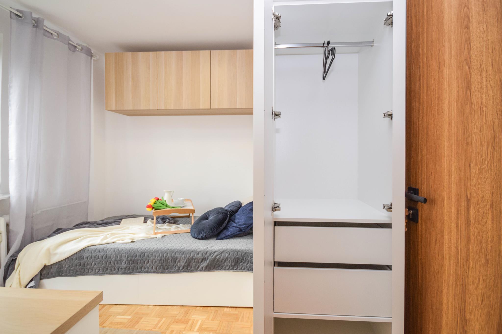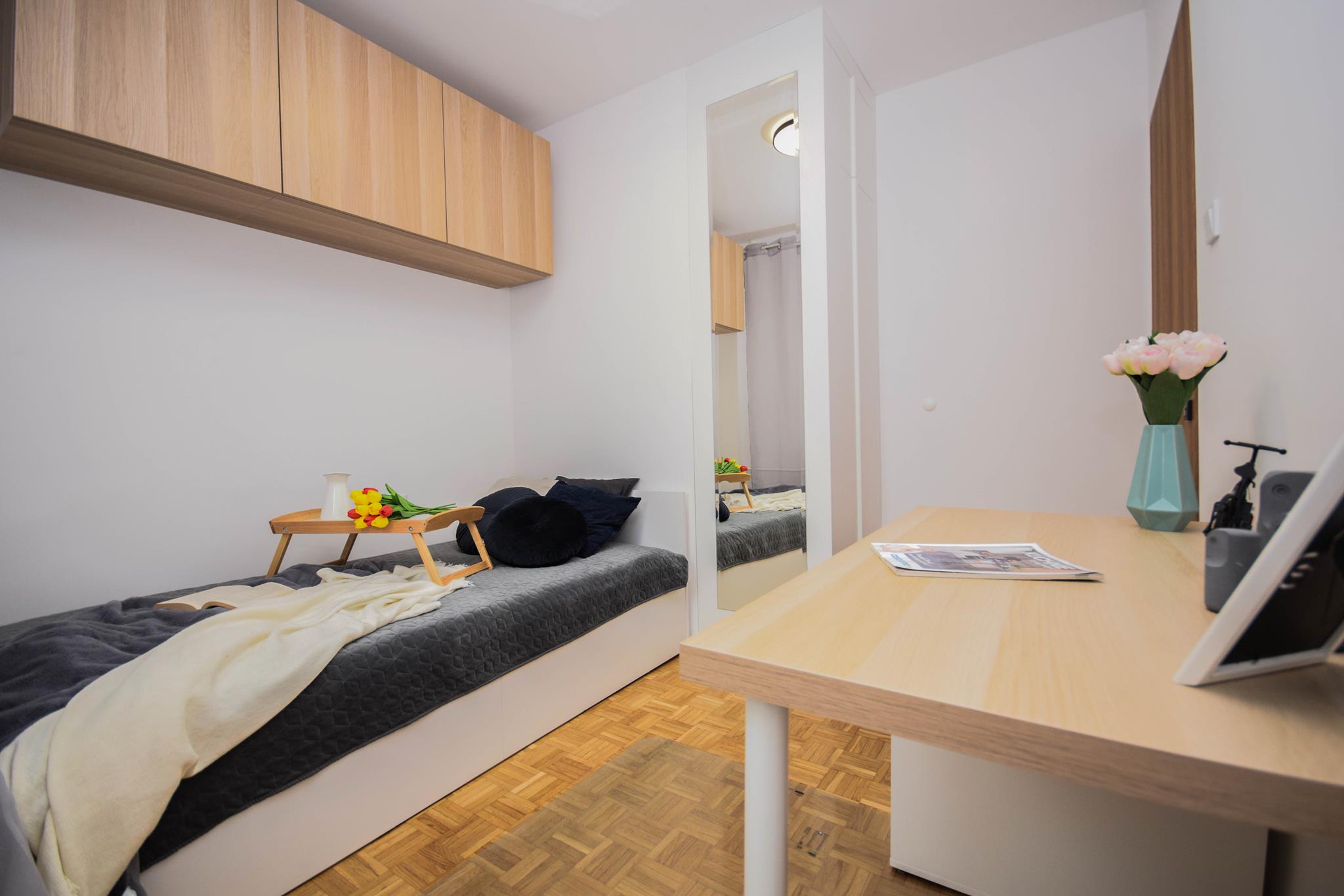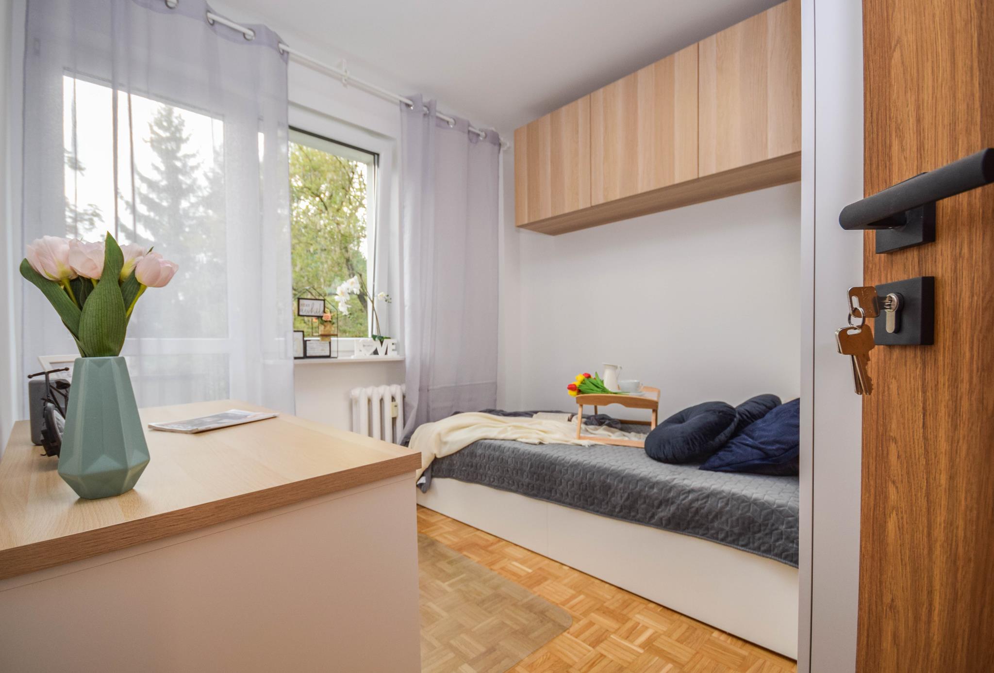 Dwie niezależne sypialnie z wygodnym łóżkami, pojemną szafą oraz biurkiem z krzesłem do pracy czy nauki.