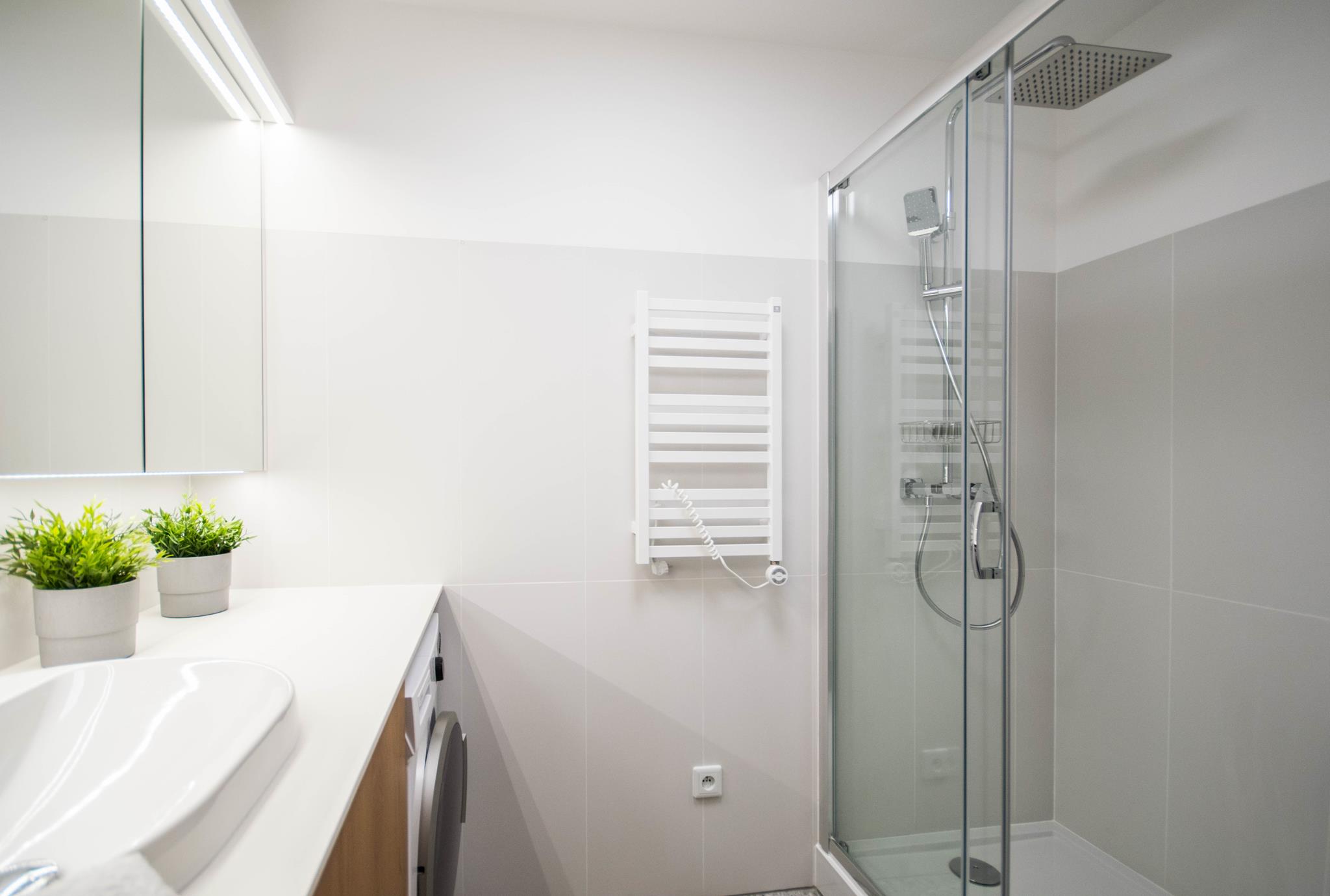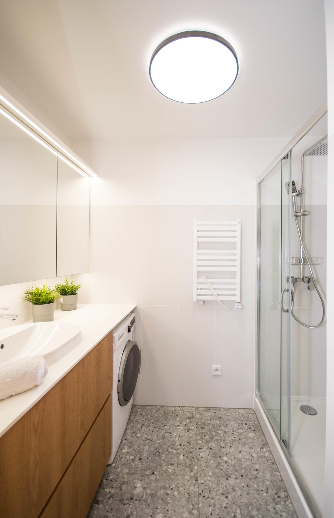 Łazienka z dużym prysznicem, pralką, nowoczesną umywalką, dużym blatem i lustrem oraz osobne WC z umywalką.