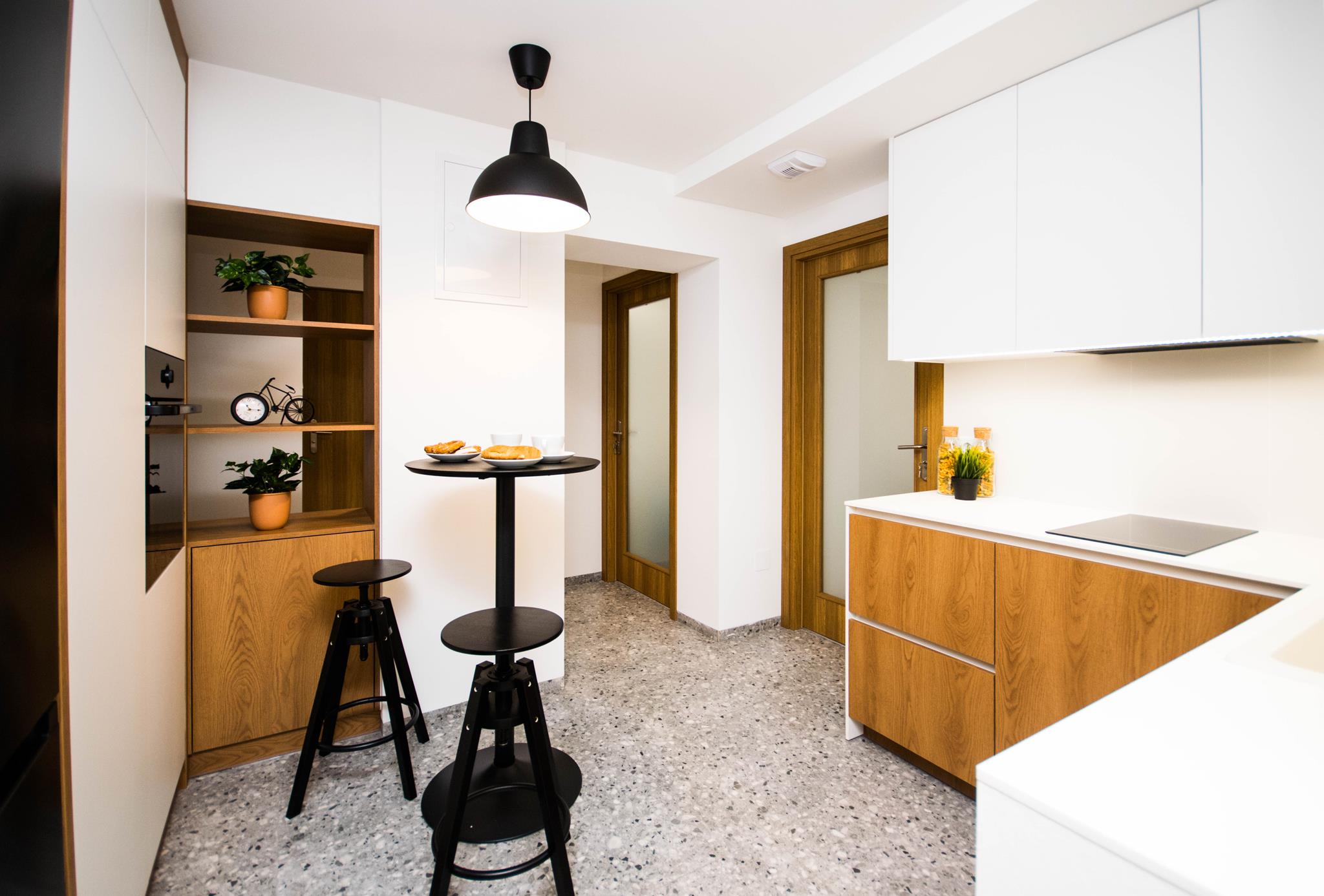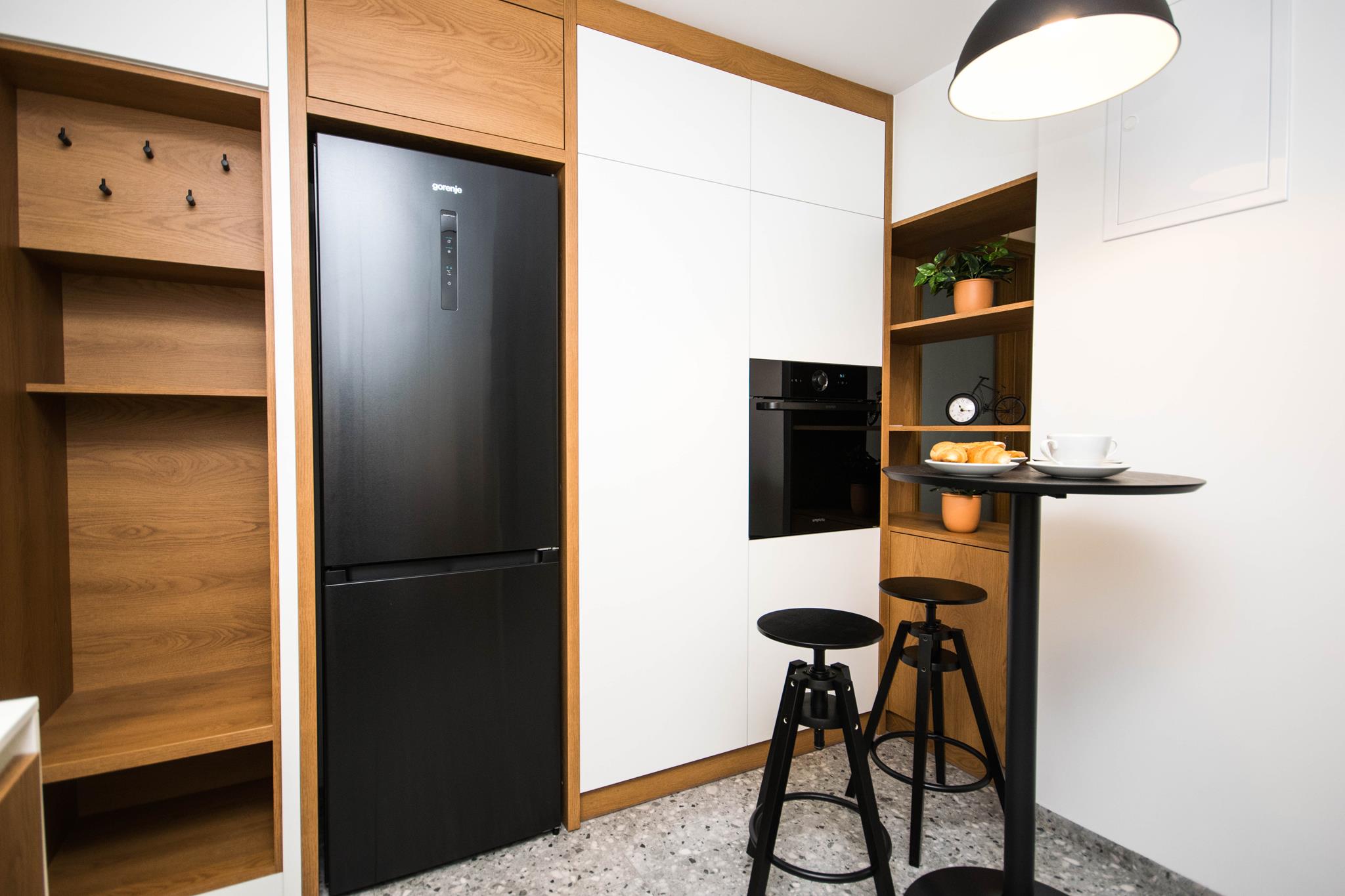 🍳 Duża kuchnia w zabudowie pod sam sufit, z pełnym wyposażeniem włącznie ze zmywarką oraz stolikiem z krzesłami barowymi