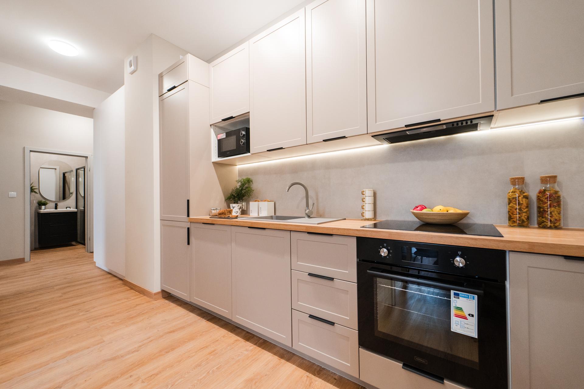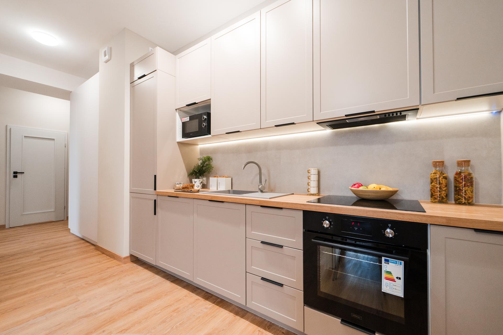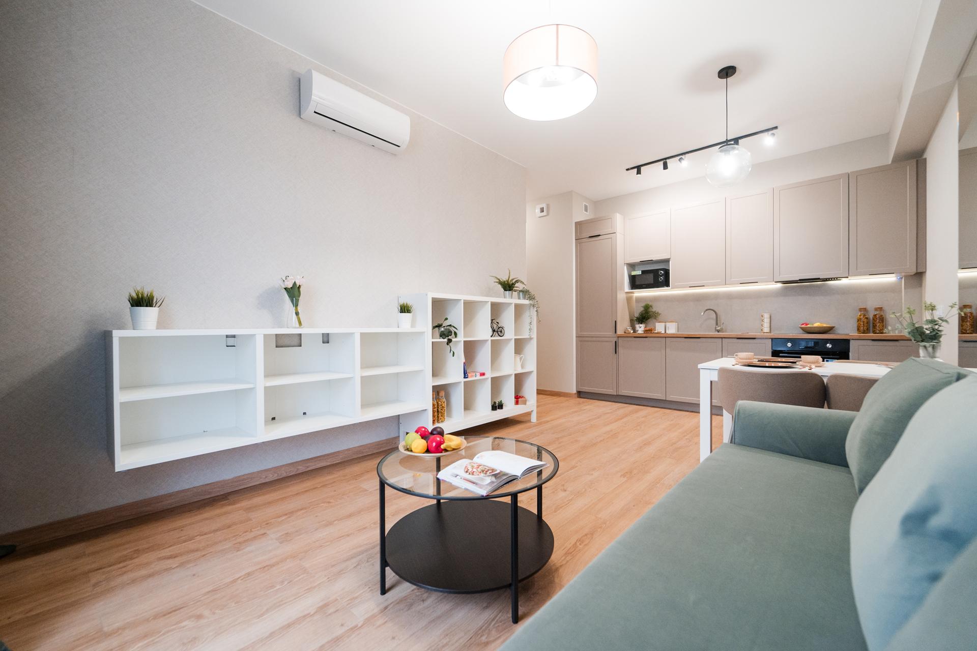 W mieszkaniu znajdziesz dwa niezależne pokoje z rozkładaną sofą lub łóżkiem z materacem, pojemną szafą oraz komodą i biurkiem do pracy czy nauki. Duży salon wraz z klimatyzacją oraz TV a także wyjściem na balkon, miejscem do spędzania czasu wolnego na powietrzu. Kuchnie z miejscem do jedzenia posiłków, wraz z pełnym wyposażeniem takim jak: