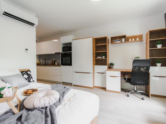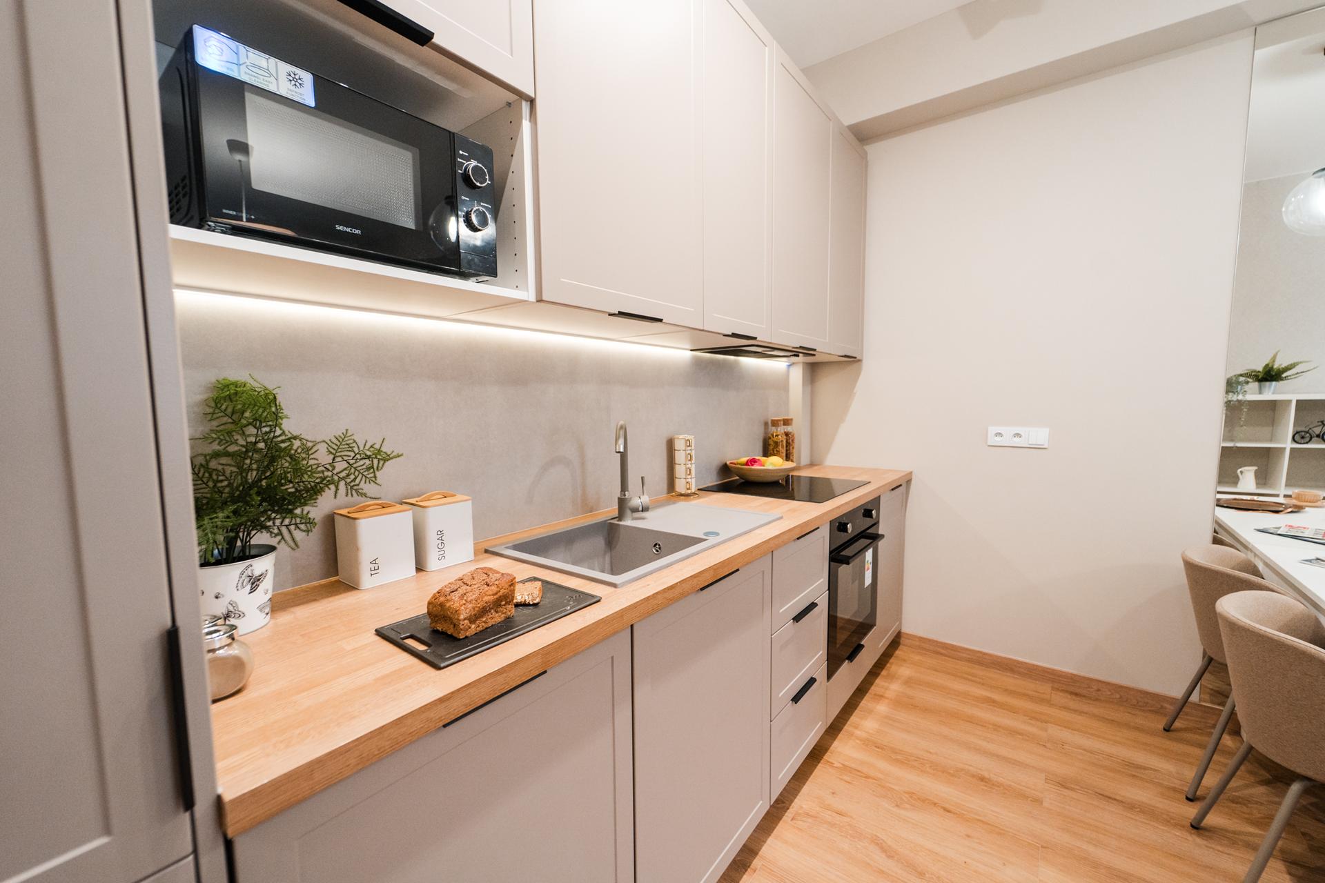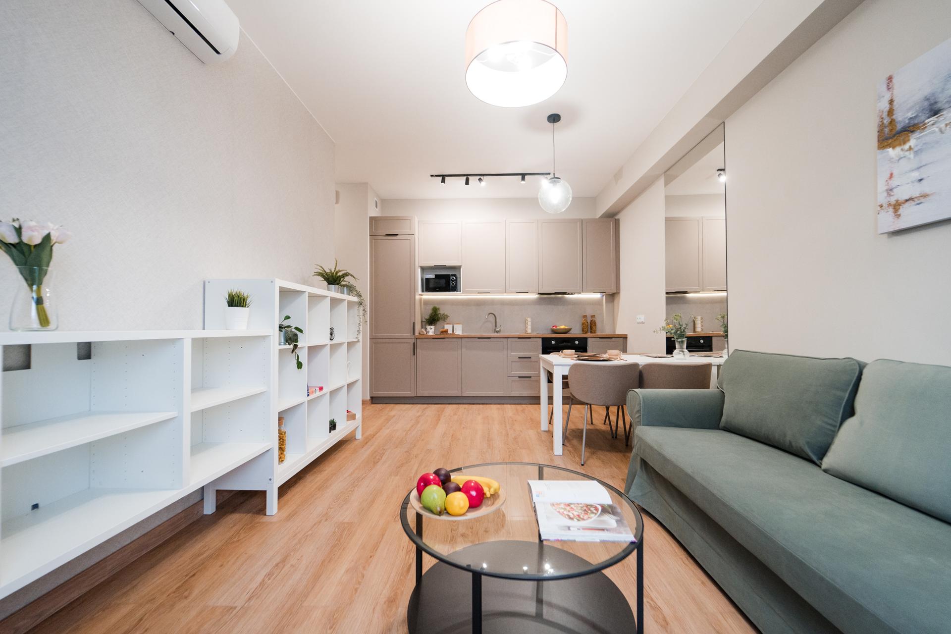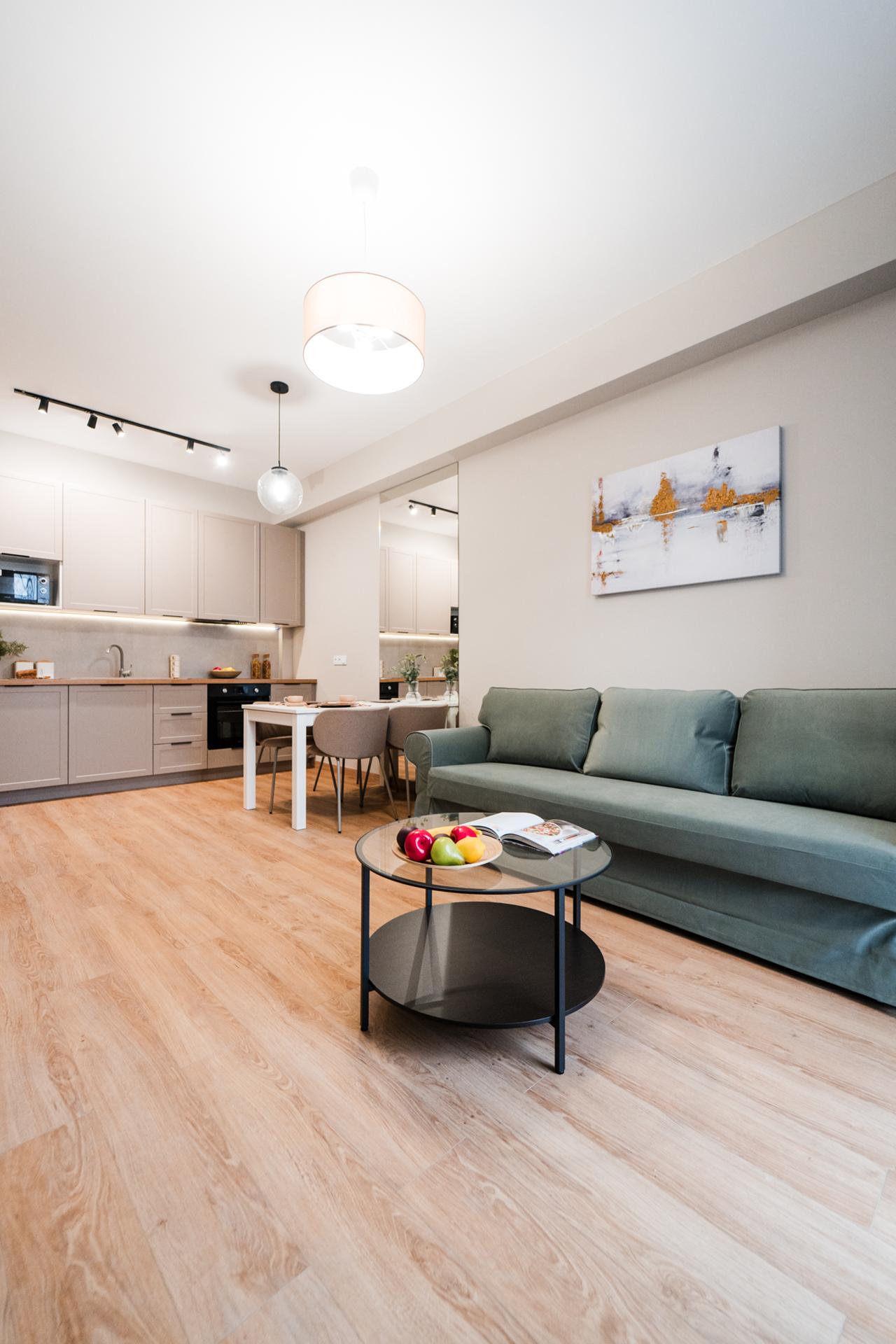 W mieszkaniu znajdziesz dwa niezależne pokoje z rozkładaną sofą lub łóżkiem z materacem, pojemną szafą oraz komodą i biurkiem do pracy czy nauki. Duży salon wraz z klimatyzacją oraz TV a także wyjściem na balkon, miejscem do spędzania czasu wolnego na powietrzu. Kuchnie z miejscem do jedzenia posiłków, wraz z pełnym wyposażeniem takim jak: