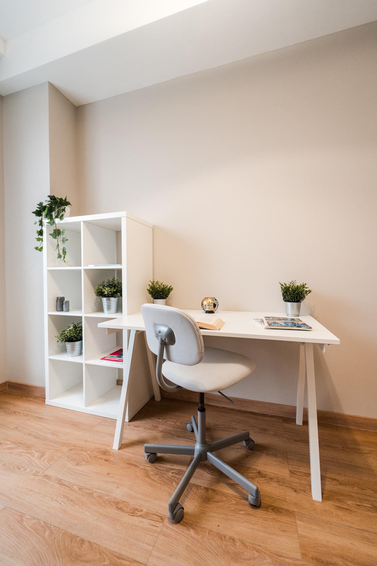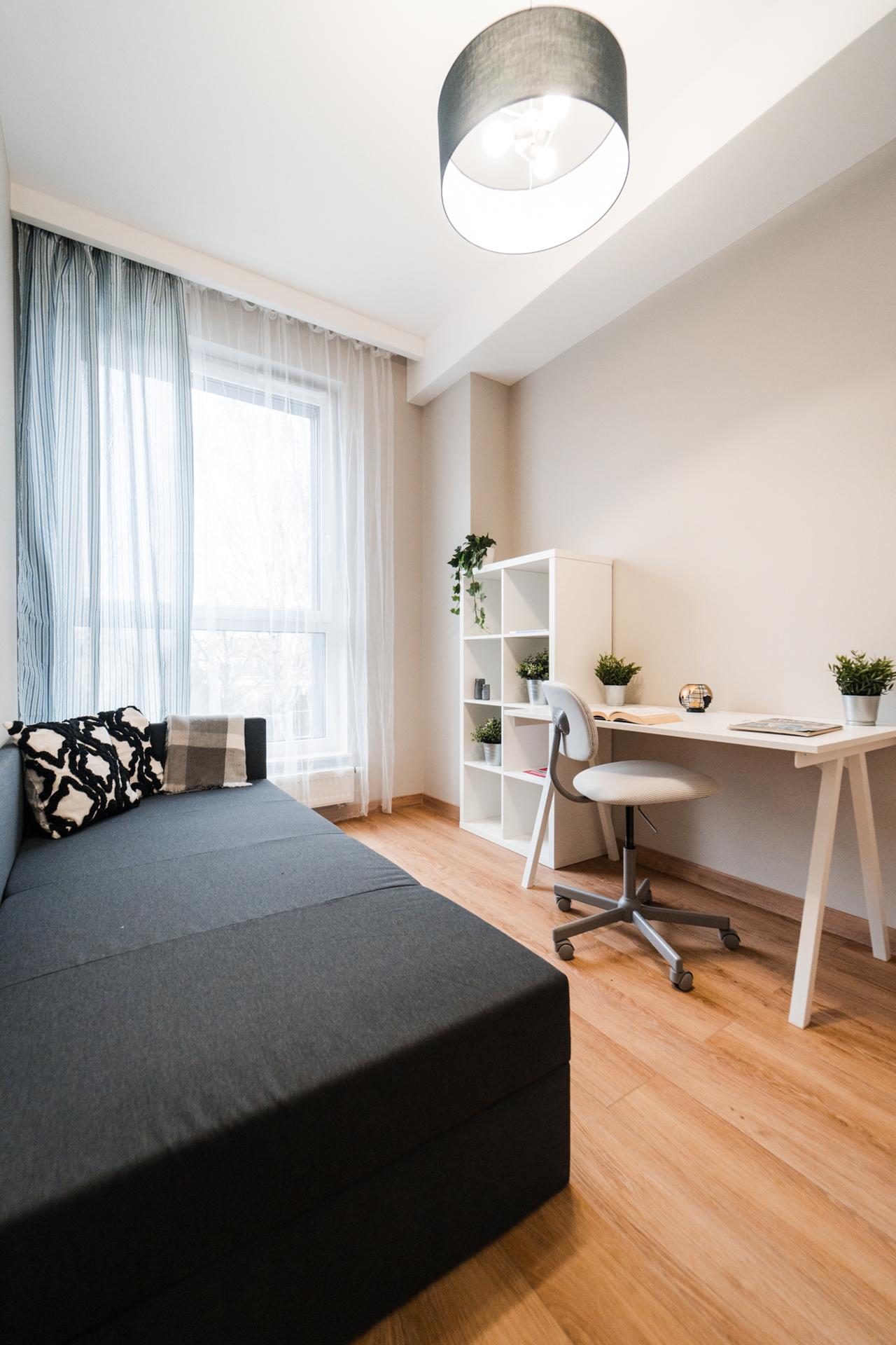 🛏 Pierwsza sypialnia z wygodną rozkładaną sofą, biurkiem do pracy czy nauki, pojemną szafą oraz półkami