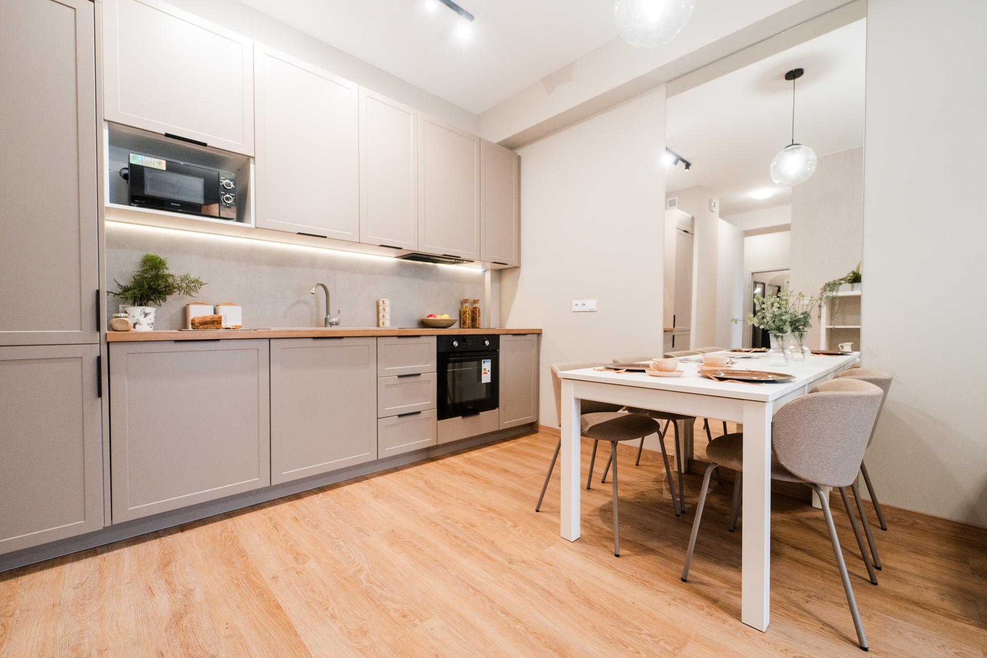 🍳 Kuchnia z pełnym wyposażeniem włącznie z piekarnikiem i zmywarką a także stołem z krzesłami do jedzenia wspólnych posiłków