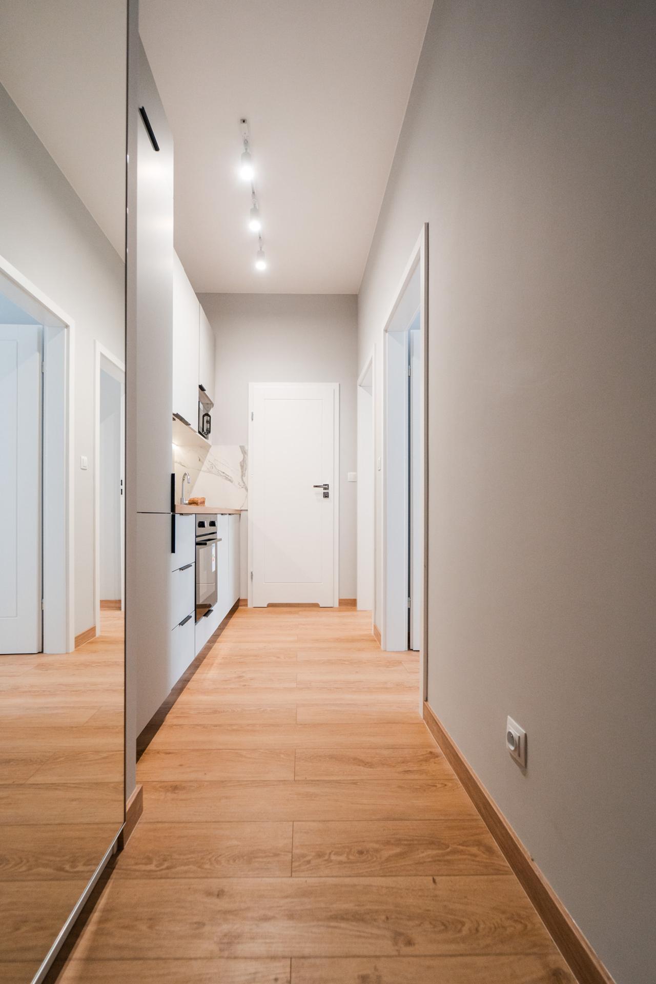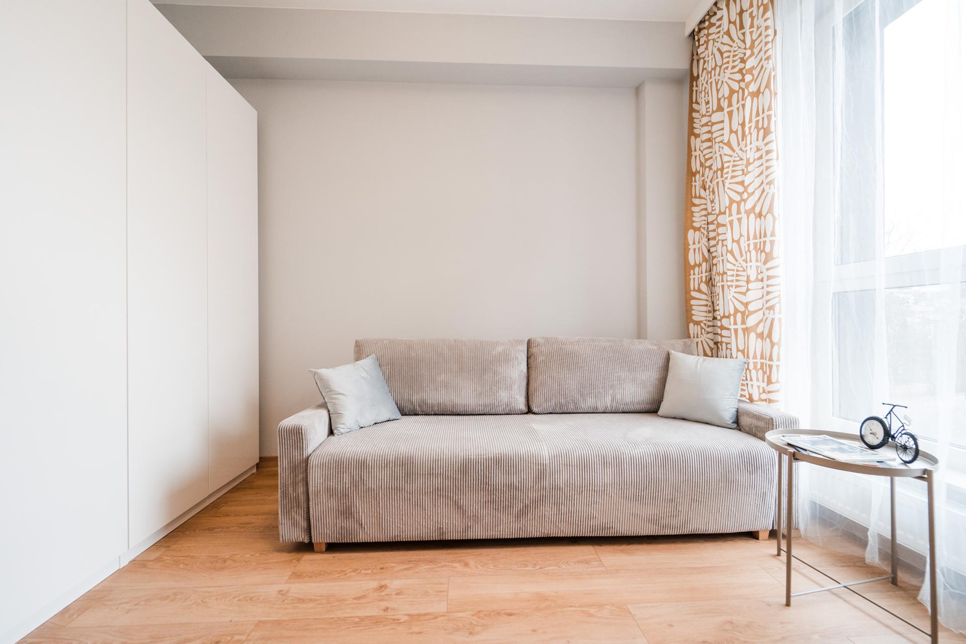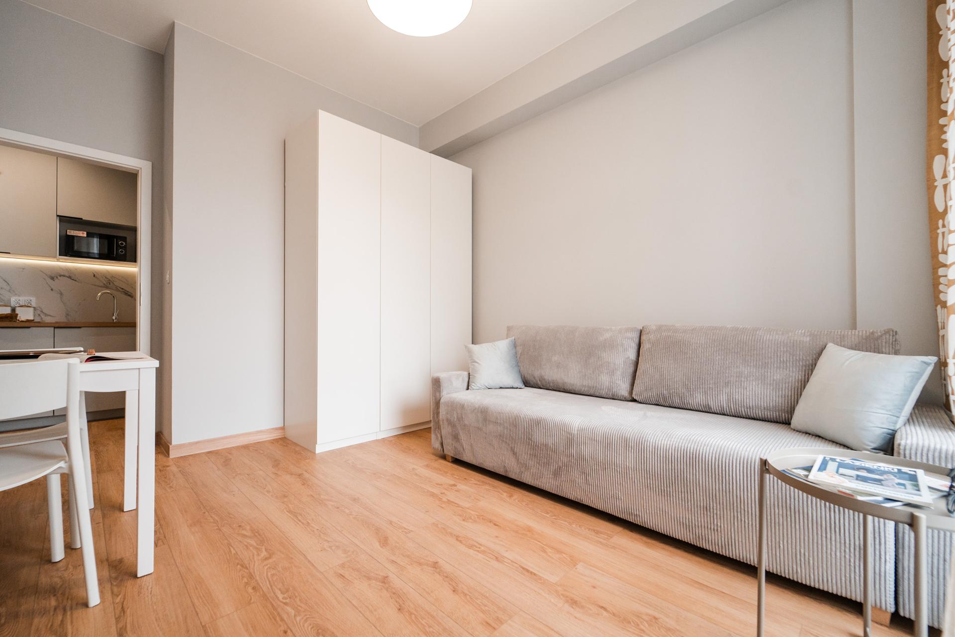 W mieszkaniu znajdziesz dwa niezależne pokoje z rozkładaną sofą, pojemną szafą oraz komodą i biurkiem do pracy czy nauki. Aneks kuchenny z pełnym wyposażeniem takim jak: