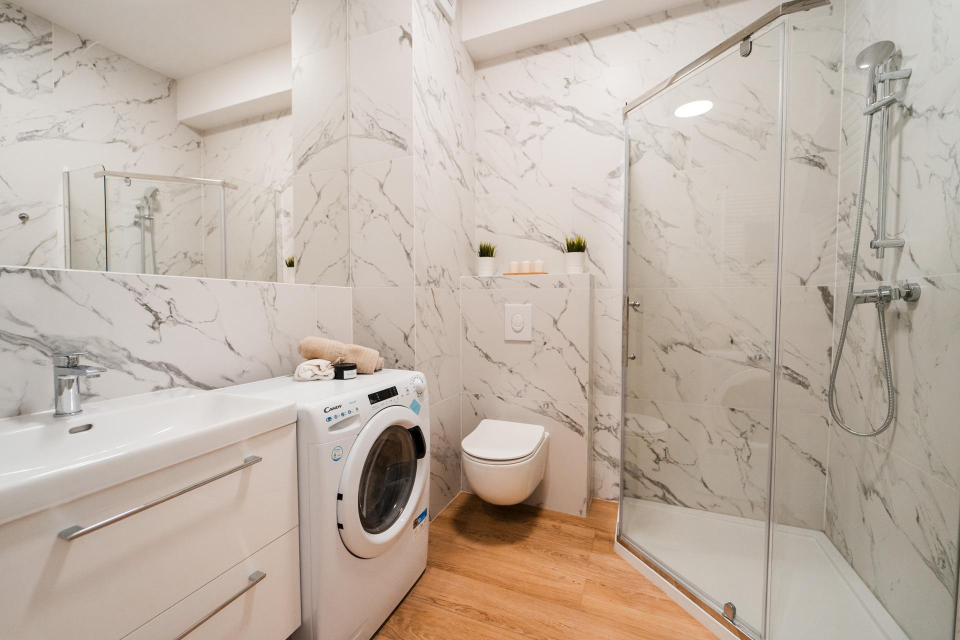 🛁 Łazienka z prysznicem, nowoczesną umywalką oraz pralkosuszarką