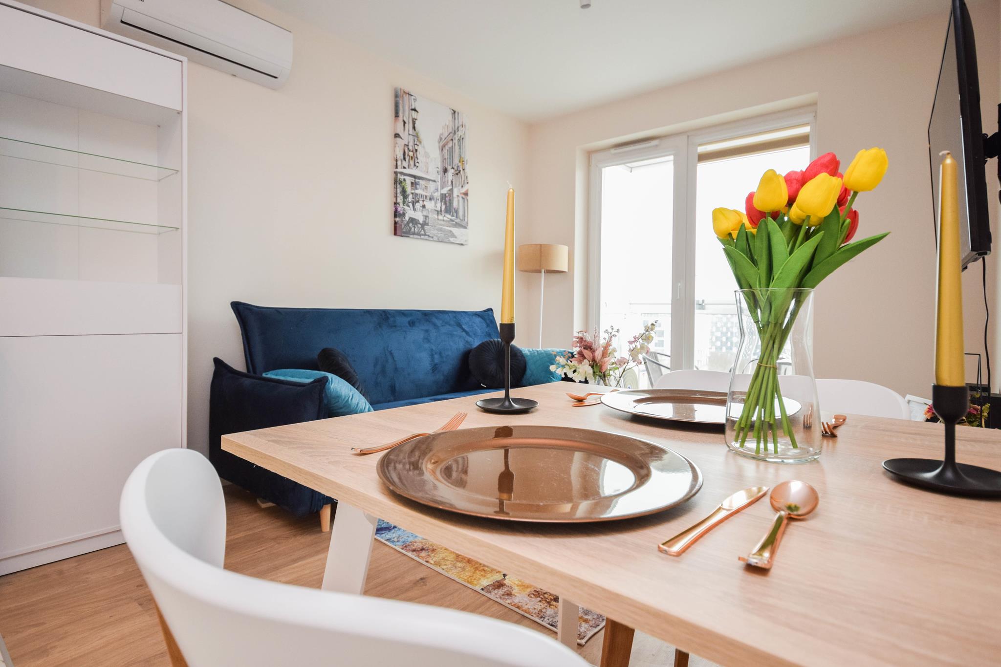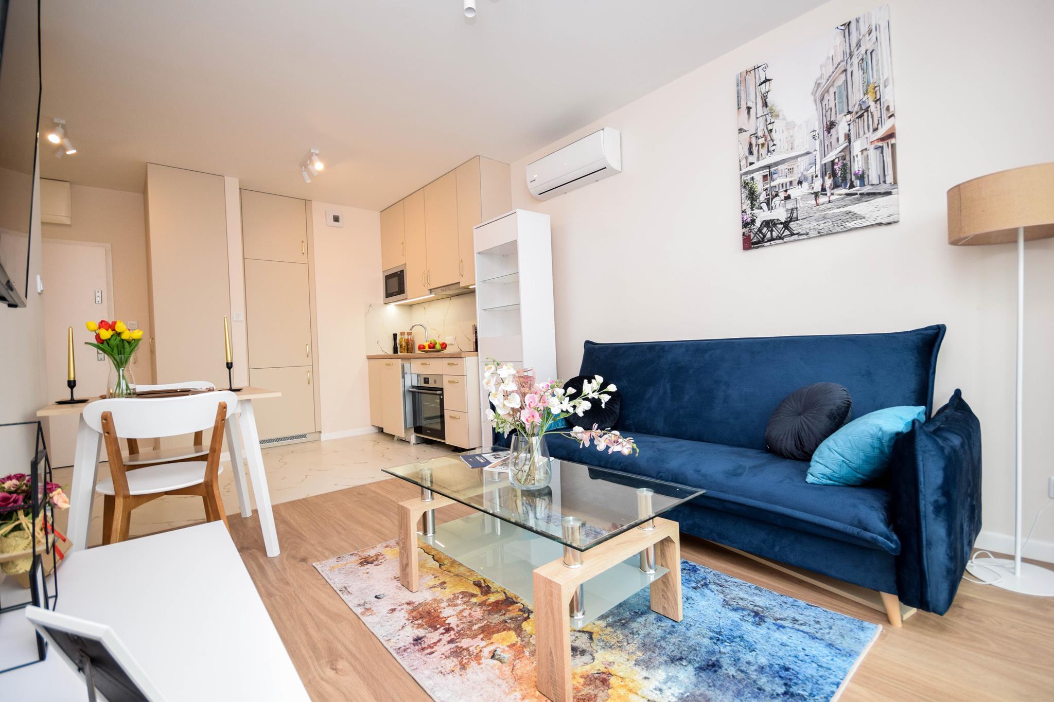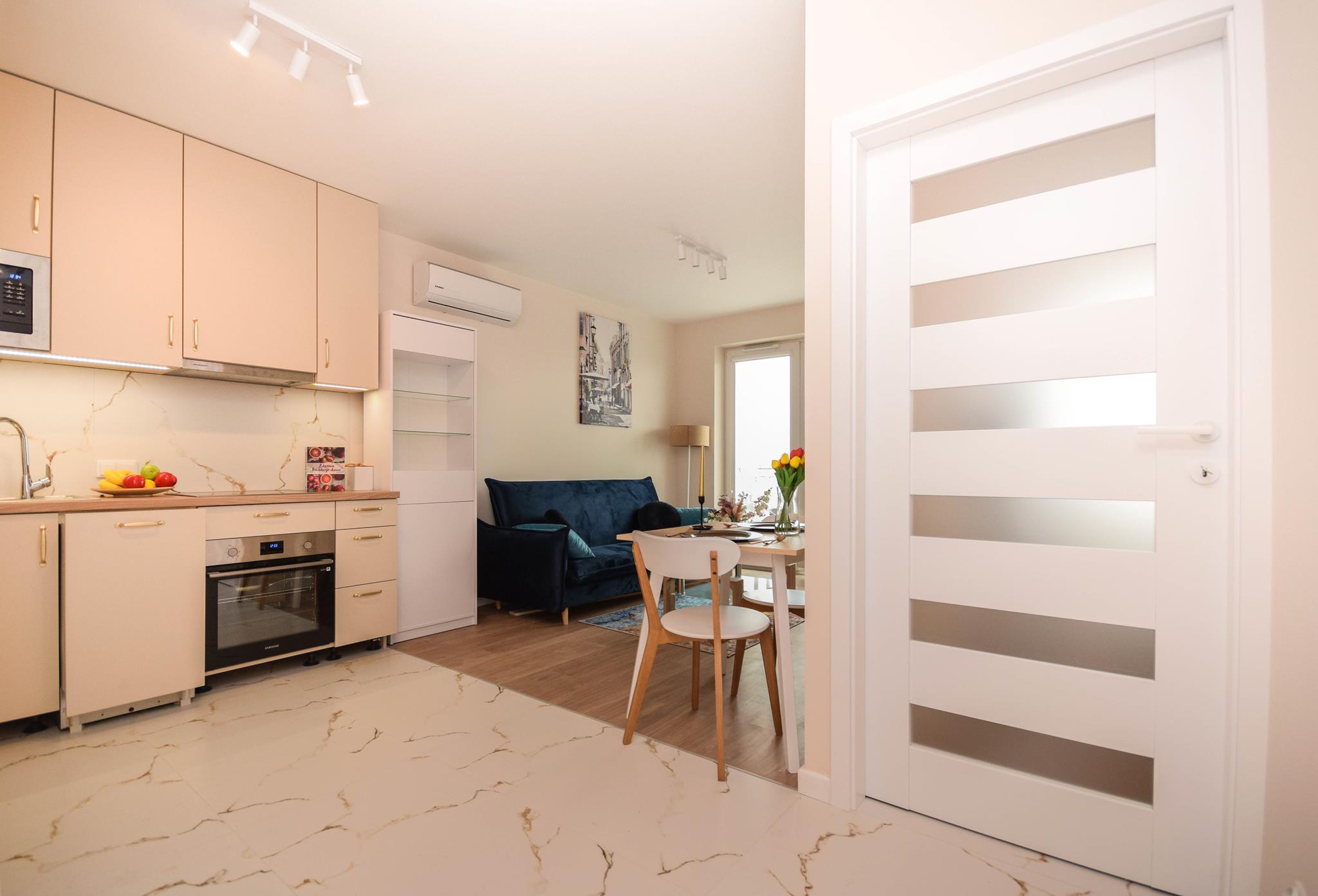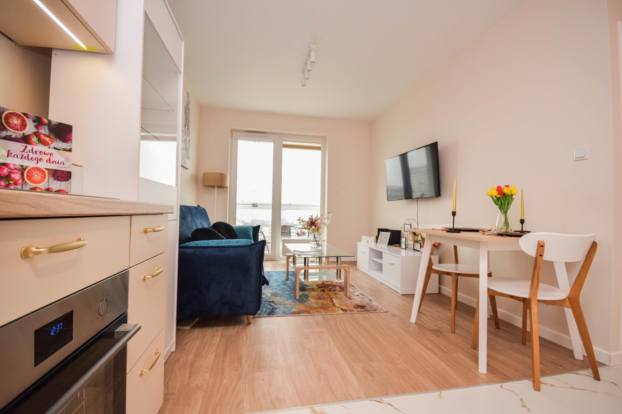 W mieszkaniu znajdziesz przedpokój z szafą. Nowoczesny salon z częścią wypoczynkową z sofą oraz stolikiem, szafą, telewizorem ze smart TV oraz miejscem do pracy czy nauki. Przestronna kuchnia z dużą ilością blatu roboczego, w której znajdziesz wszystkie niezbędne sprzęty AGD, takie jak:
