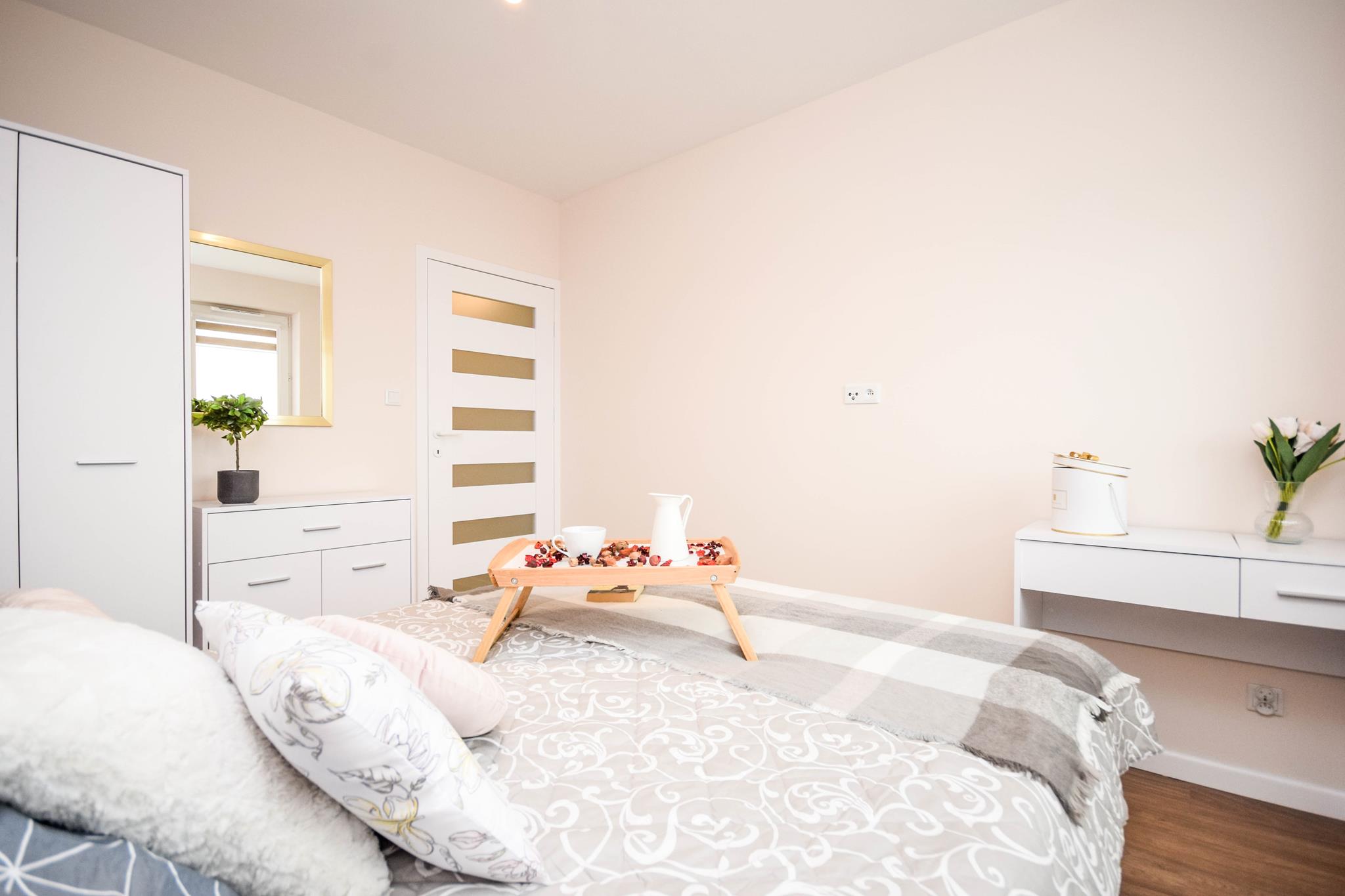 Sypialnia z wygodnym, tapicerowanym łóżkiem z materacem, pojemną szafą z lustrem i szafkami nocnymi.