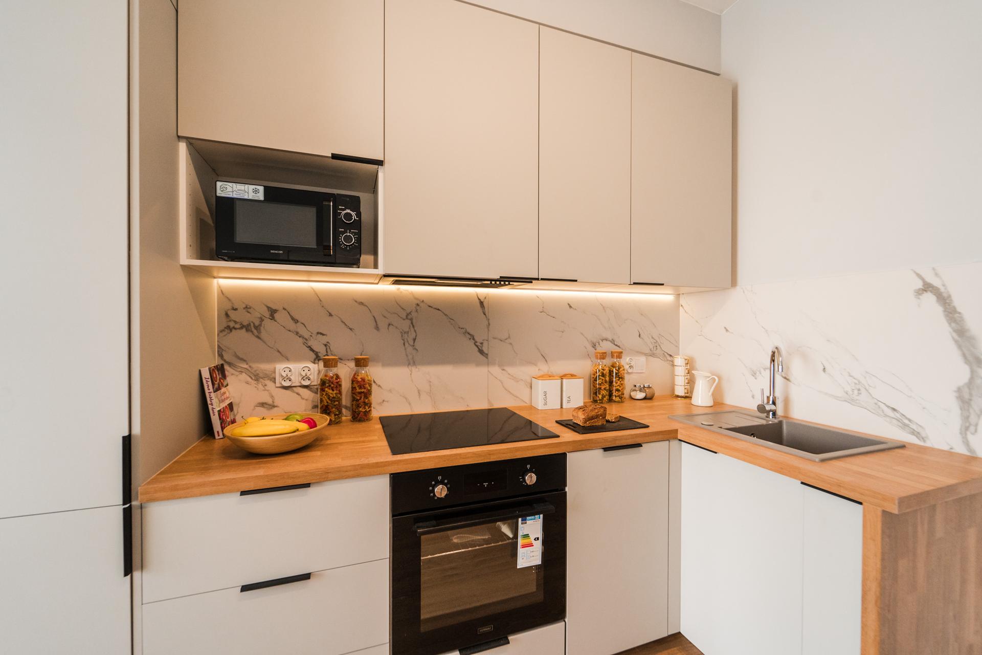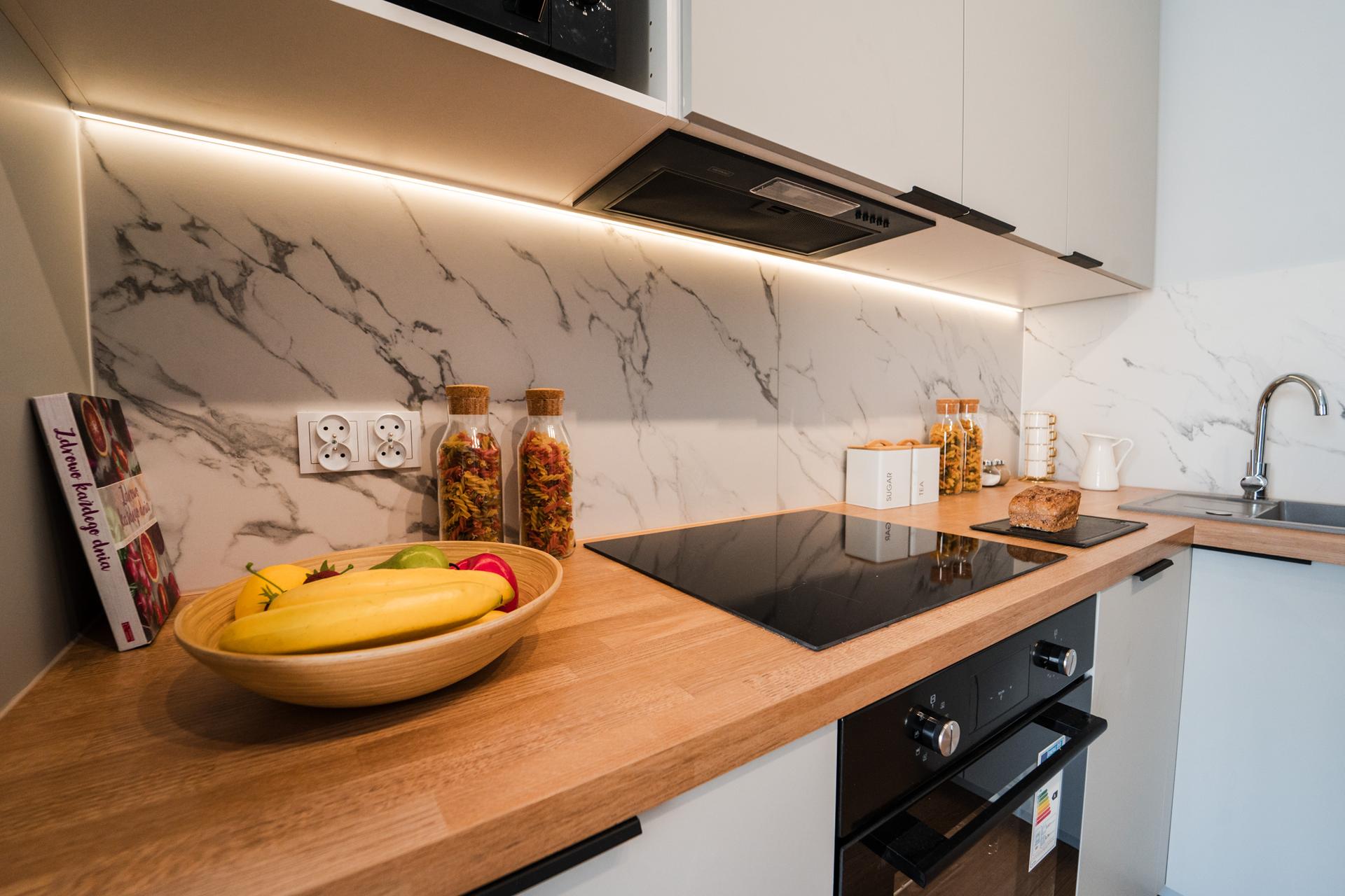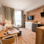 W mieszkaniu znajdziesz klimatyzowany salon z wygodną, rozkładaną sofą, pojemną komodą oraz TV. Z niego również wyjście na balkon. Oddzielna sypialnia wyposażona w duże, komfortowe łóżko oraz pojemną szafę. Aneks kuchenny z miejscem do jedzenia posiłków, wraz z pełnym wyposażeniem takim jak: