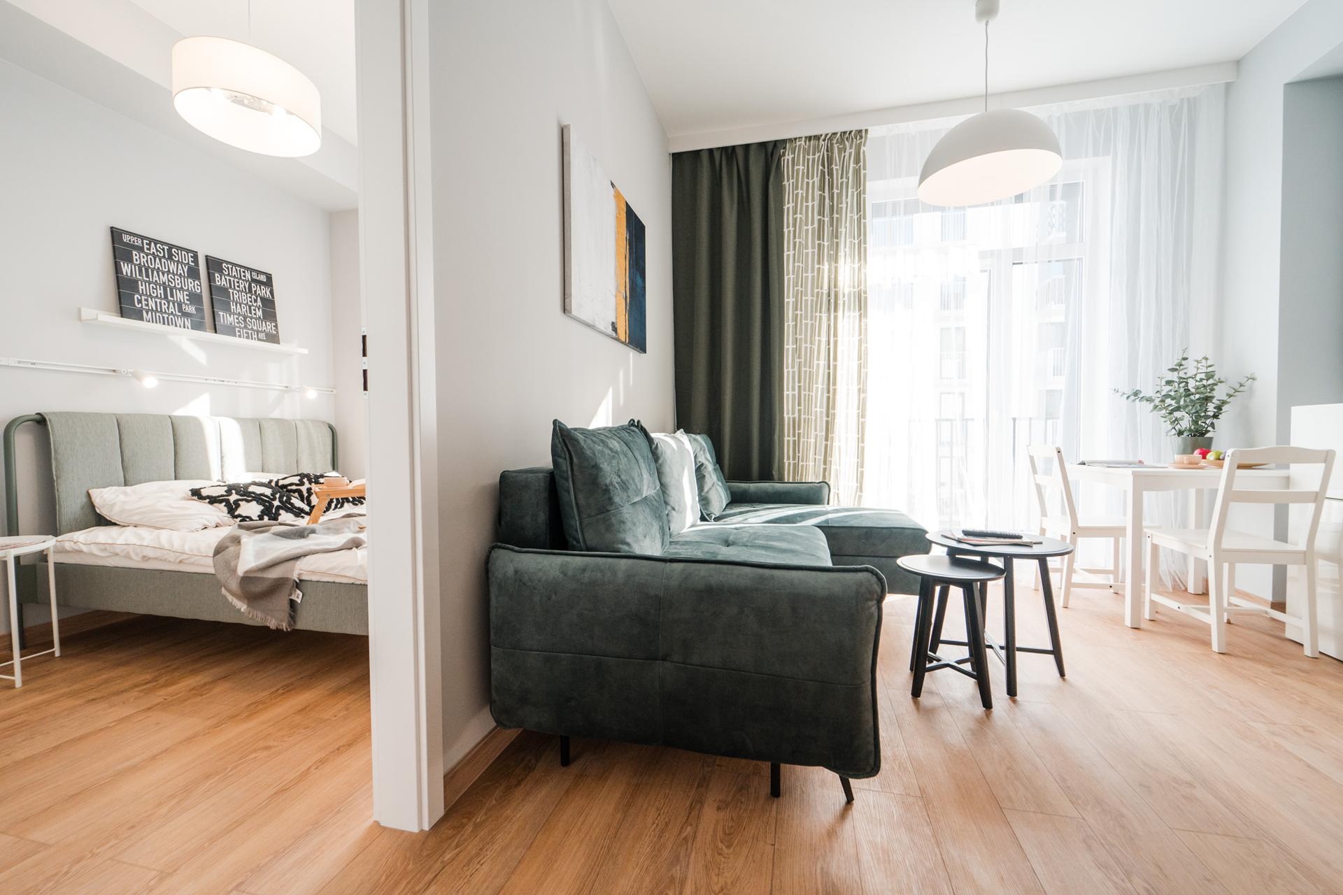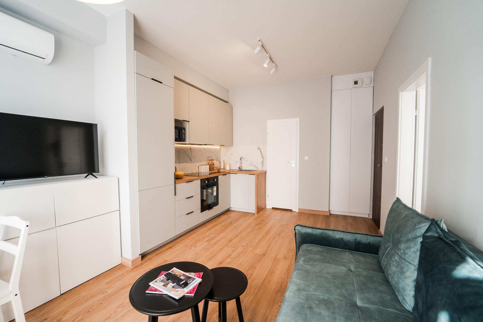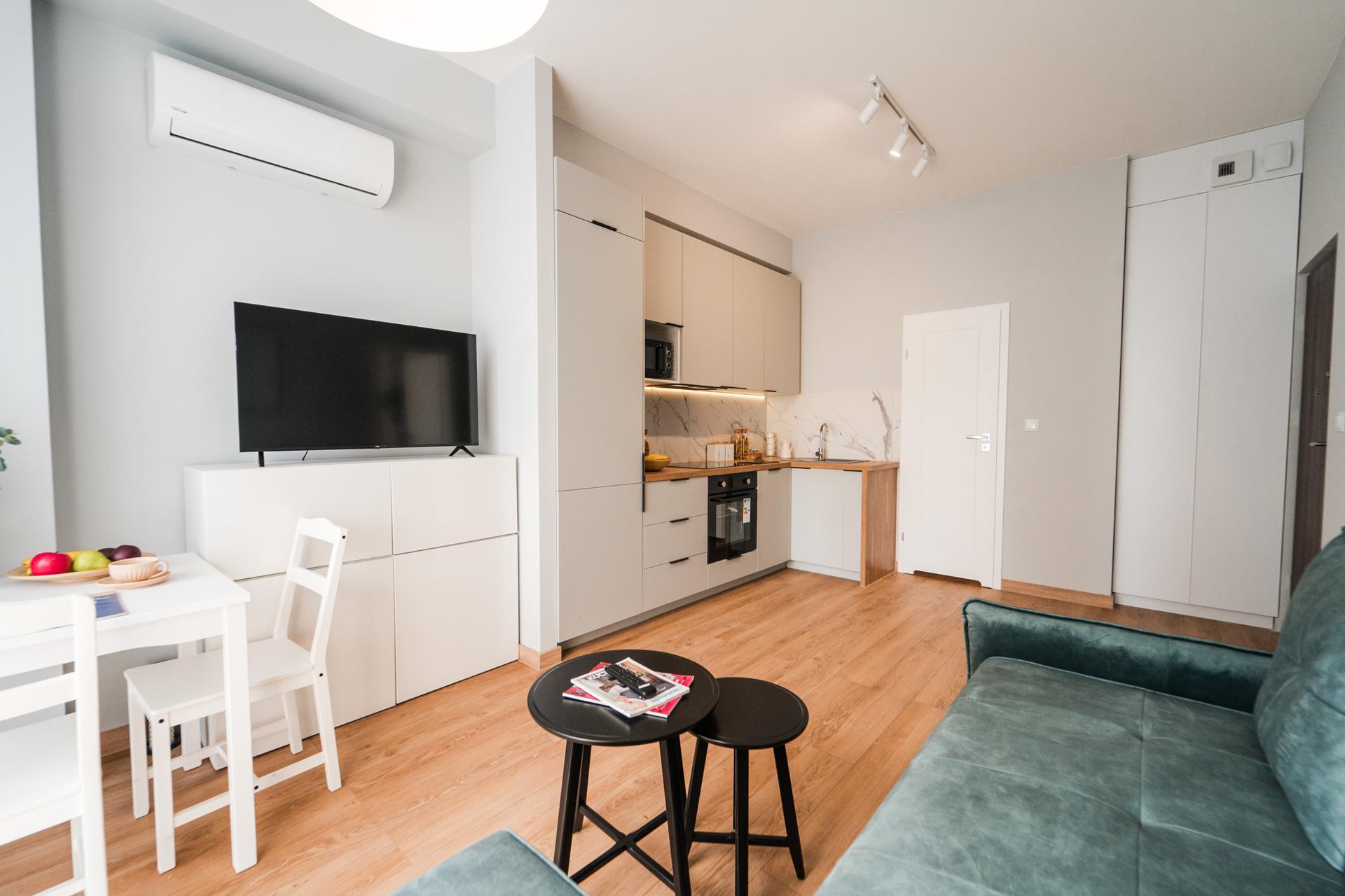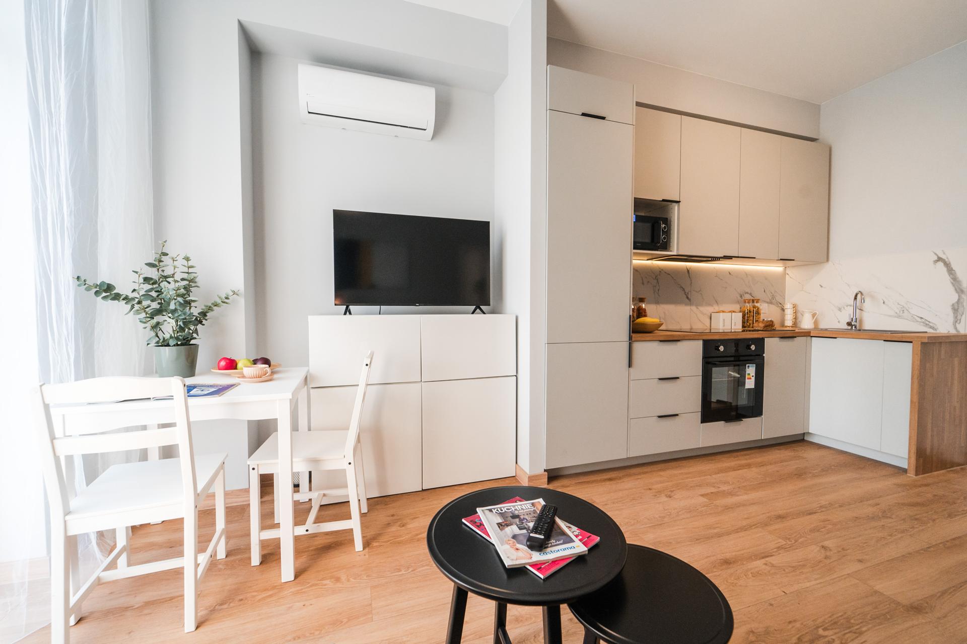 ☀️ Jasne, klimatyzowane mieszkanie z bardzo komfortową, rozkładaną sofą z funkcją spania, pojemną komodą oraz TV z funkcją Smart