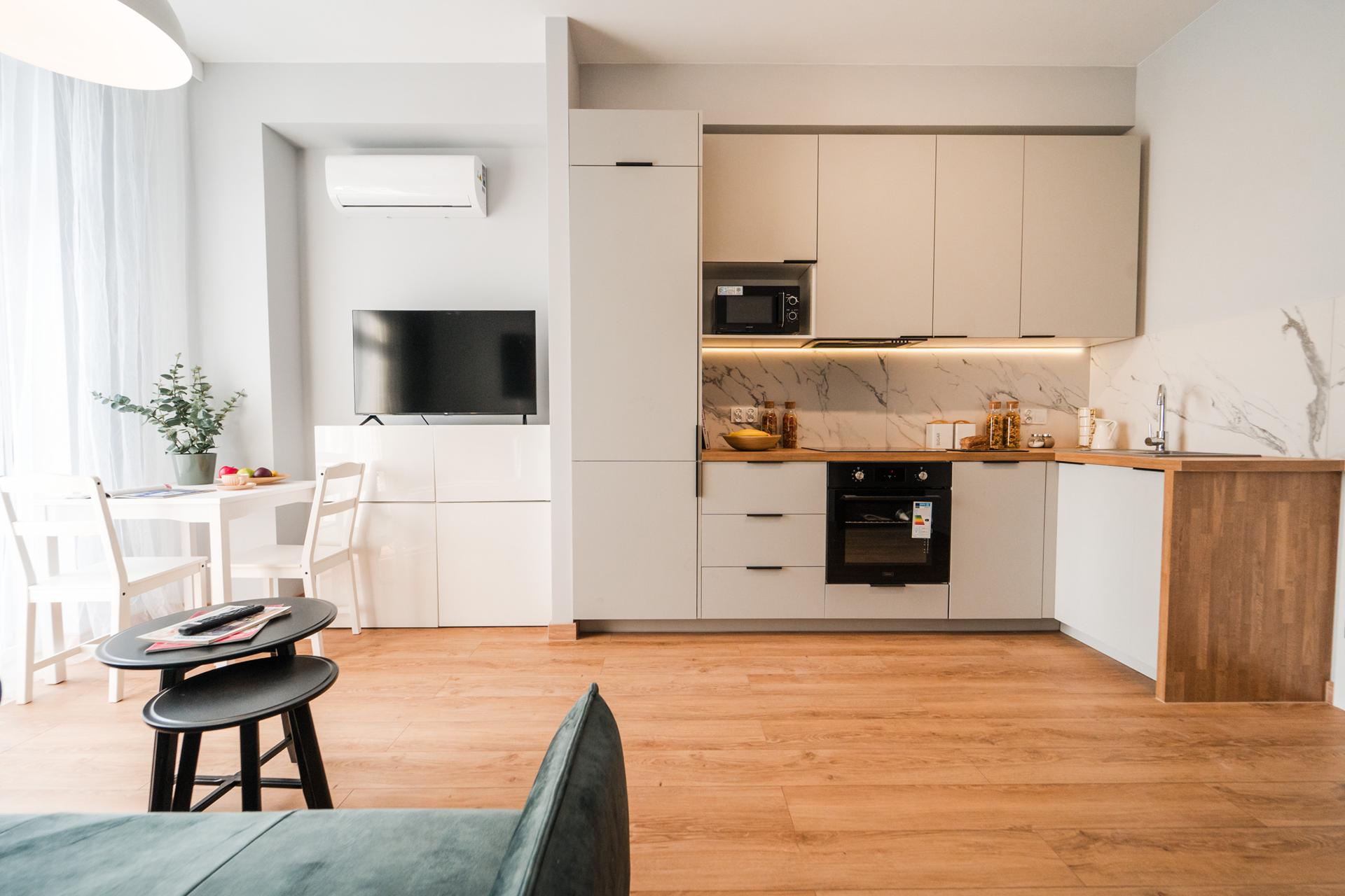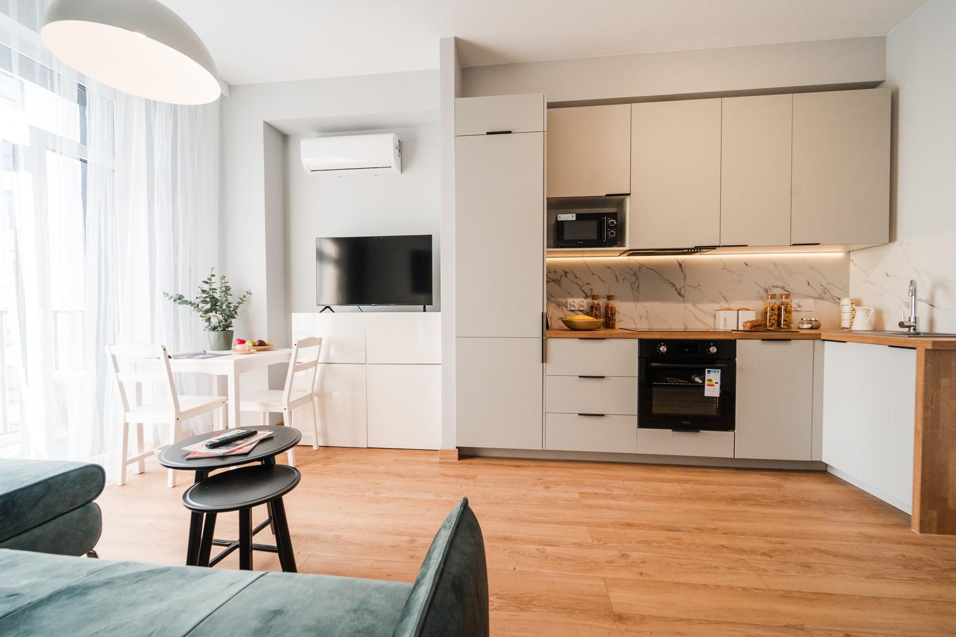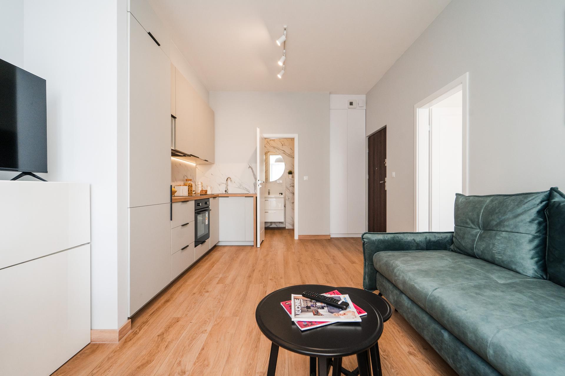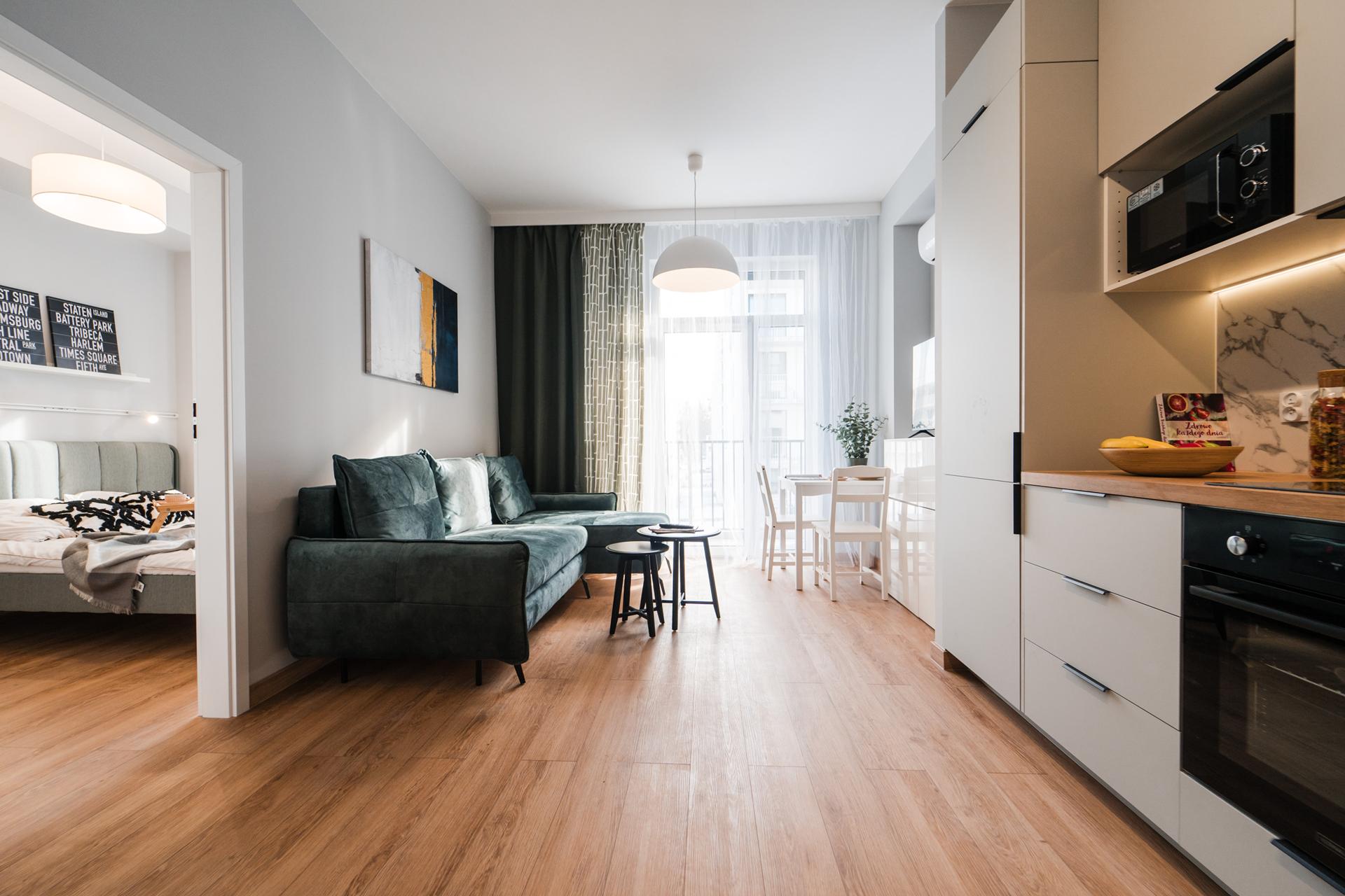 ☀️ Jasne, klimatyzowane mieszkanie z bardzo komfortową, rozkładaną sofą z funkcją spania, pojemną komodą oraz TV z funkcją Smart