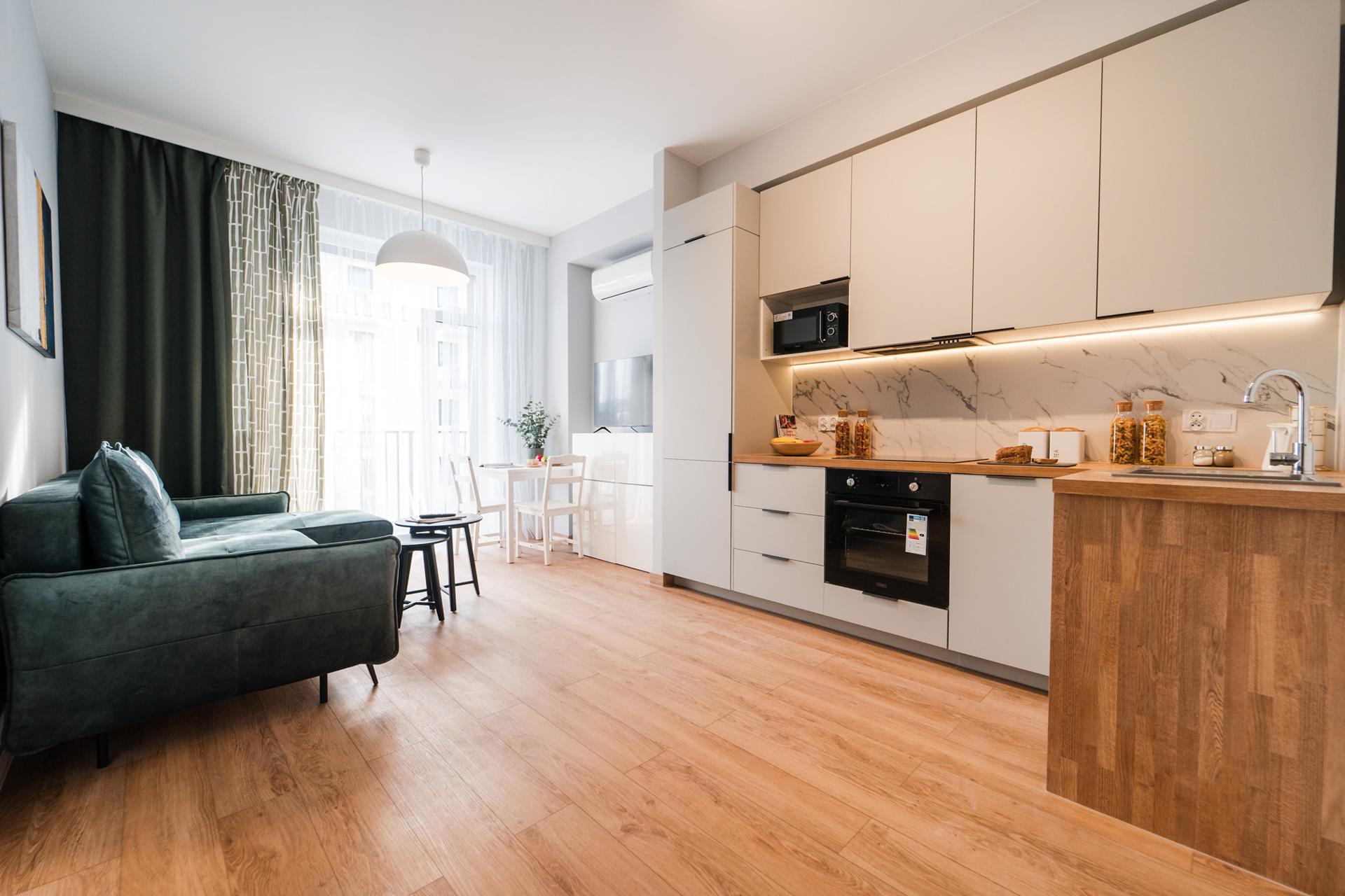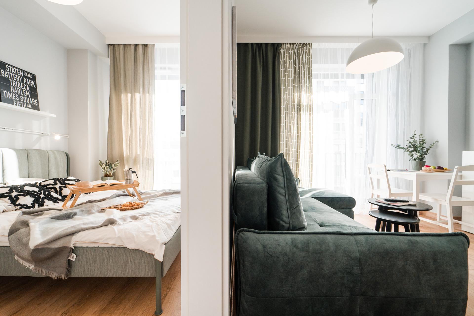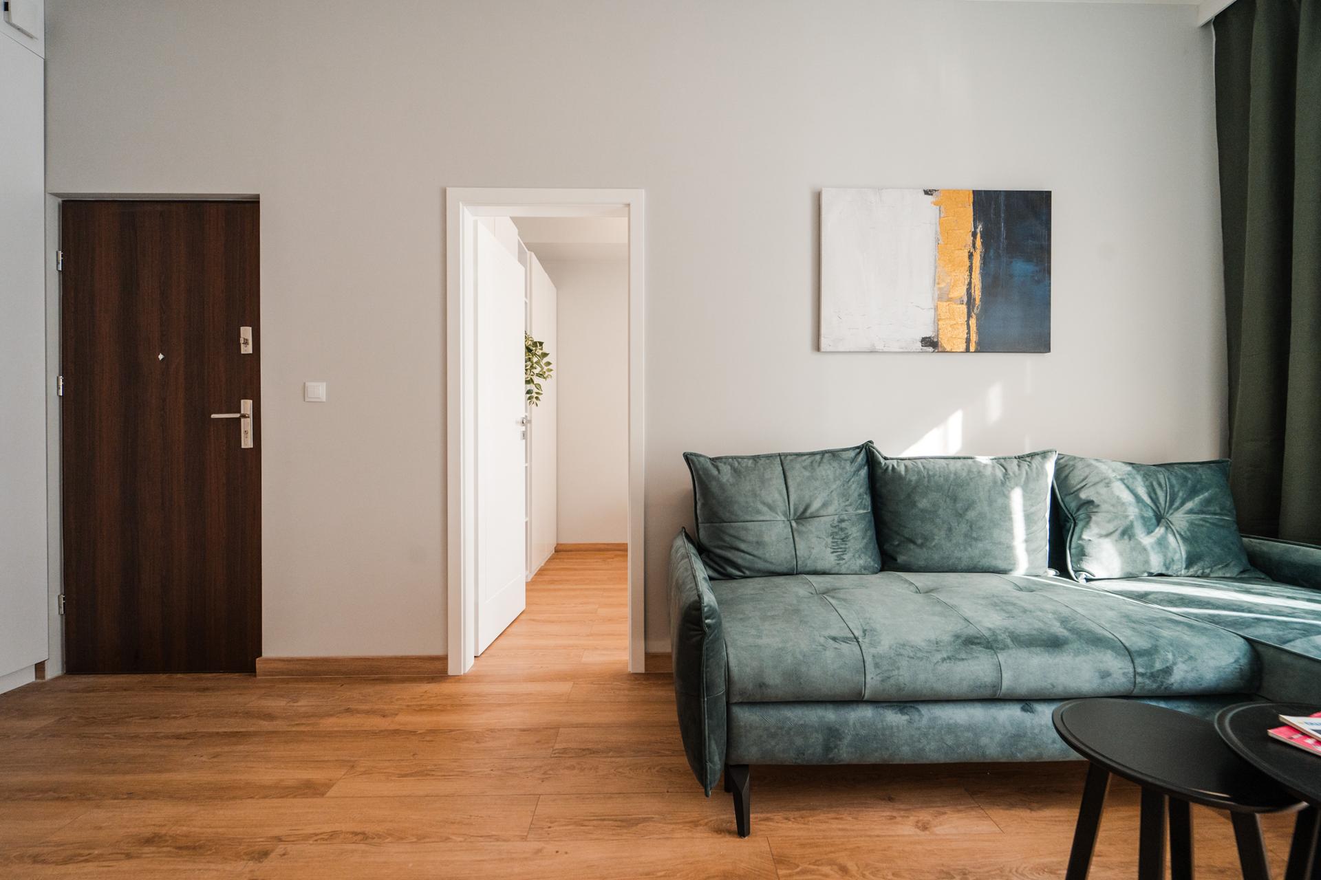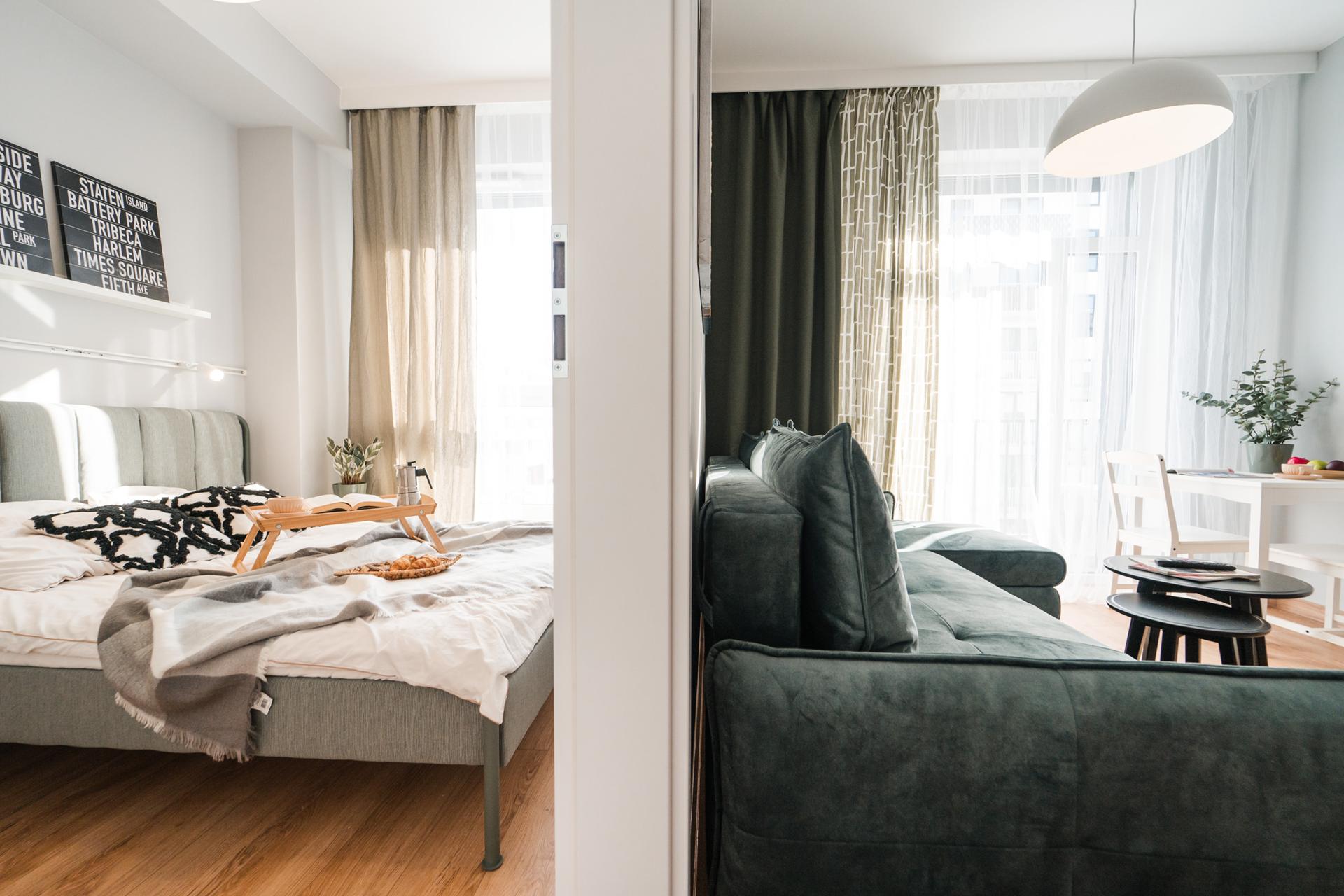 ☀️ Jasne, klimatyzowane mieszkanie z bardzo komfortową, rozkładaną sofą z funkcją spania, pojemną komodą oraz TV z funkcją Smart