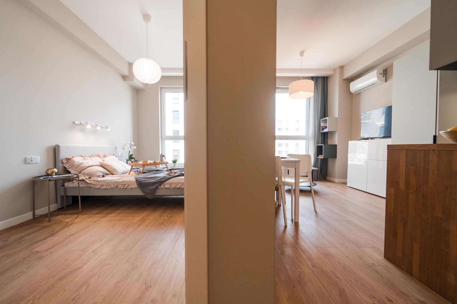 W mieszkaniu znajdziesz klimatyzowany salon z wygodną, rozkładaną sofą, pojemną komodą oraz TV. Z niego również wyjście na balkon. Oddzielna sypialnia wyposażona w duże, komfortowe łóżko oraz pojemną szafę. Aneks kuchenny z miejscem do jedzenia posiłków, wraz z pełnym wyposażeniem takim jak: