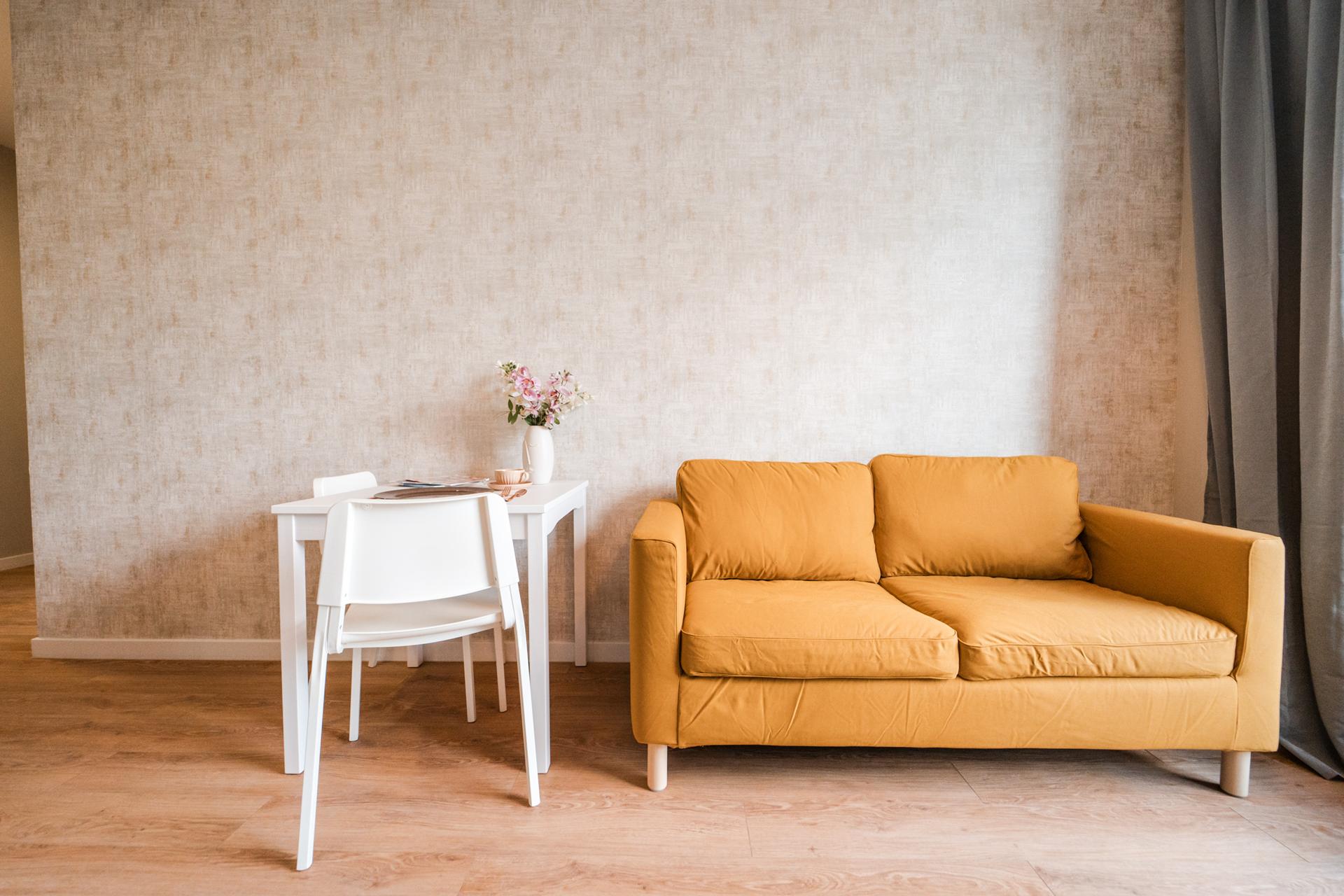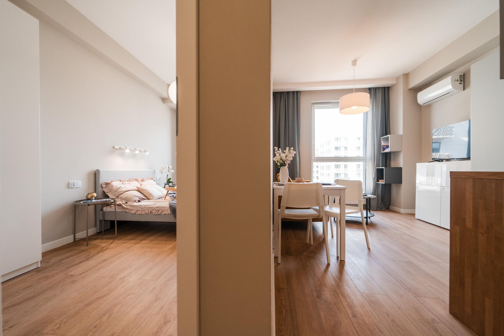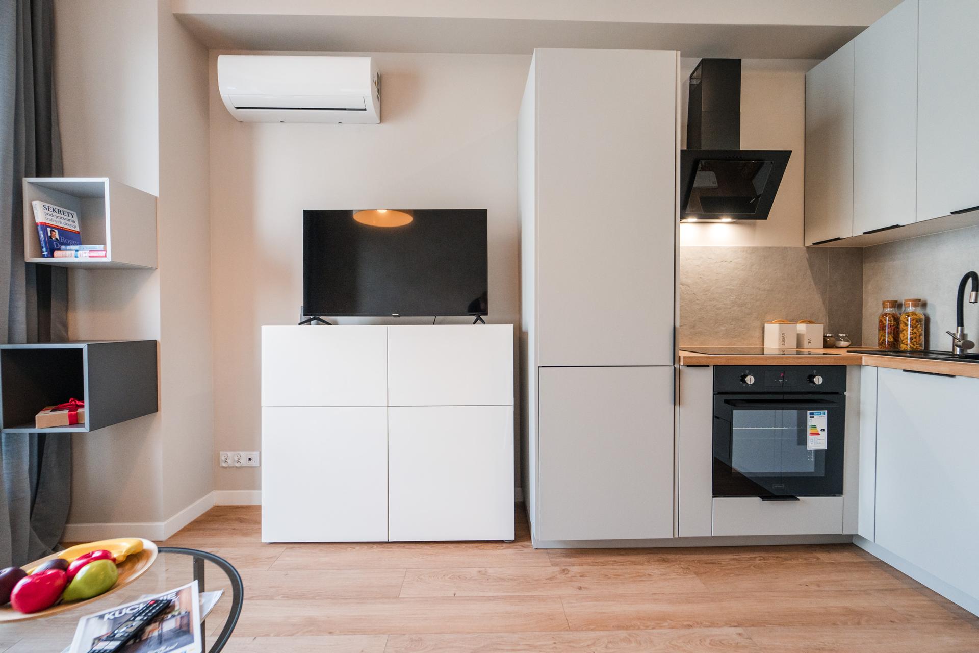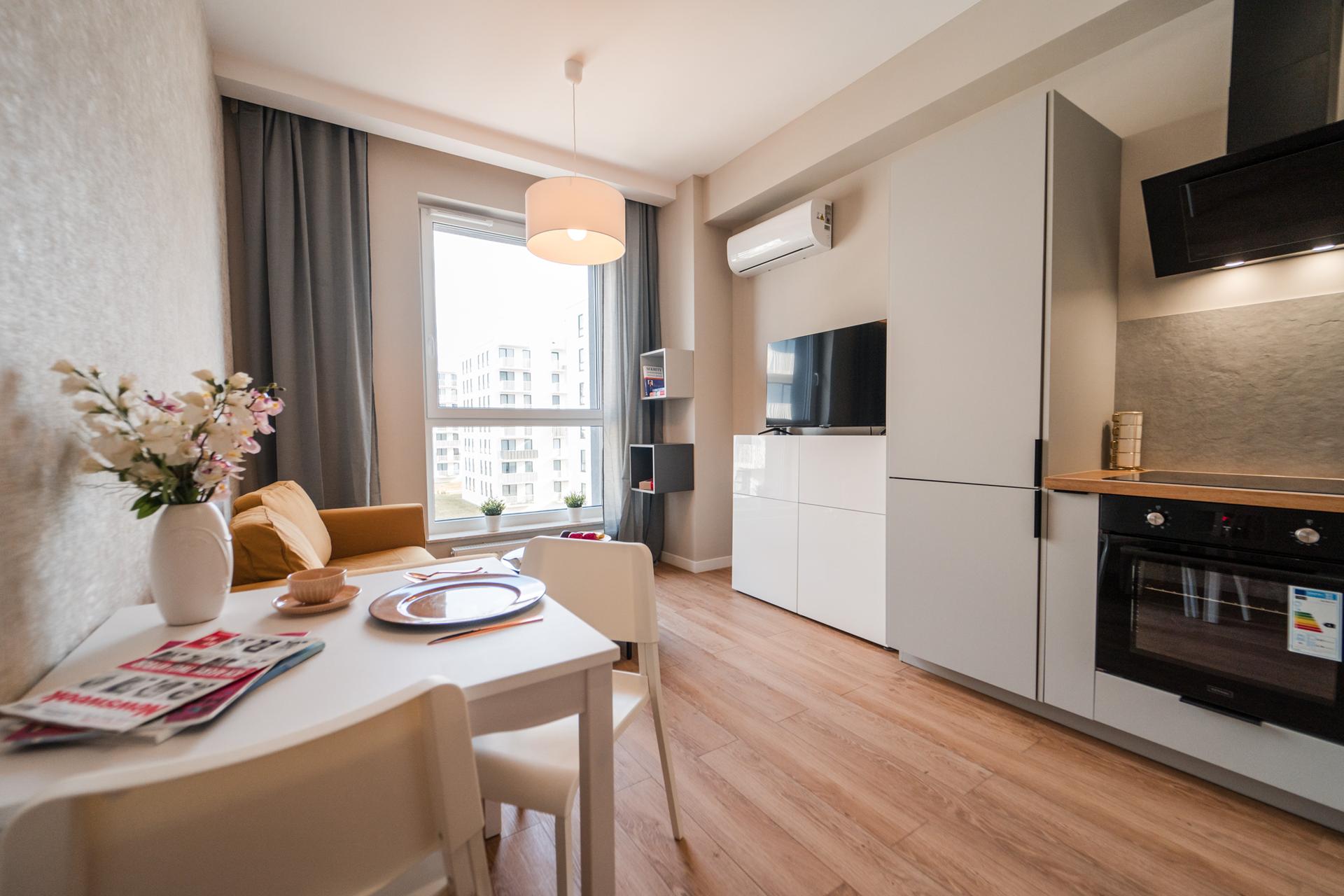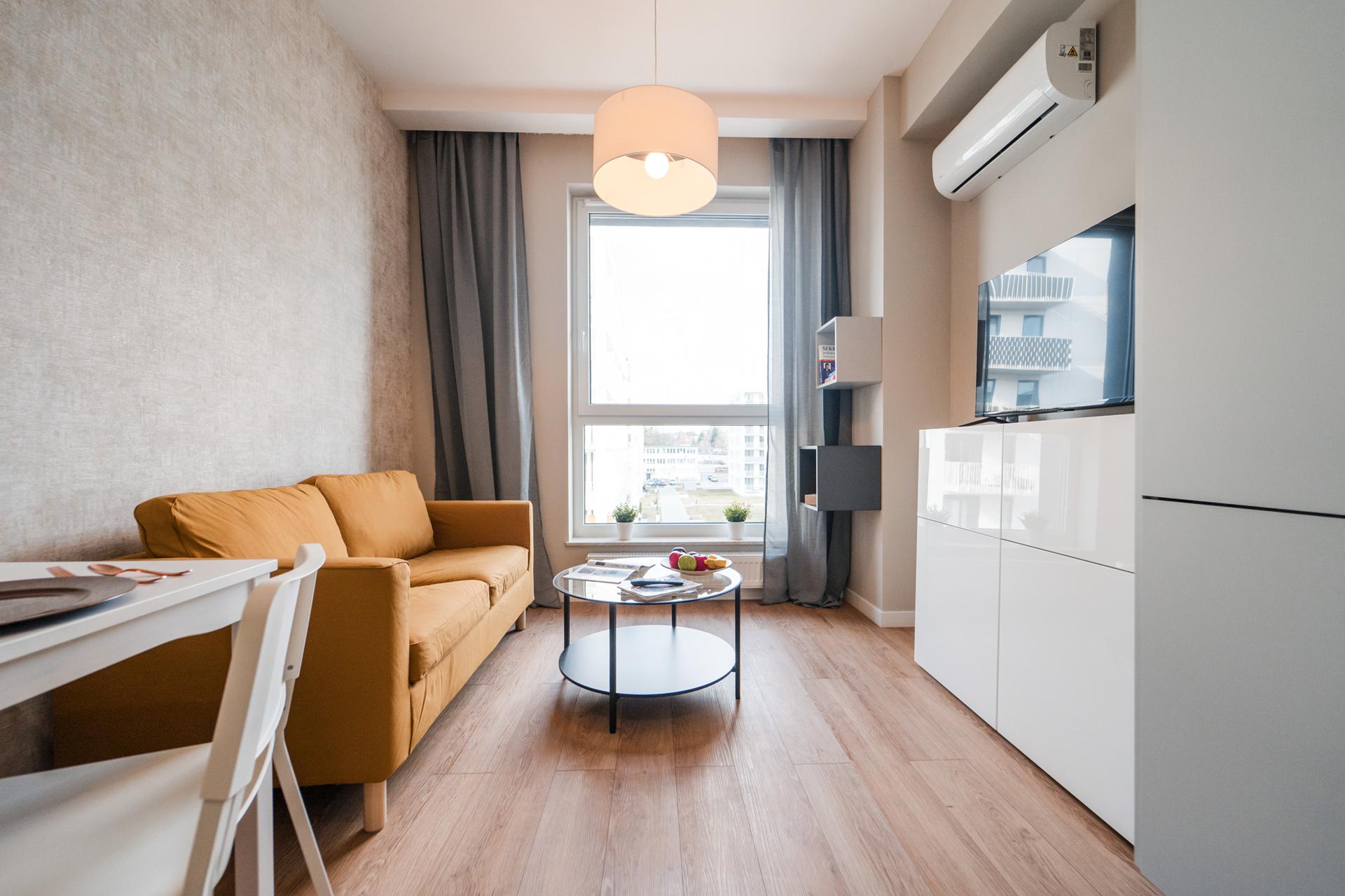 ☀️ Jasne, klimatyzowane mieszkanie z bardzo komfortową, rozkładaną sofą, pojemną komodą oraz TV z funkcją Smart