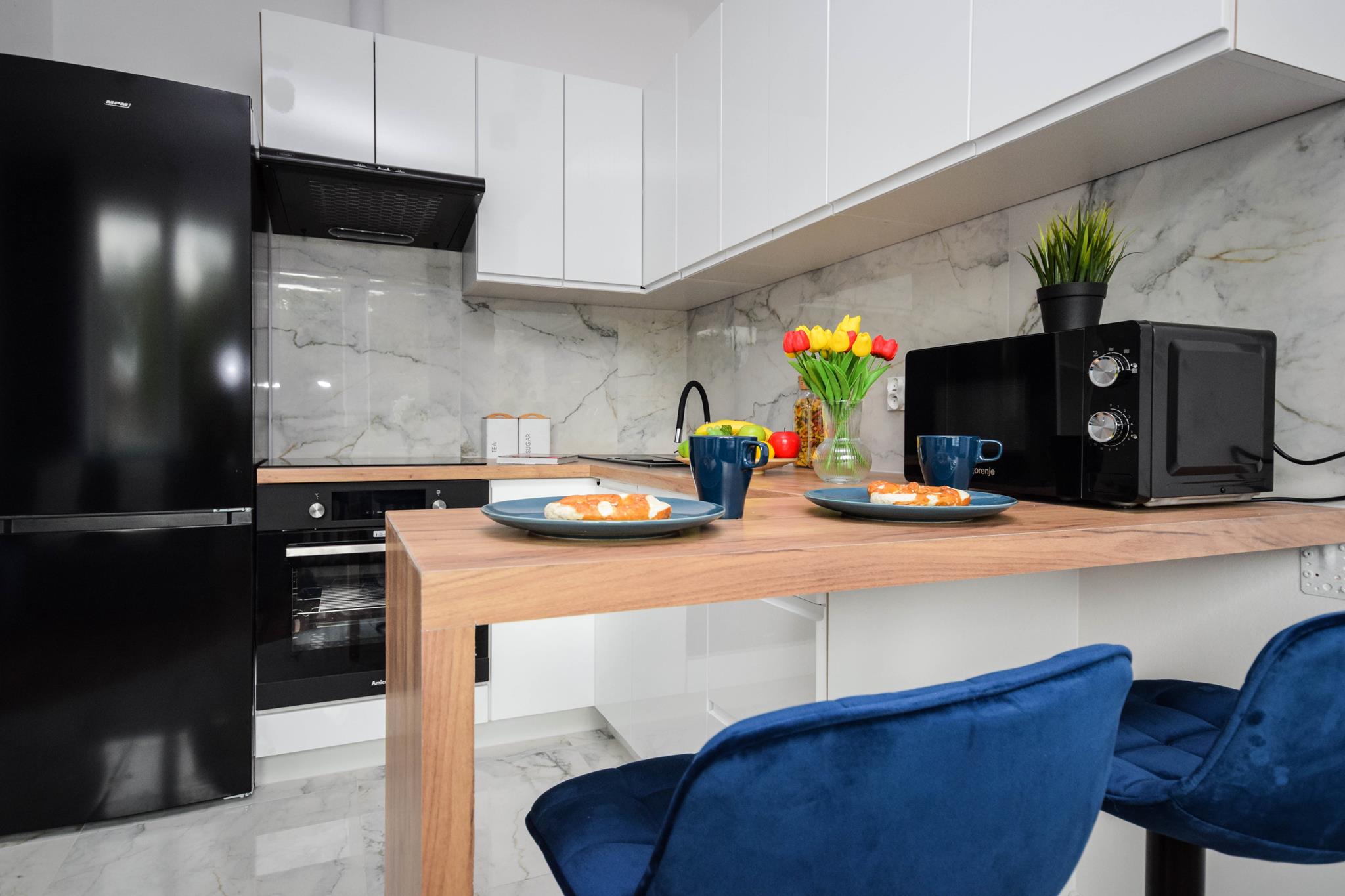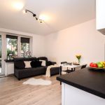 W mieszkaniu znajdziesz salon z wygodną, rozkładaną sofą, pojemną komodą i dużą szafą z lustrami. W salonie znajduje się również TV. Aneks kuchenny z miejscem do jedzenia posiłków, wraz z pełnym wyposażeniem takim jak: