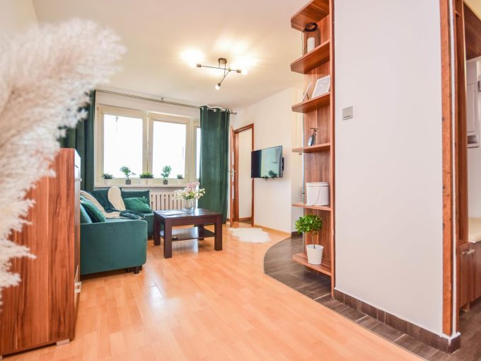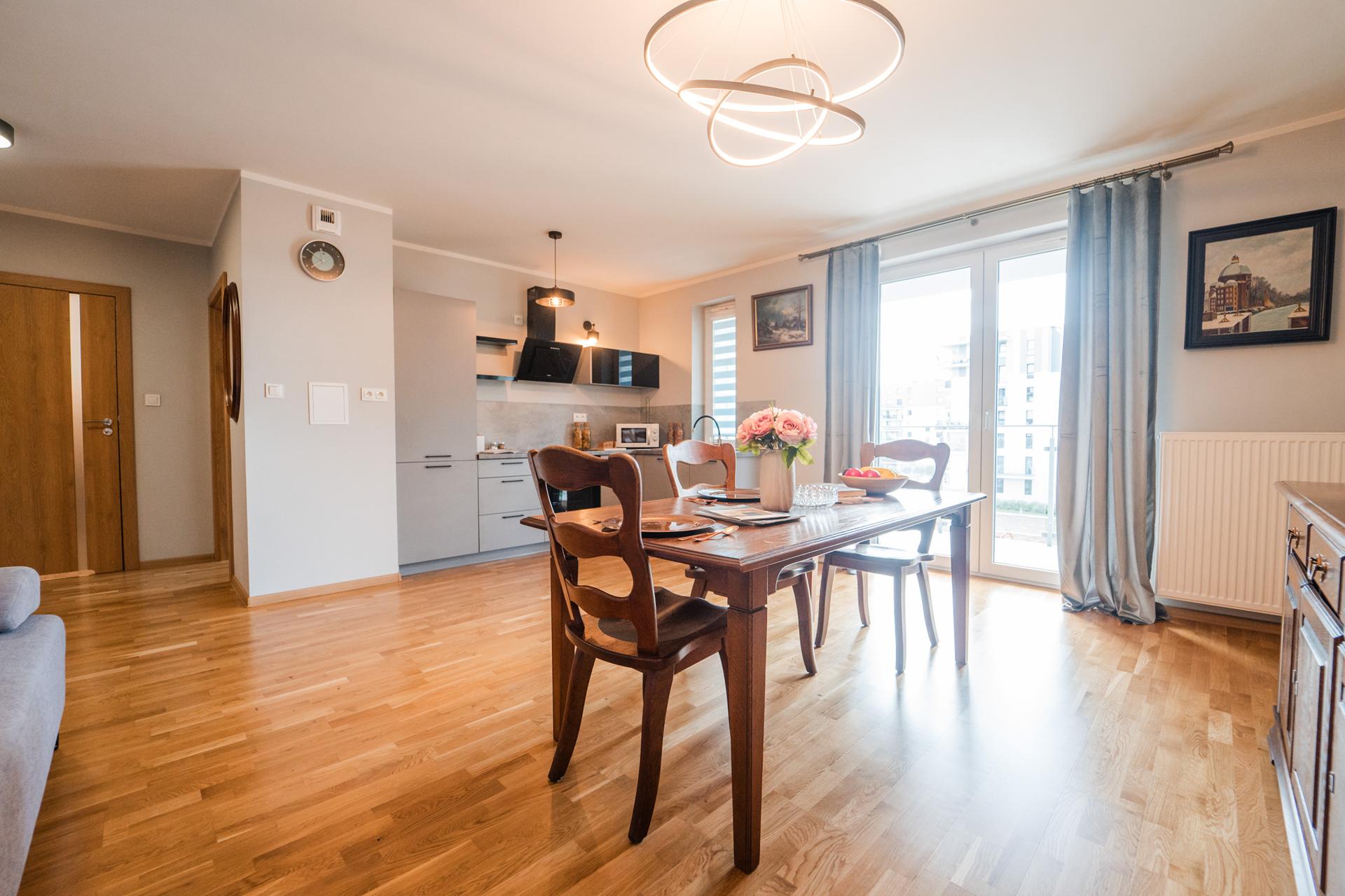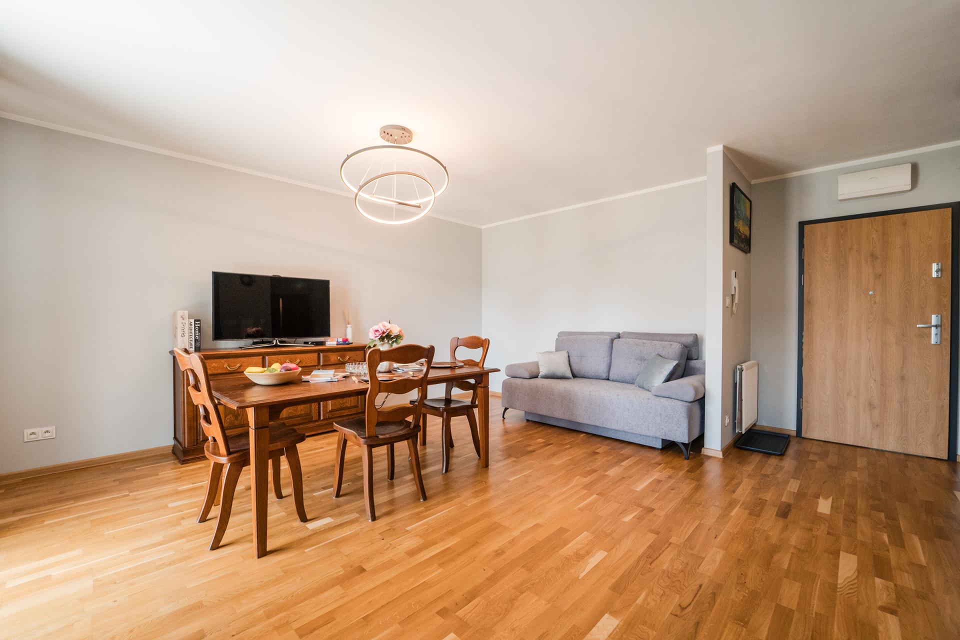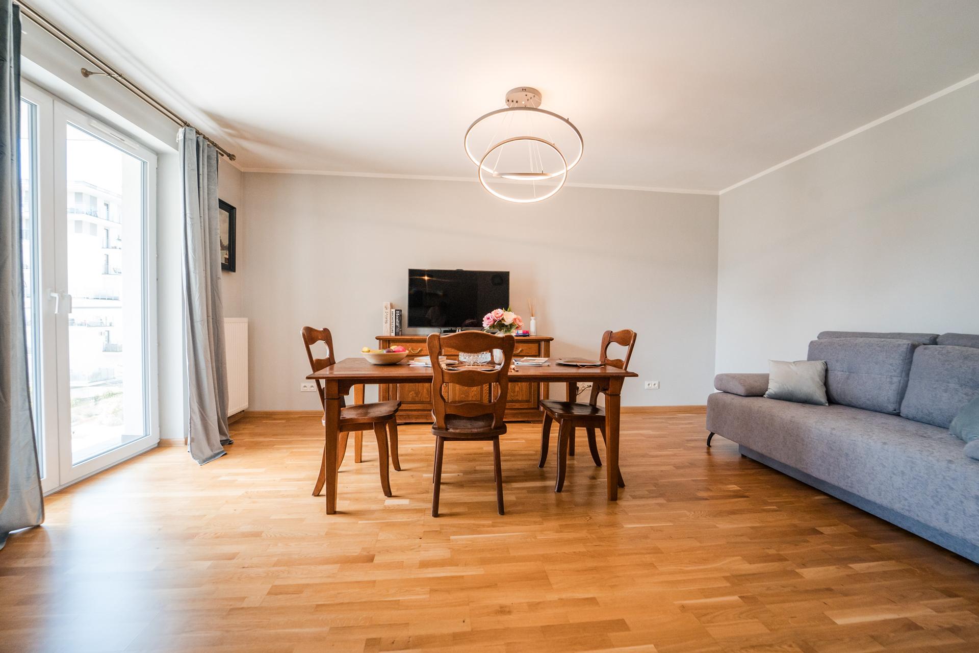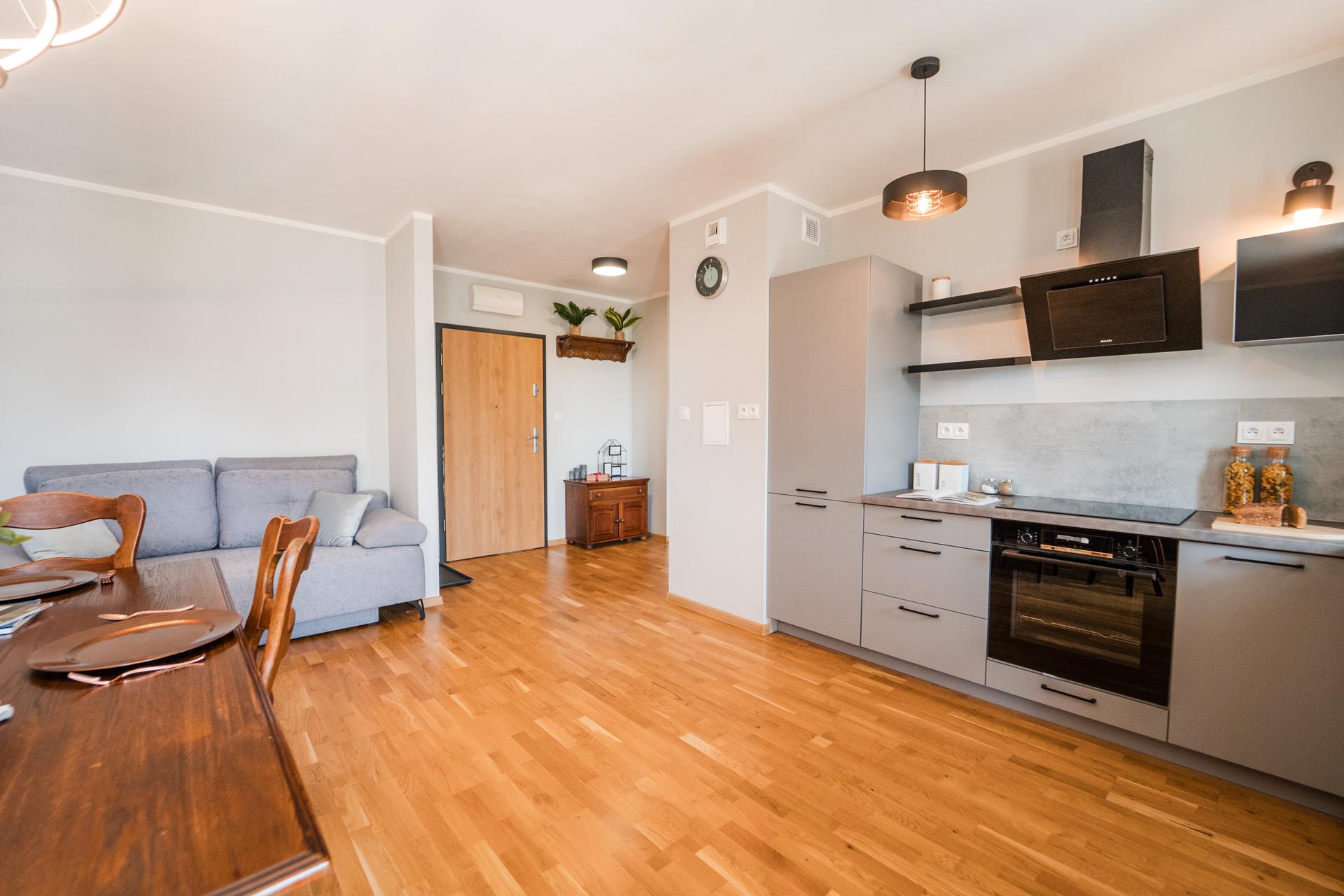 W mieszkaniu znajdziesz przedpokój z szafkami do przechowywania oraz lustrem. Duży salon z częścią wypoczynkową z rozkładaną sofą, komodą z TV, stołem jadalnym wraz z krzesłami do jedzenia wspólnych posiłków, z salonu wychodzi również wyjście na duży balkon, gdzie można spędzić czas na świeżym powietrzu. Przestronna kuchnia, w której znajdziesz wszystkie niezbędne sprzęty AGD, takie jak:
