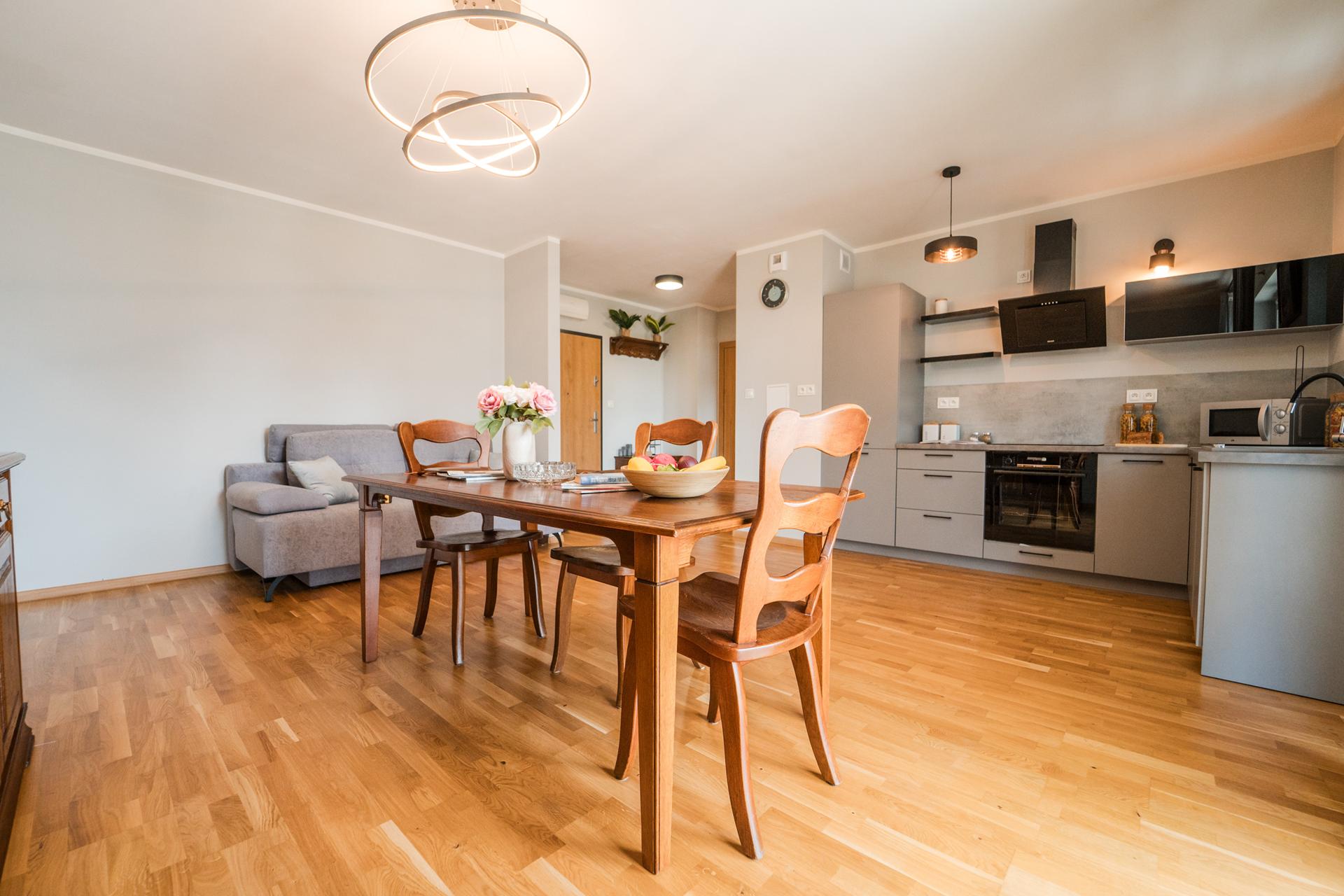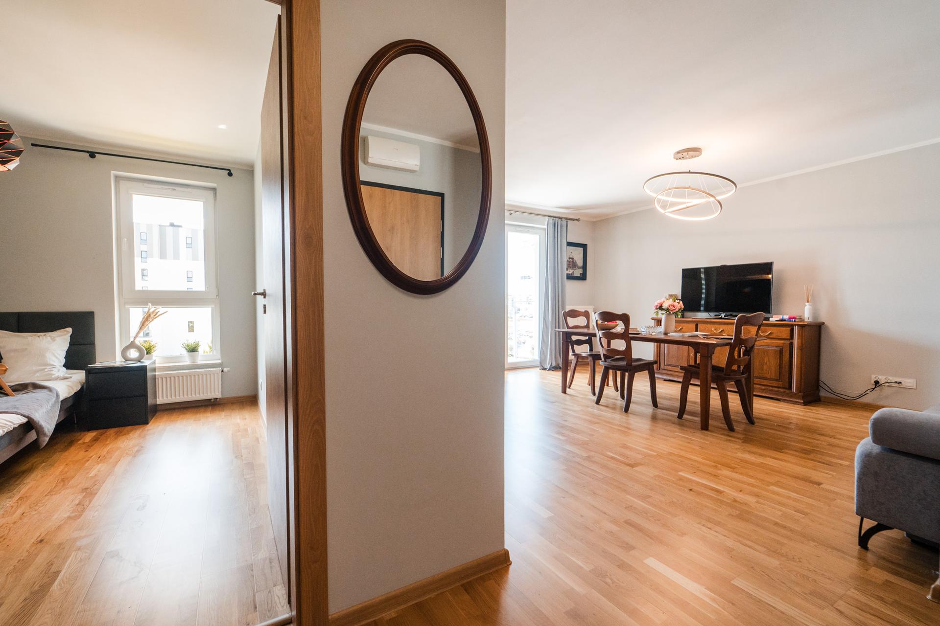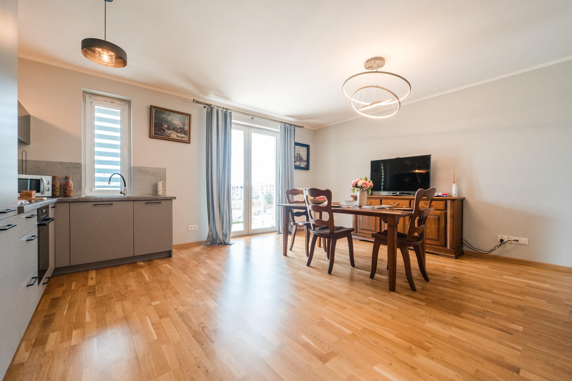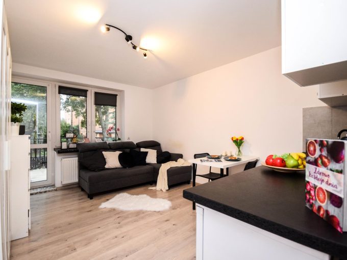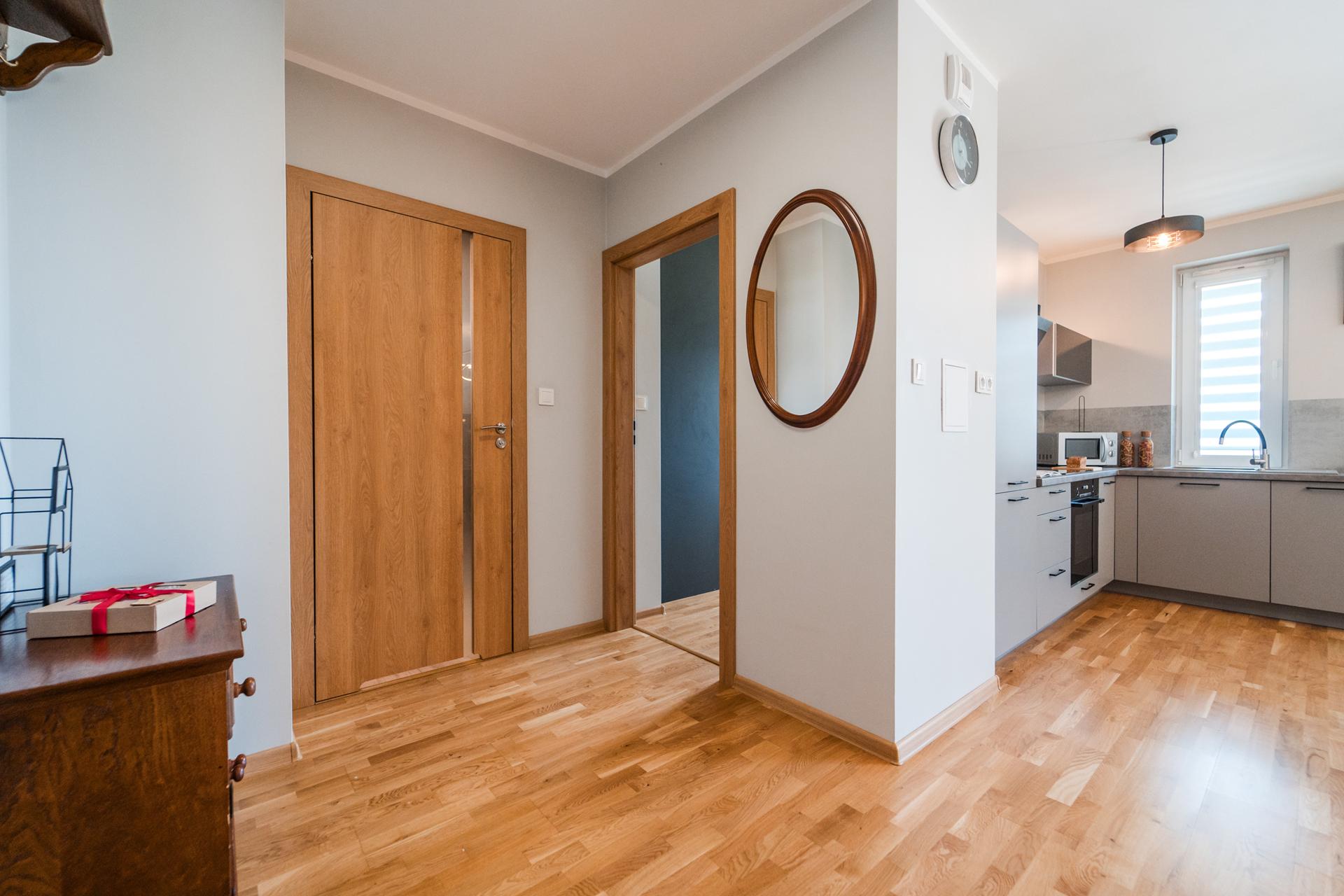 W mieszkaniu znajdziesz przedpokój z szafkami do przechowywania oraz lustrem. Duży salon z częścią wypoczynkową z rozkładaną sofą, komodą z TV, stołem jadalnym wraz z krzesłami do jedzenia wspólnych posiłków, z salonu wychodzi również wyjście na duży balkon, gdzie można spędzić czas na świeżym powietrzu. Przestronna kuchnia, w której znajdziesz wszystkie niezbędne sprzęty AGD, takie jak: