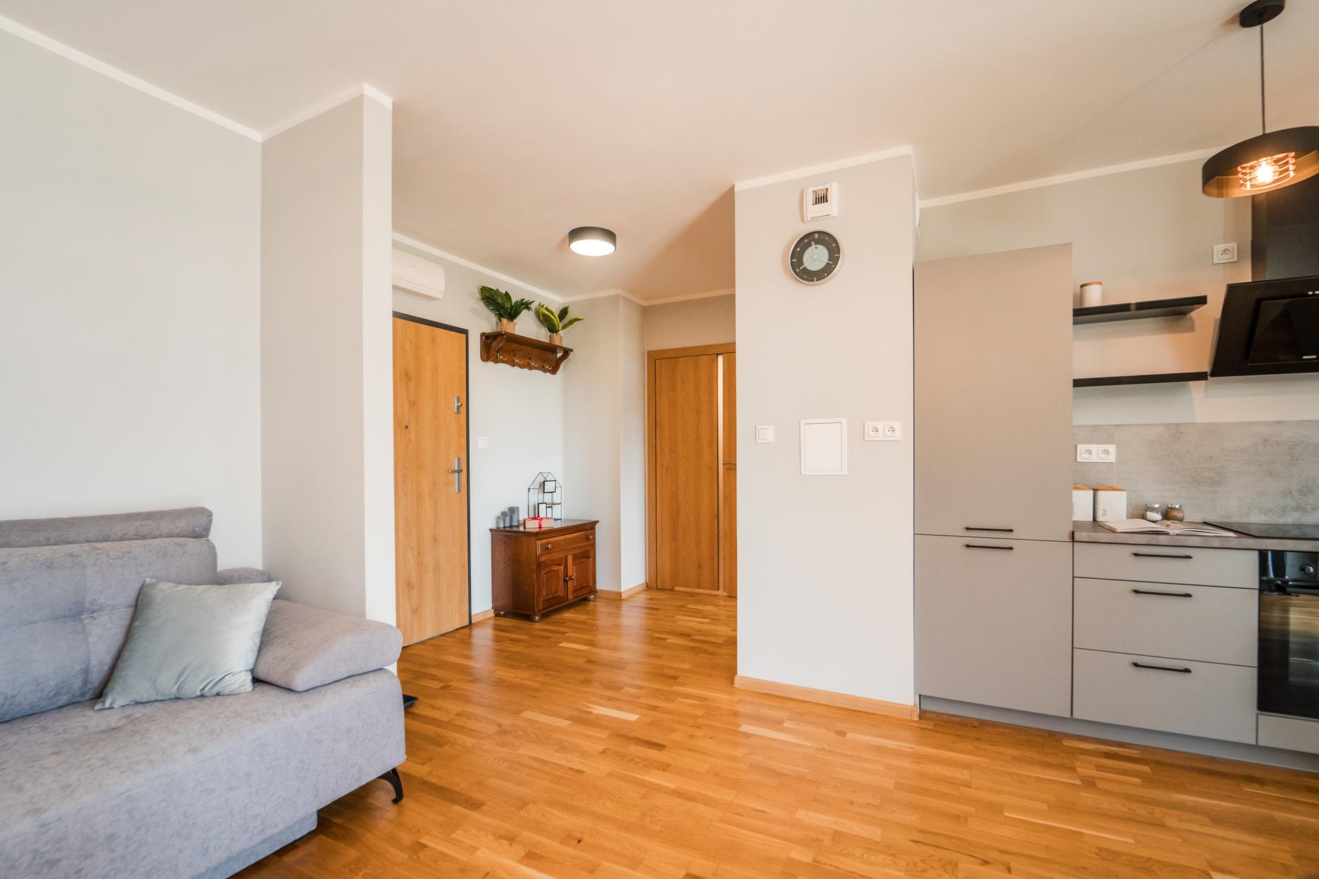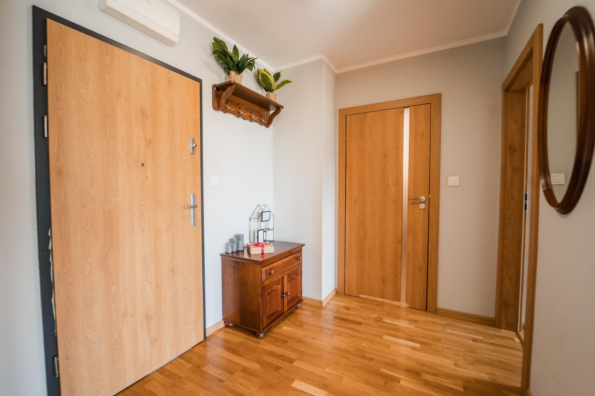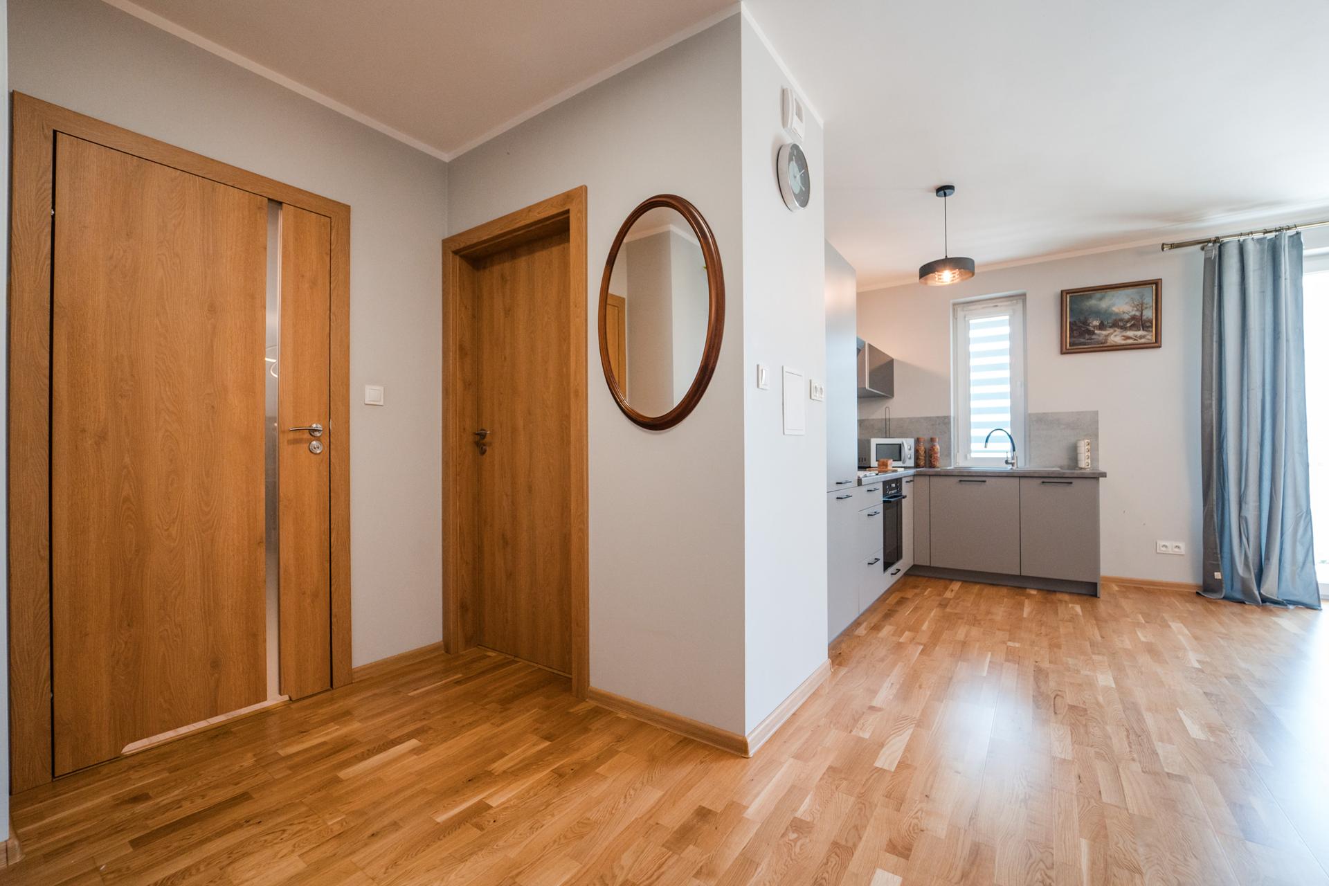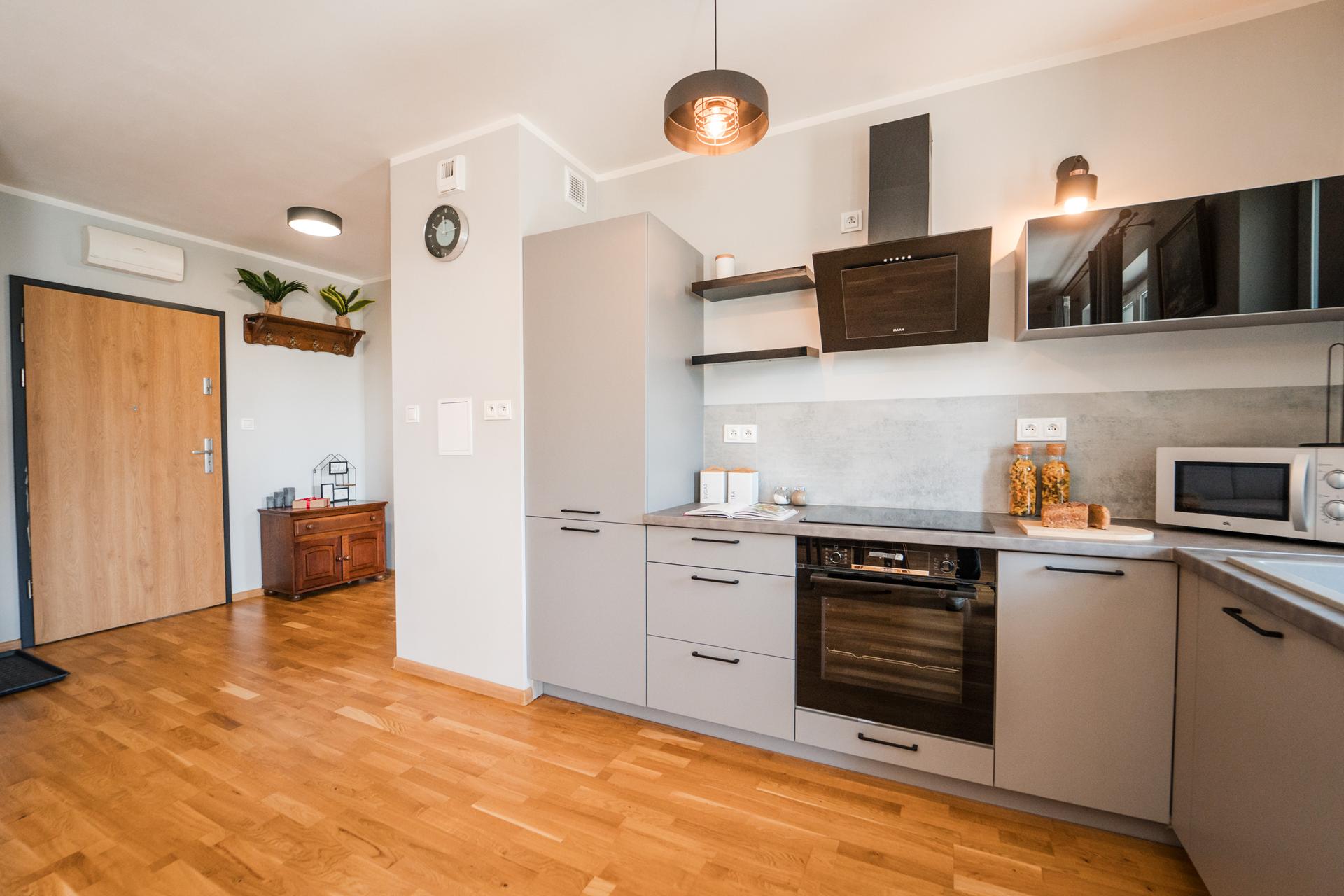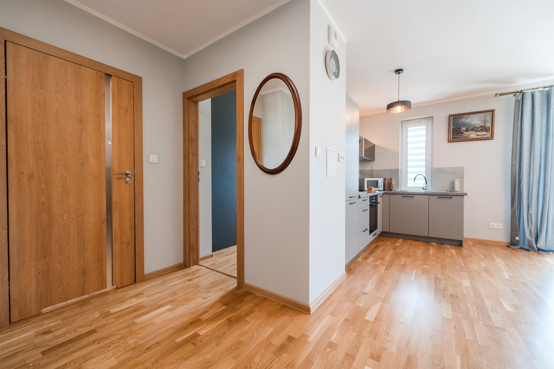 W mieszkaniu znajdziesz przedpokój z szafkami do przechowywania oraz lustrem. Duży salon z częścią wypoczynkową z rozkładaną sofą, komodą z TV, stołem jadalnym wraz z krzesłami do jedzenia wspólnych posiłków, z salonu wychodzi również wyjście na duży balkon, gdzie można spędzić czas na świeżym powietrzu. Przestronna kuchnia, w której znajdziesz wszystkie niezbędne sprzęty AGD, takie jak: