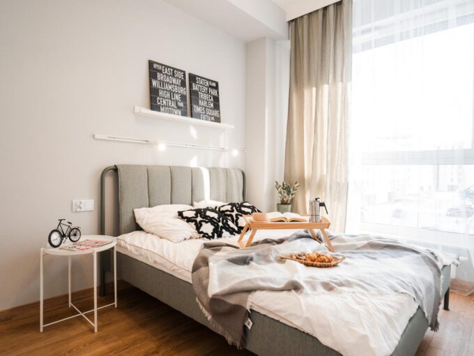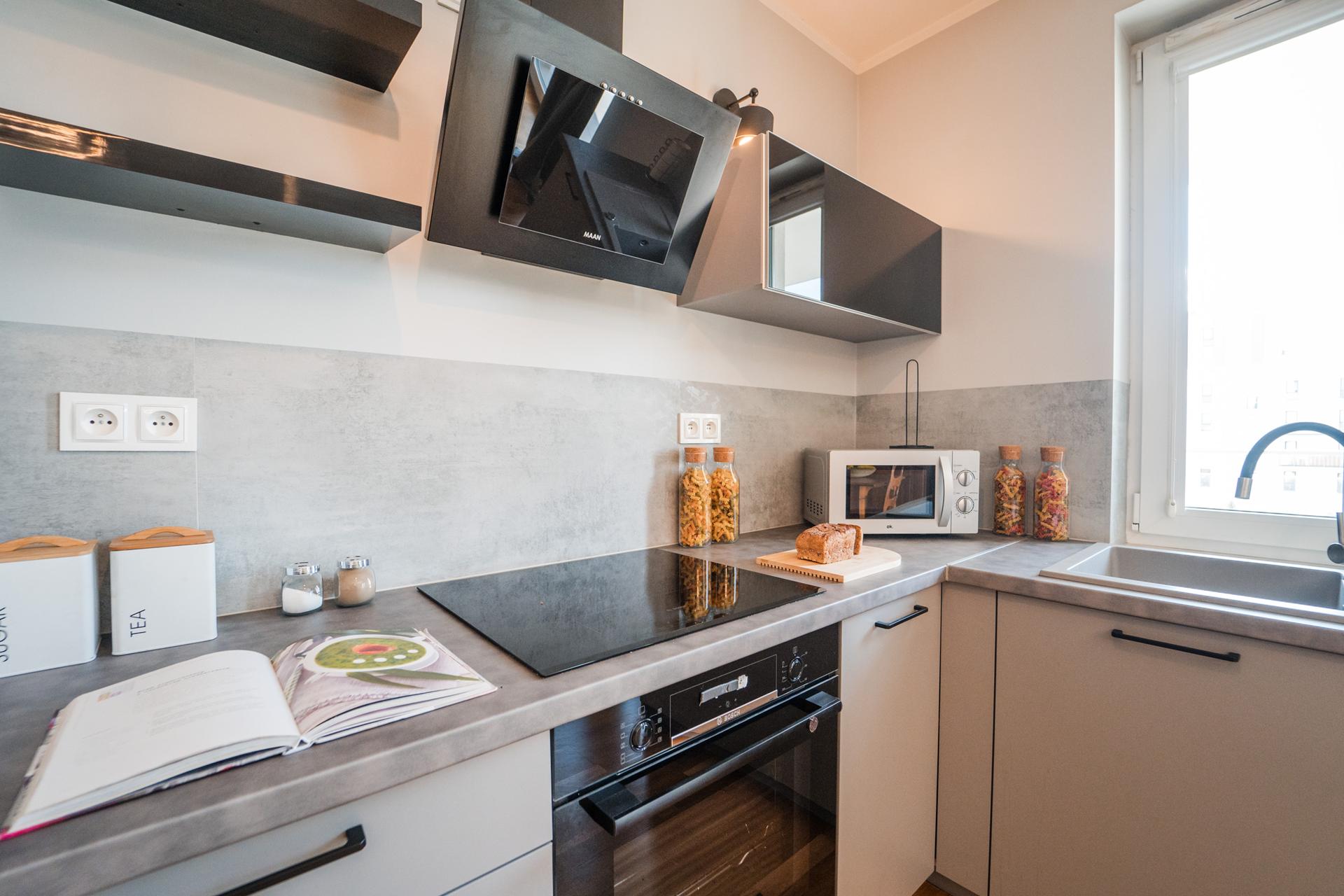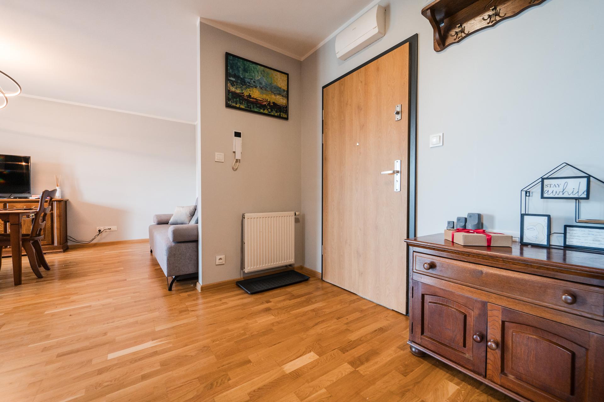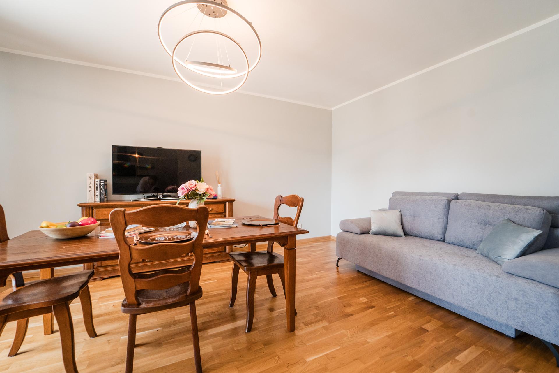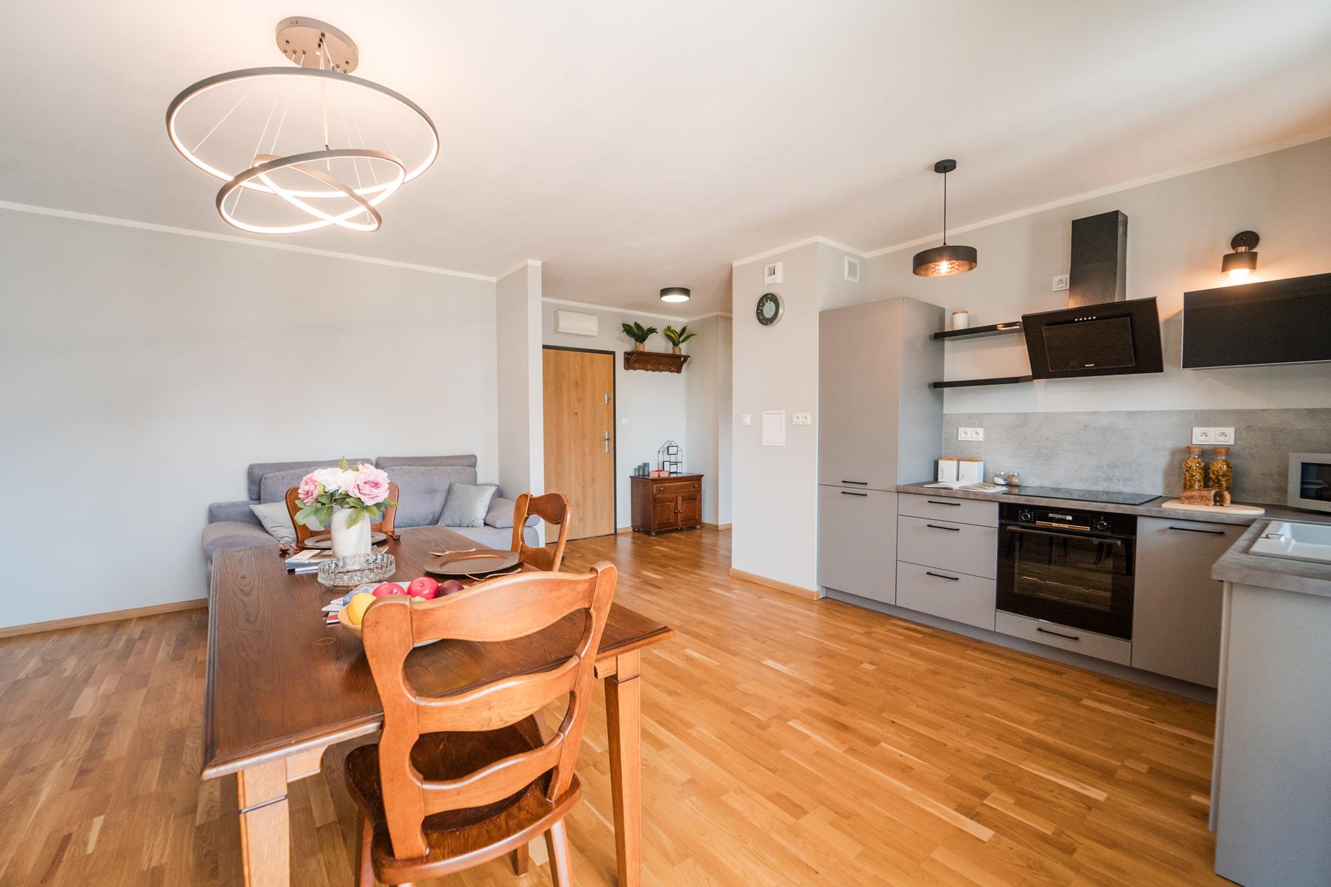 W mieszkaniu znajdziesz przedpokój z szafkami do przechowywania oraz lustrem. Duży salon z częścią wypoczynkową z rozkładaną sofą, komodą z TV, stołem jadalnym wraz z krzesłami do jedzenia wspólnych posiłków, z salonu wychodzi również wyjście na duży balkon, gdzie można spędzić czas na świeżym powietrzu. Przestronna kuchnia, w której znajdziesz wszystkie niezbędne sprzęty AGD, takie jak: