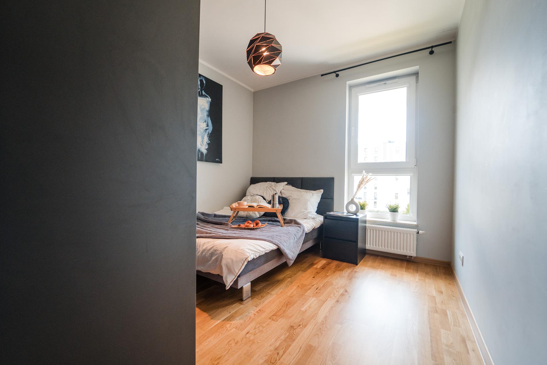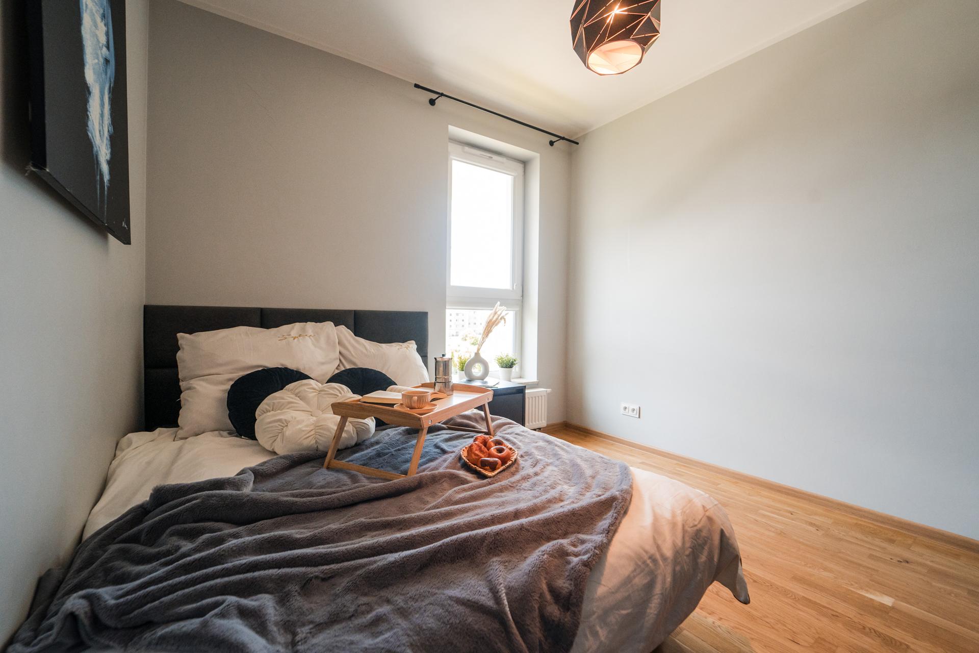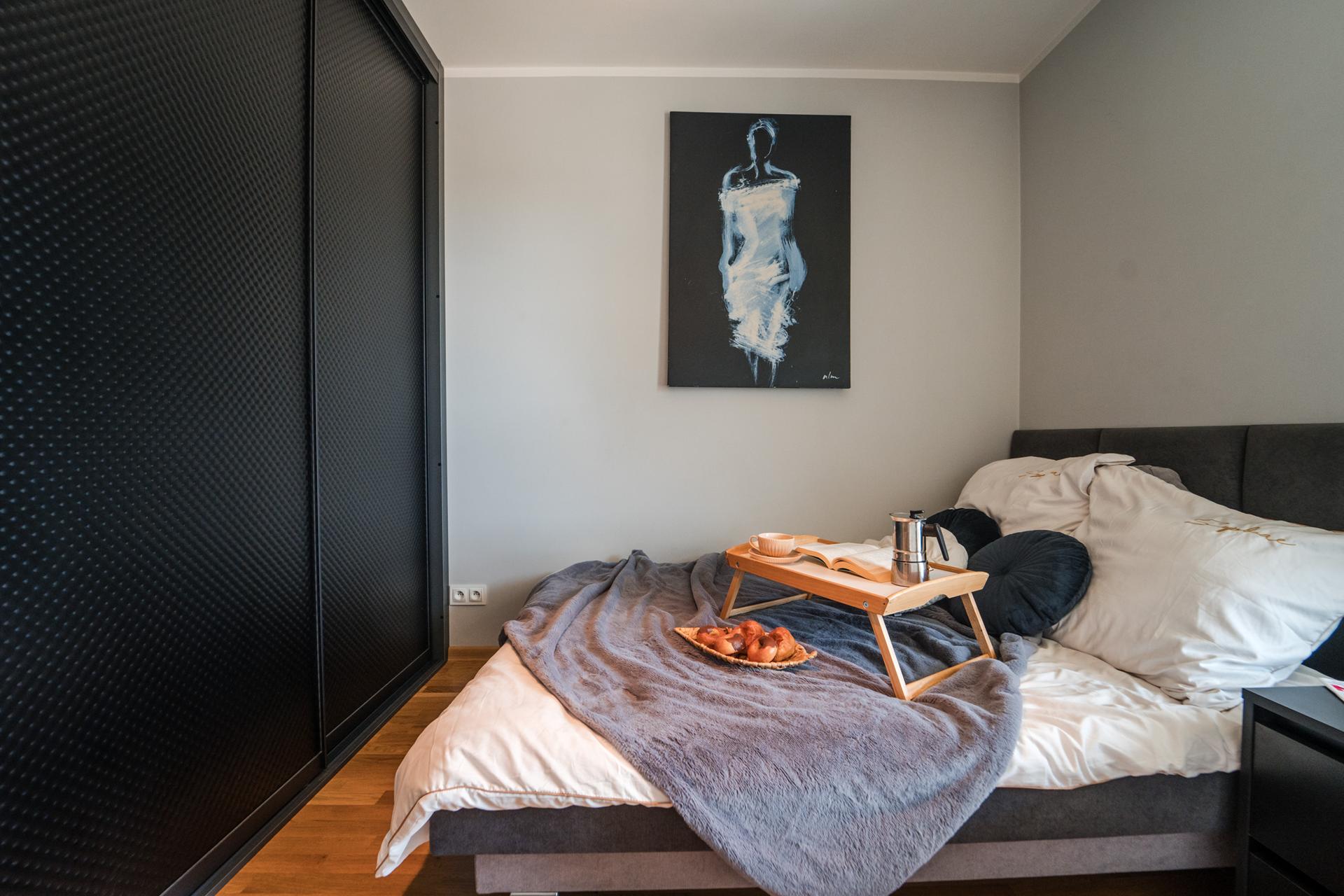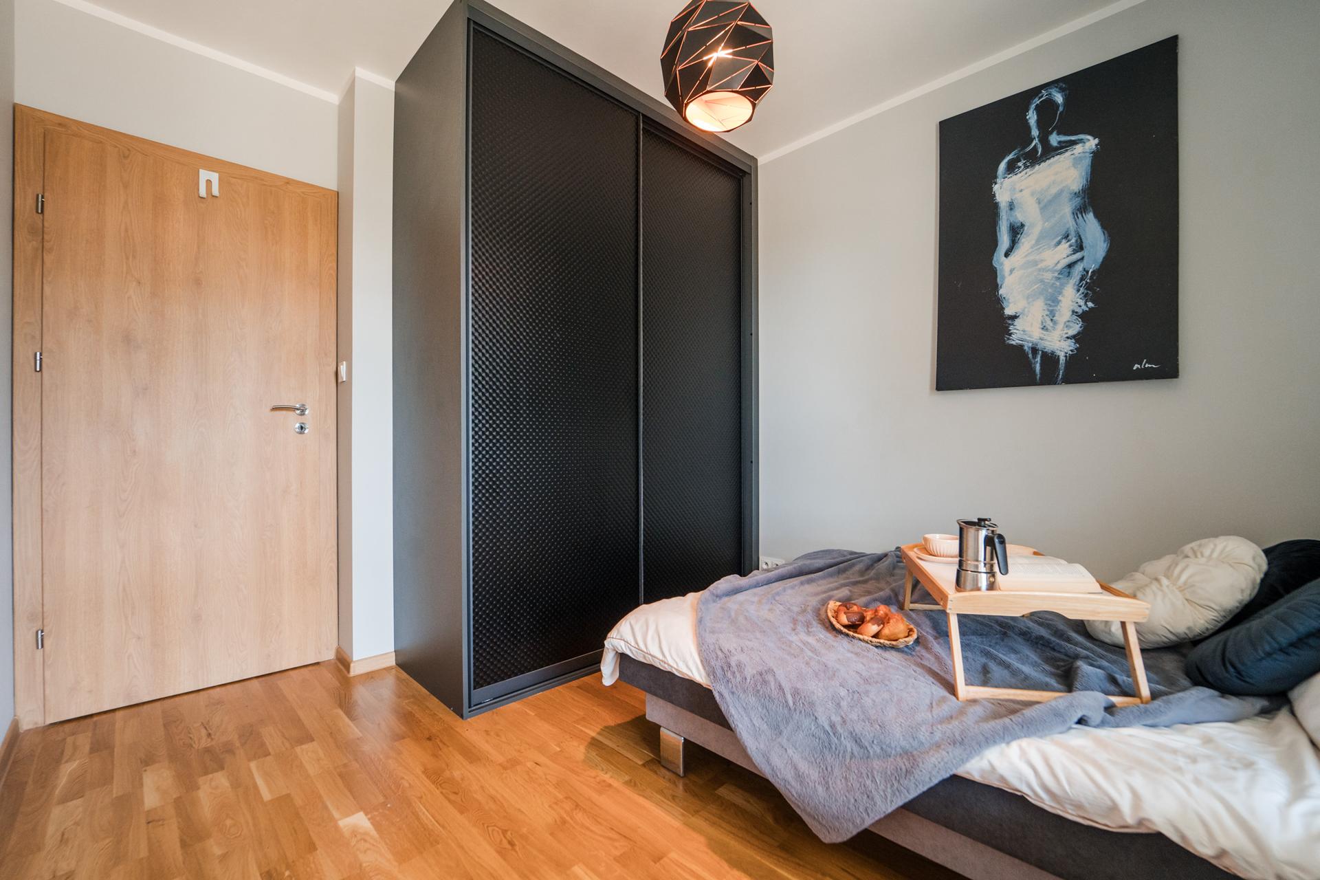 Przytulna sypialnia z dużym, wygodnym łóżkiem z materacem, oraz szafą do przechowywania rzeczy. W mieszkaniu przestronna łazienka z prysznicem oraz pralką.