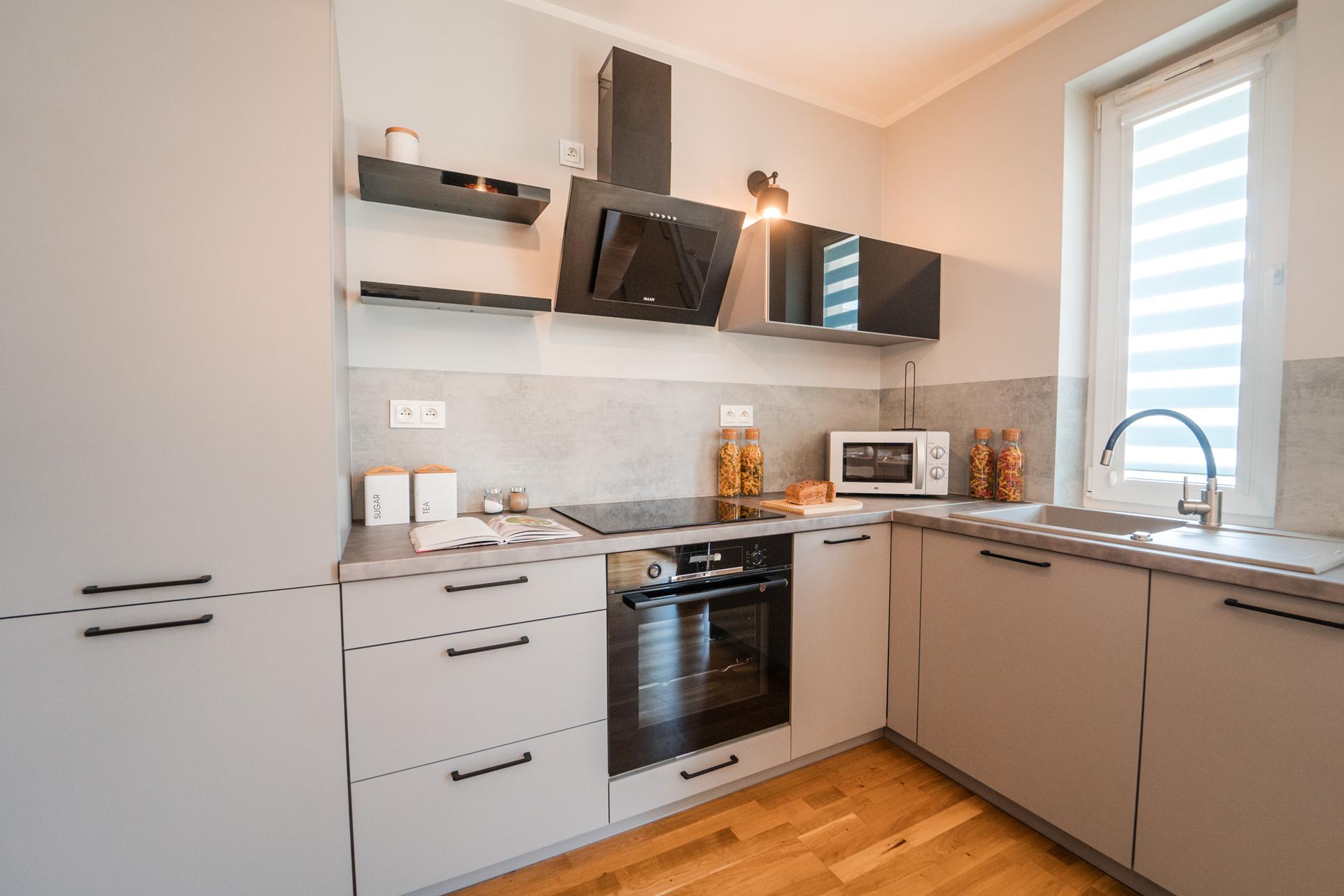 🍳 Kuchnia z pełnym wyposażeniem lodówko-zamrażarka, piekarnik, zmywarka, mikrofala oraz stół z krzesłami