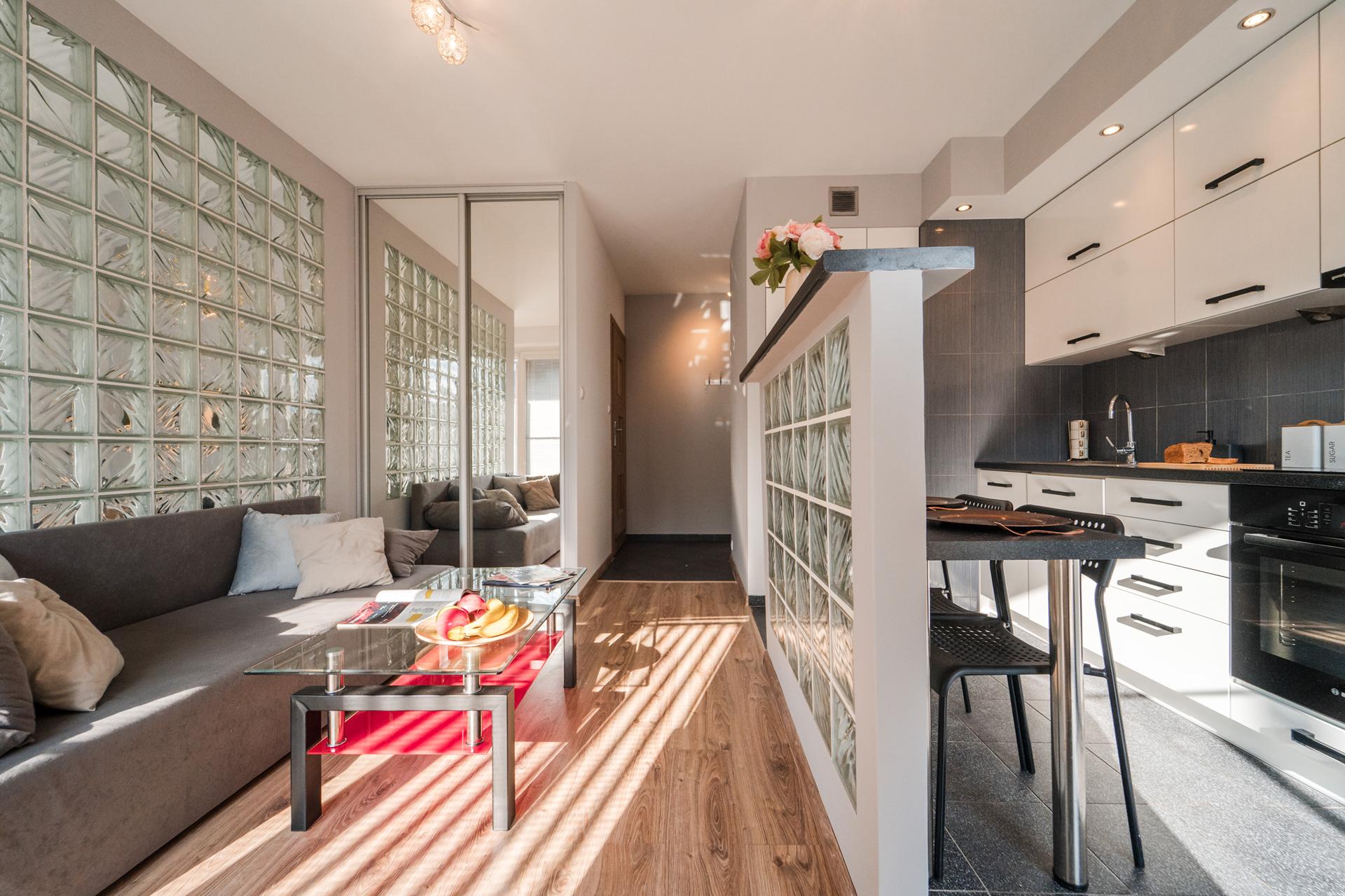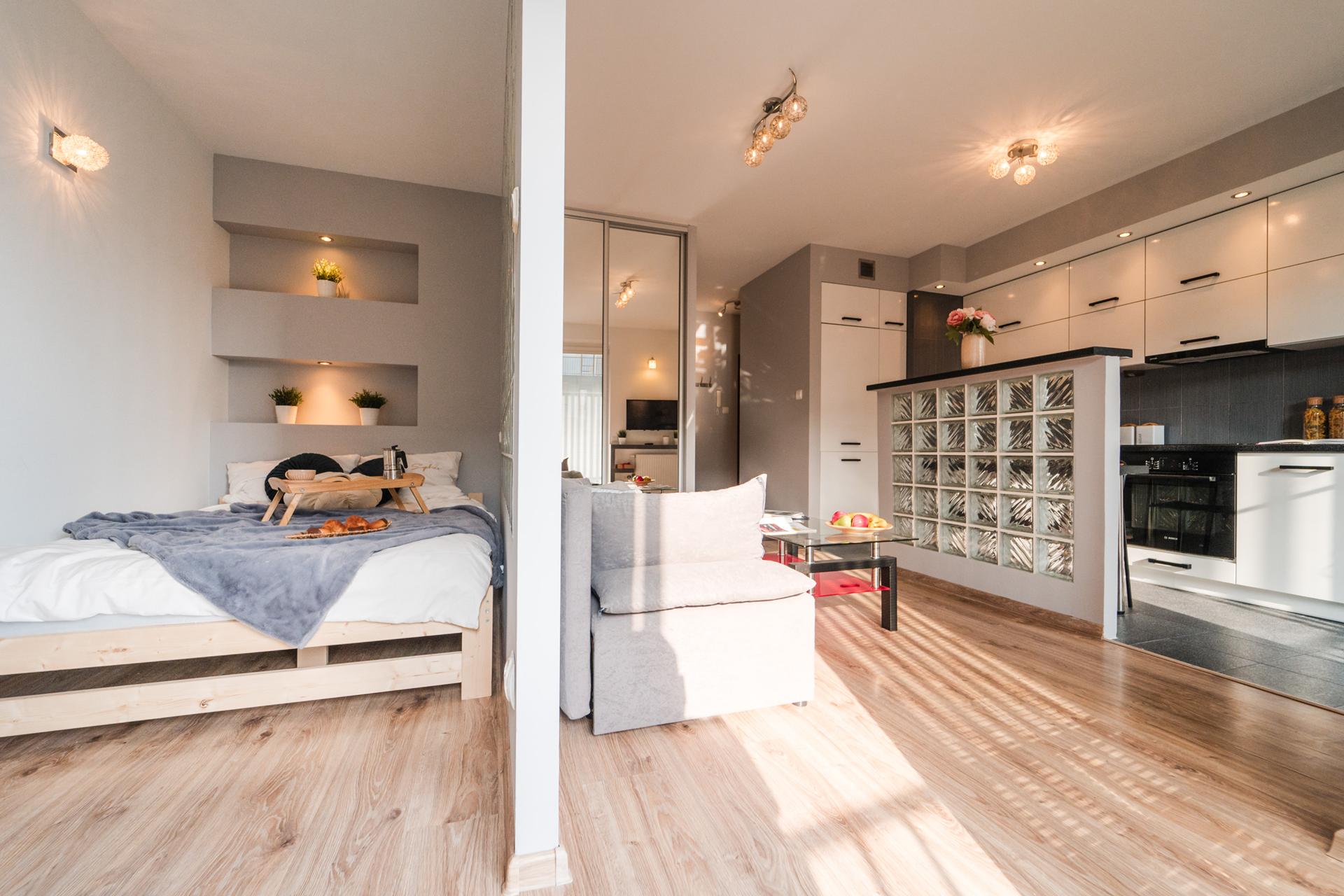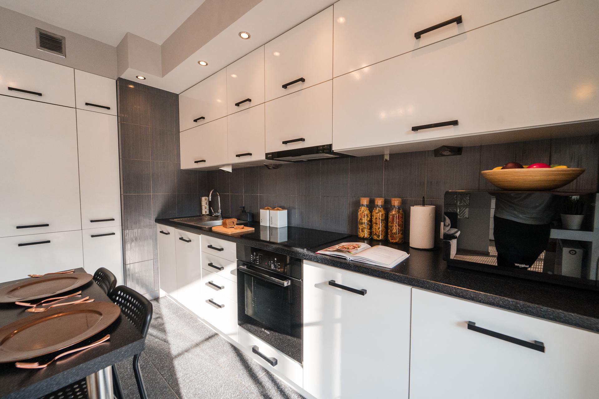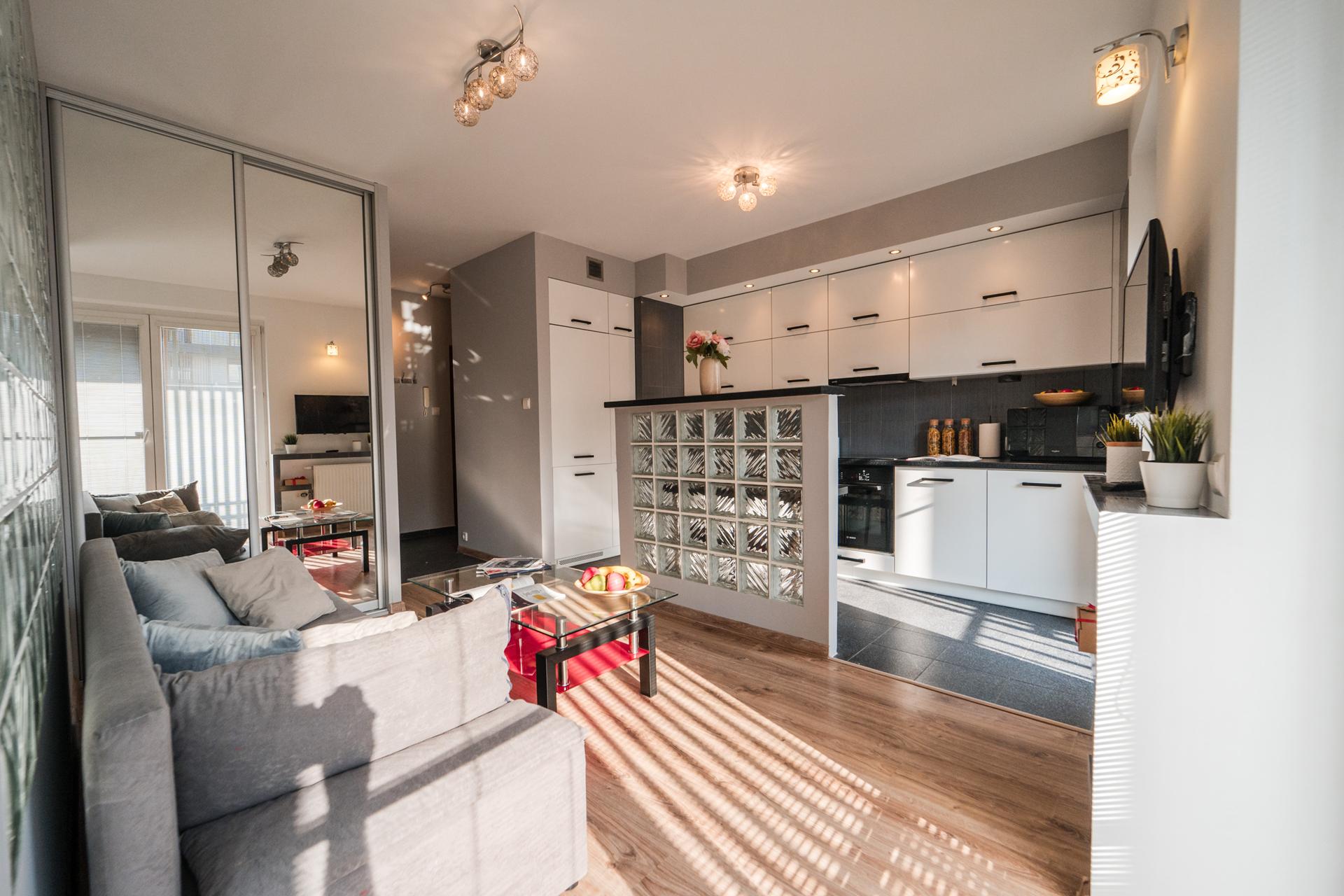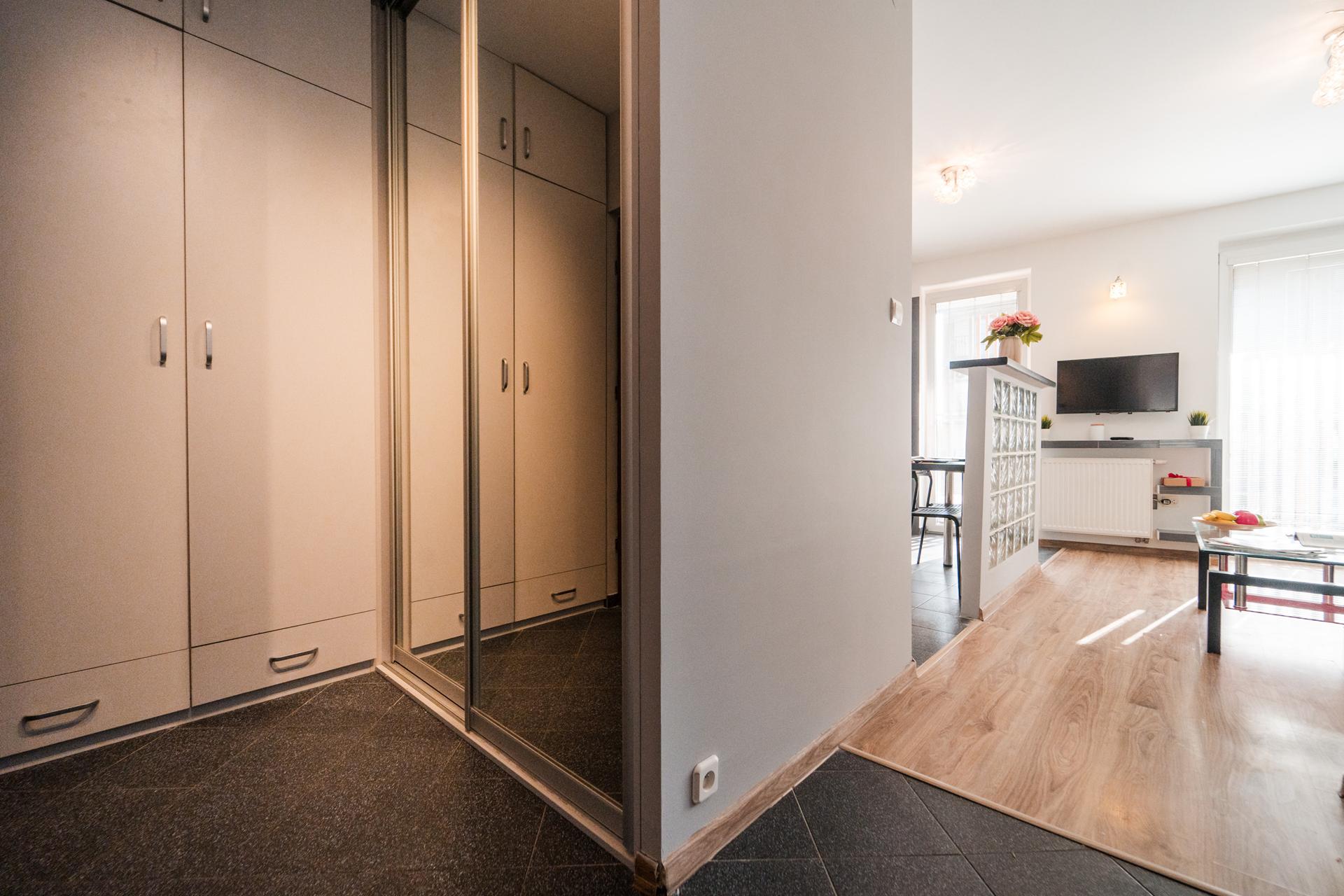 W mieszkaniu znajdziesz salon z wygodnym łóżkiem, dużą, pojemną szafą z lustrami oraz szafkami do przechowywania. Aneks kuchenny z miejscem do wygodnego zjedzenia posiłków wraz z pełnym wyposażeniem takim jak: