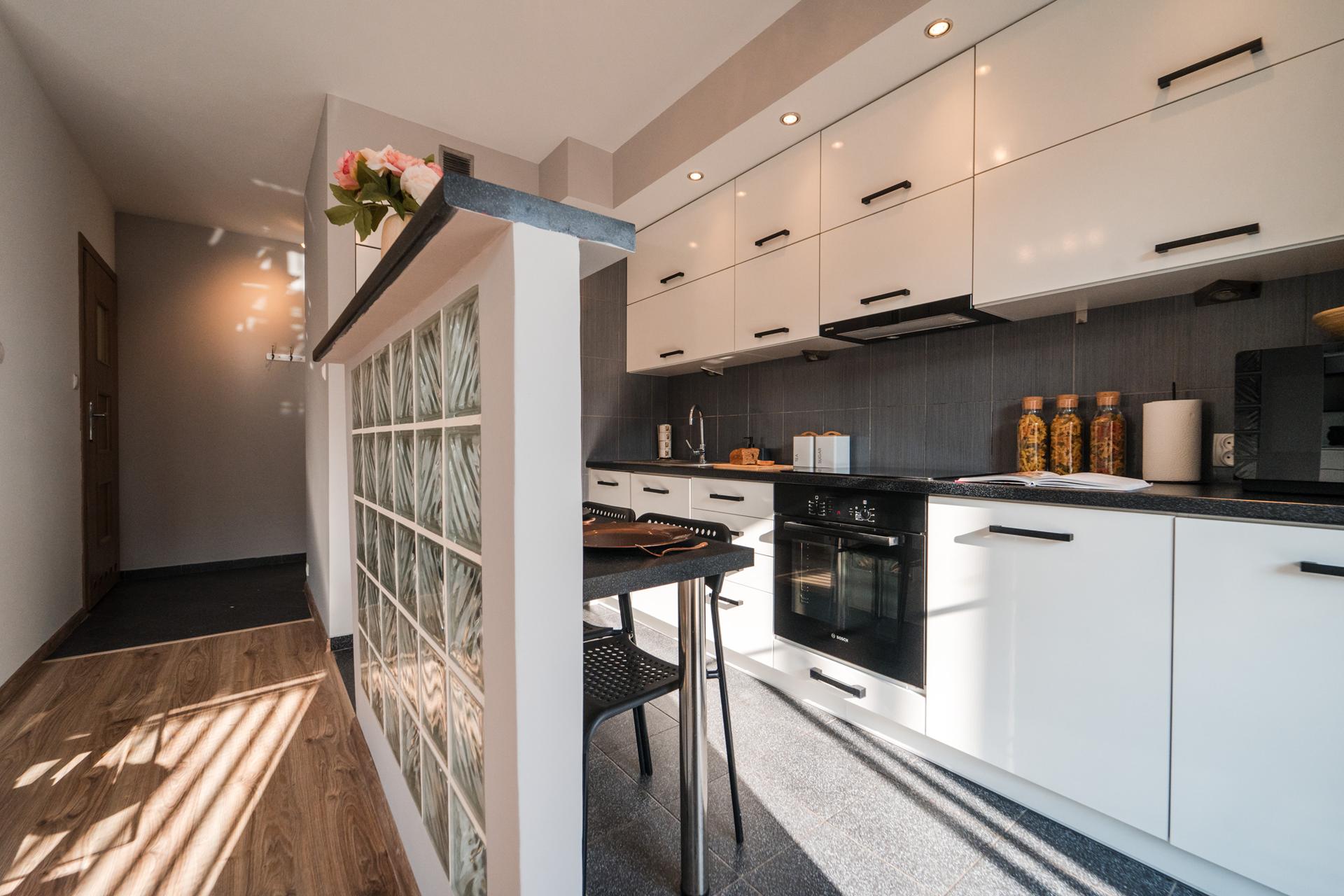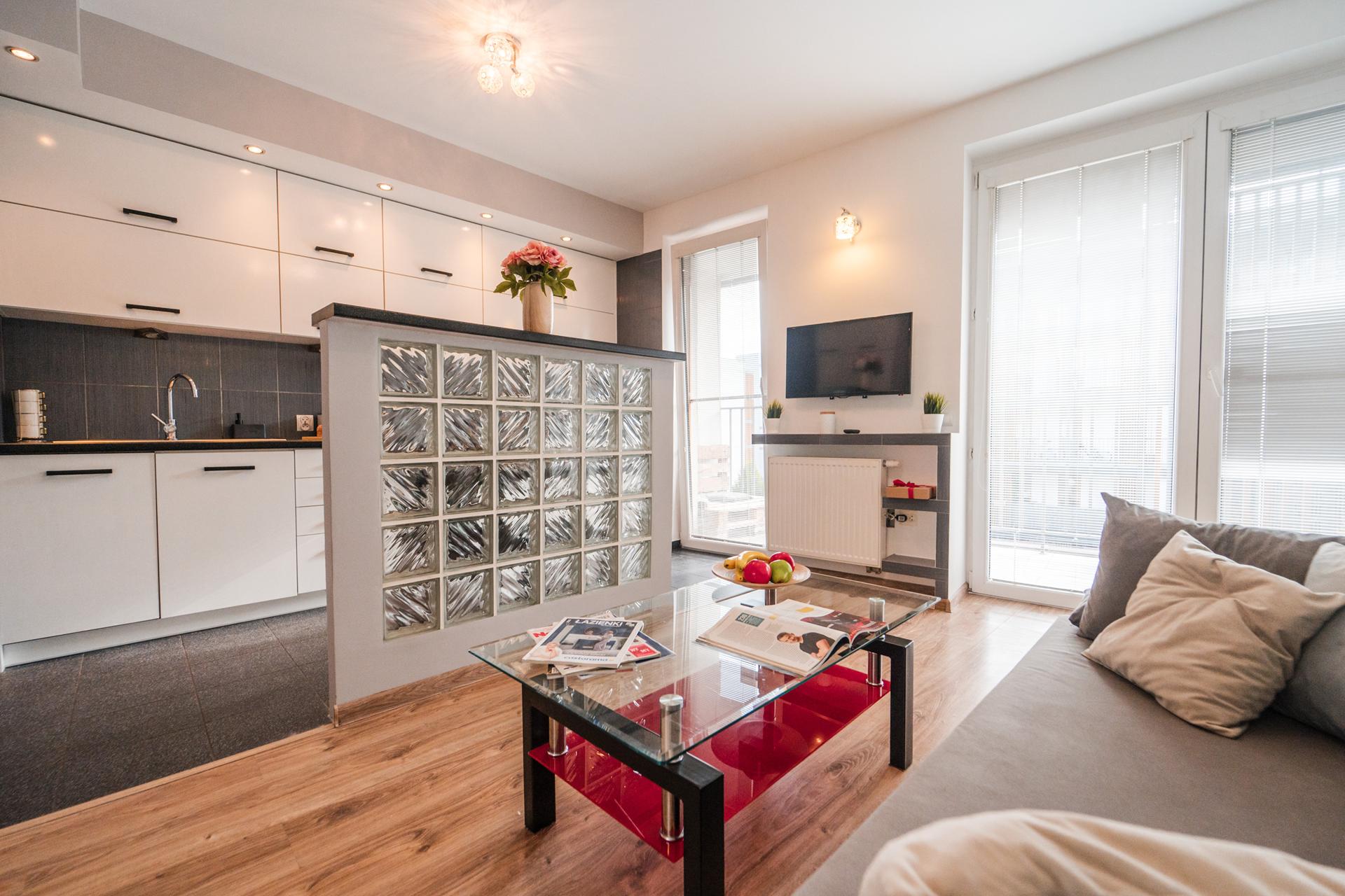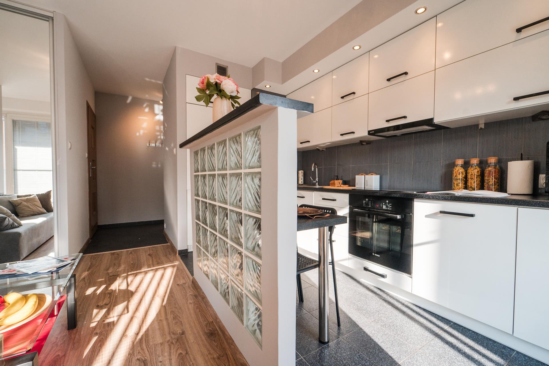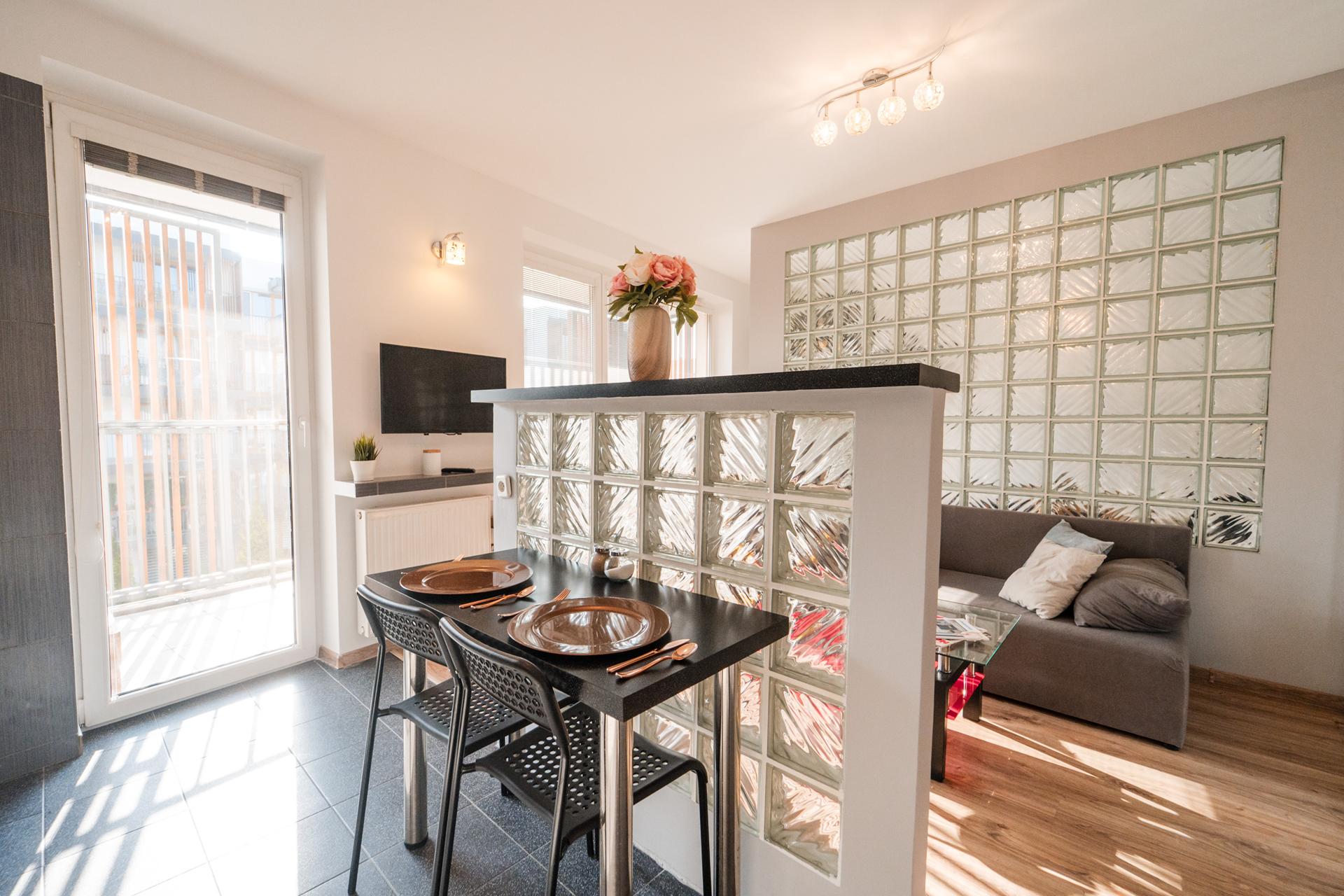 W mieszkaniu znajdziesz salon z wygodnym łóżkiem, dużą, pojemną szafą z lustrami oraz szafkami do przechowywania. Aneks kuchenny z miejscem do wygodnego zjedzenia posiłków wraz z pełnym wyposażeniem takim jak: