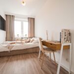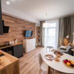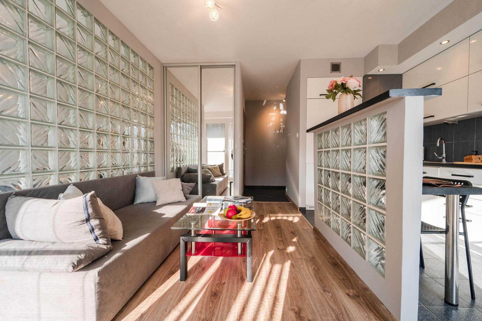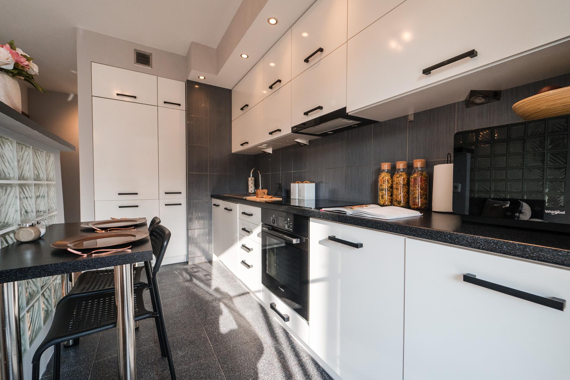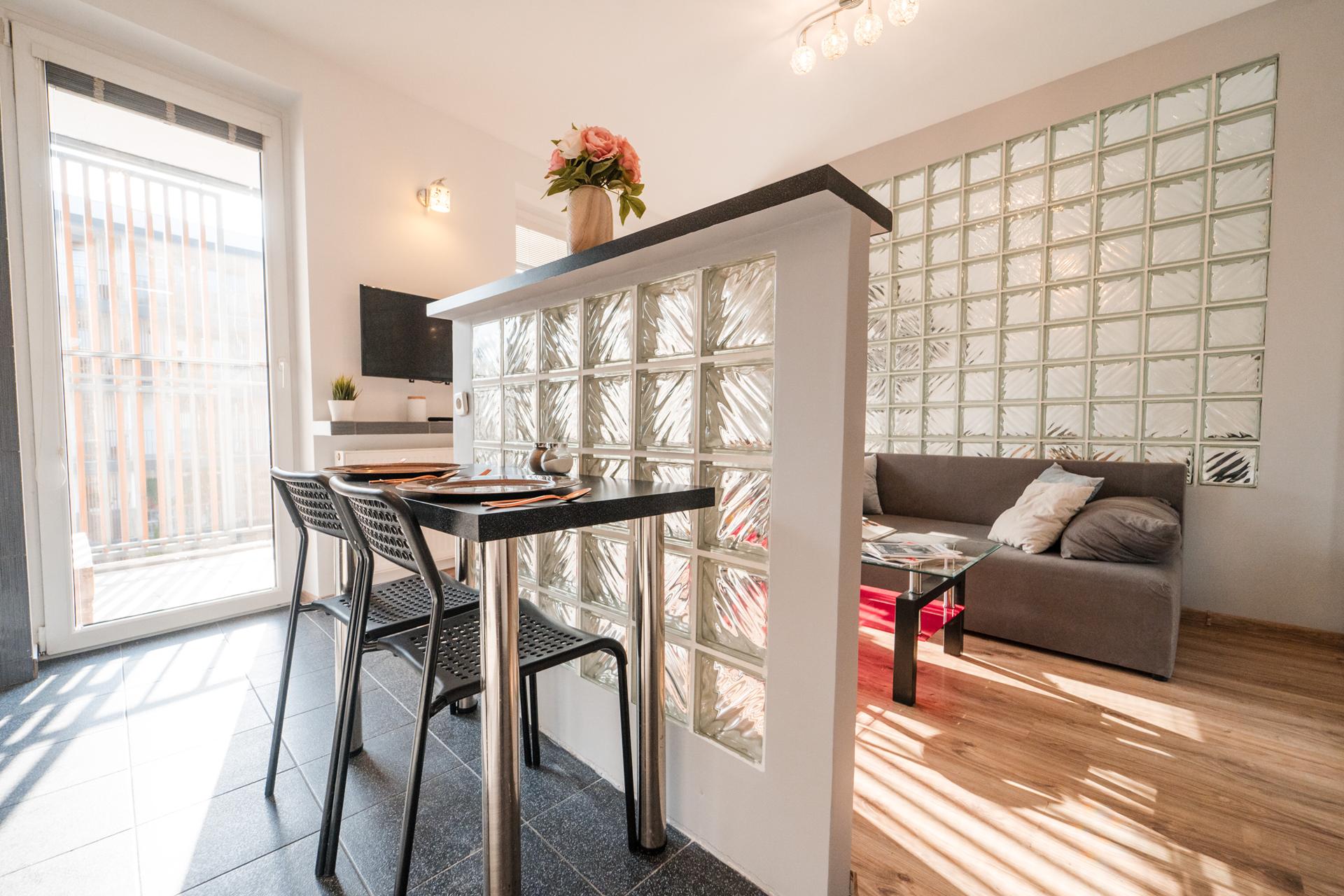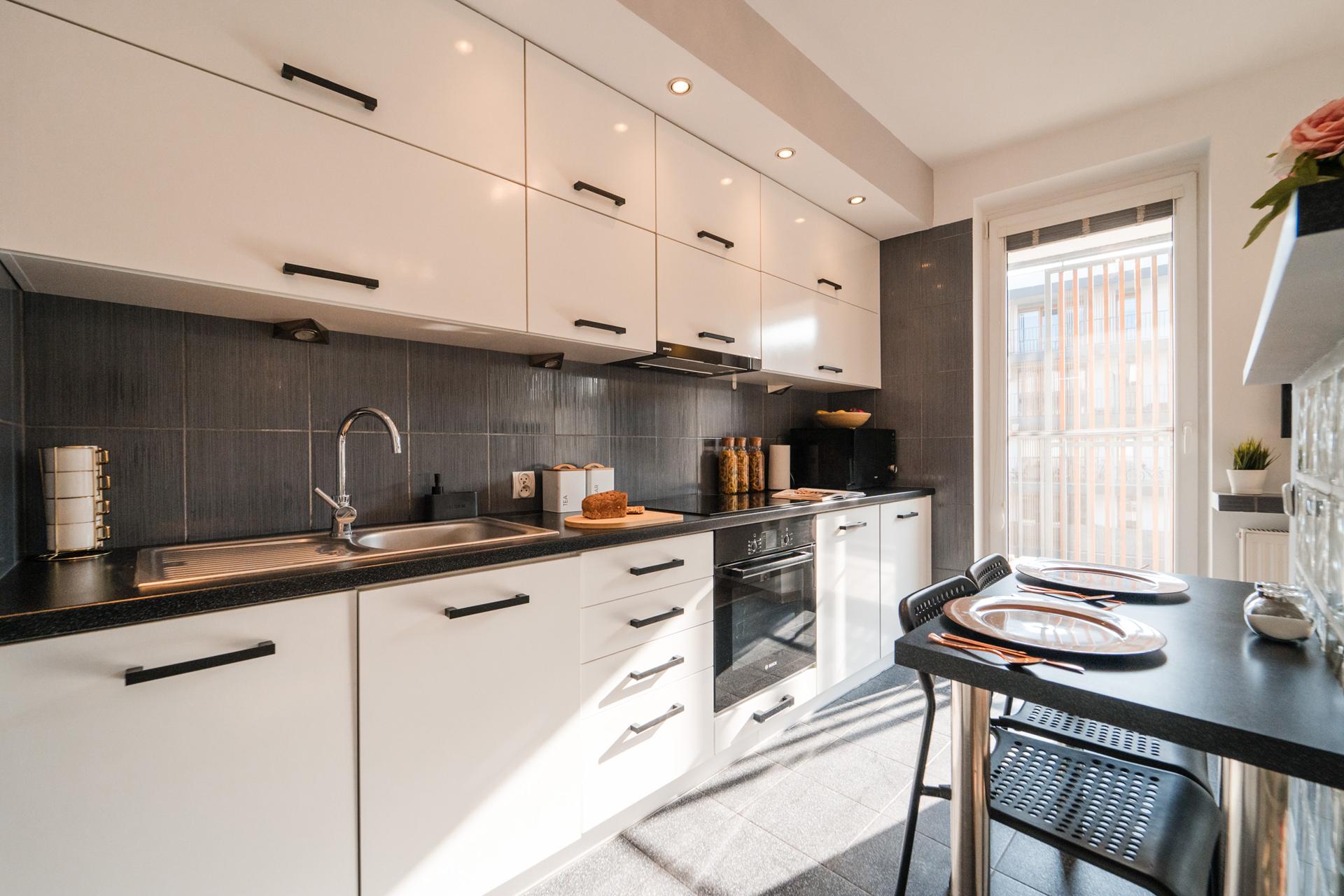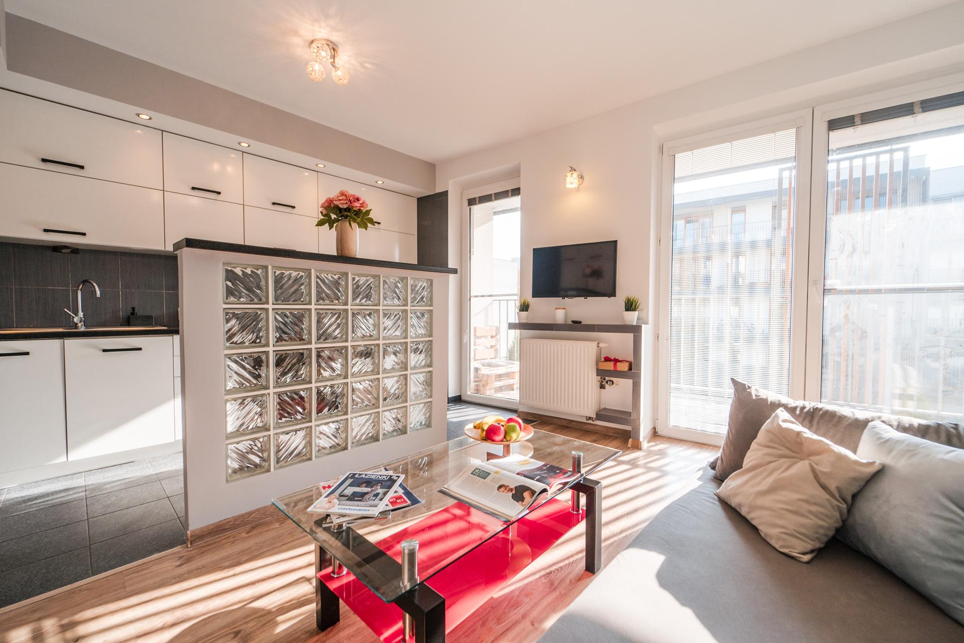 W mieszkaniu znajdziesz salon z wygodnym łóżkiem, dużą, pojemną szafą z lustrami oraz szafkami do przechowywania. Aneks kuchenny z miejscem do wygodnego zjedzenia posiłków wraz z pełnym wyposażeniem takim jak: