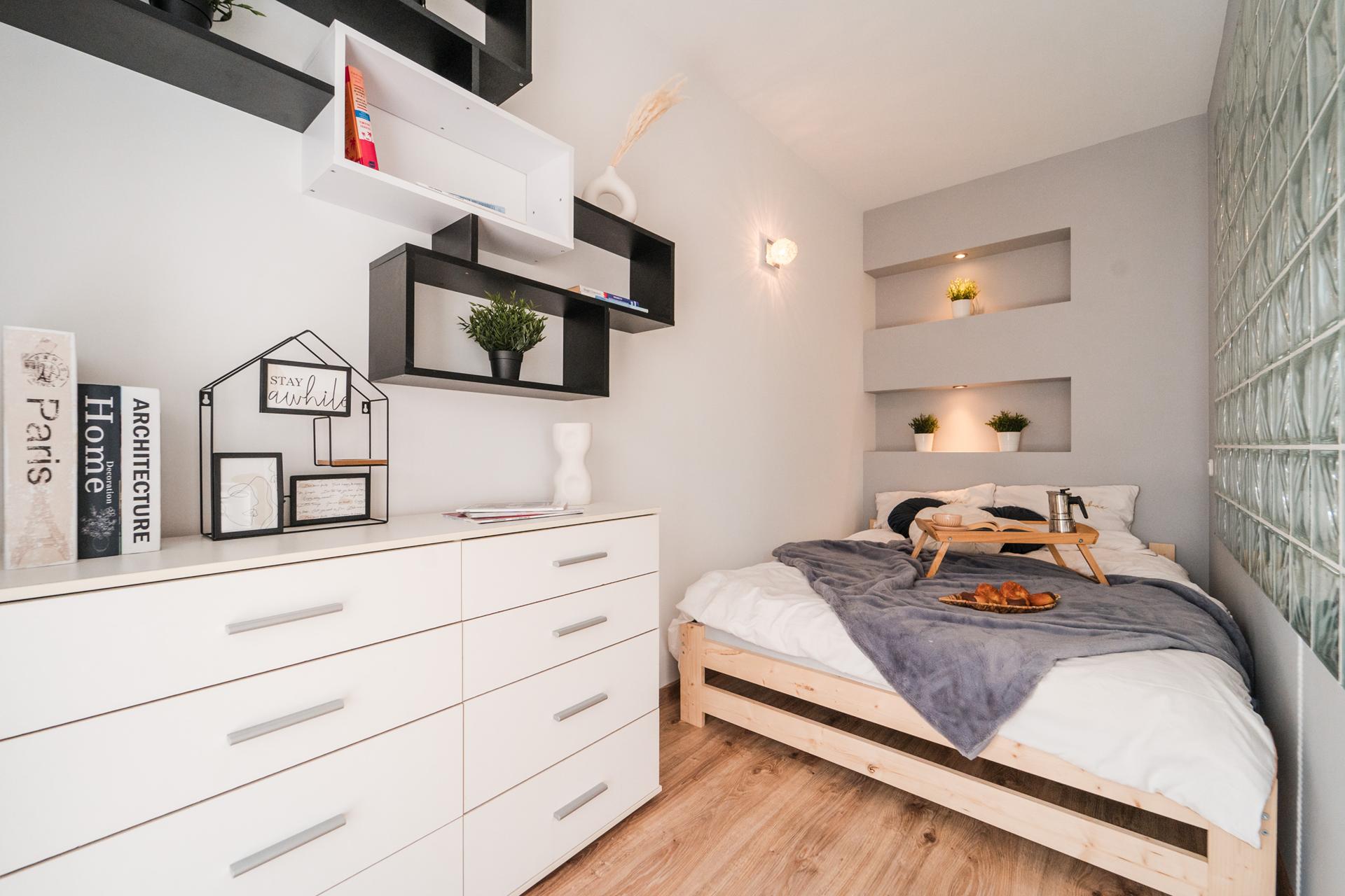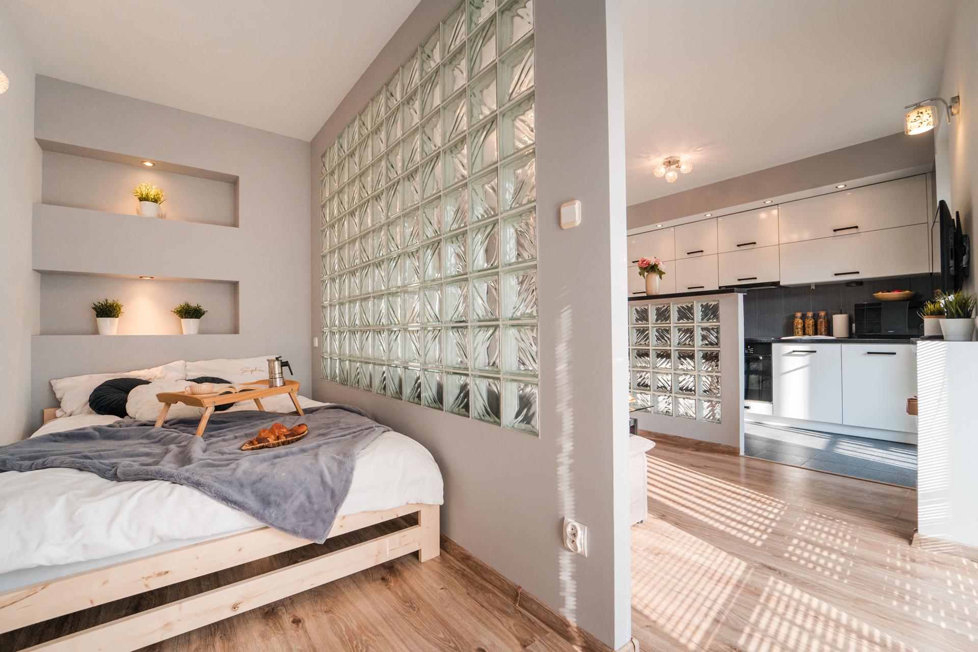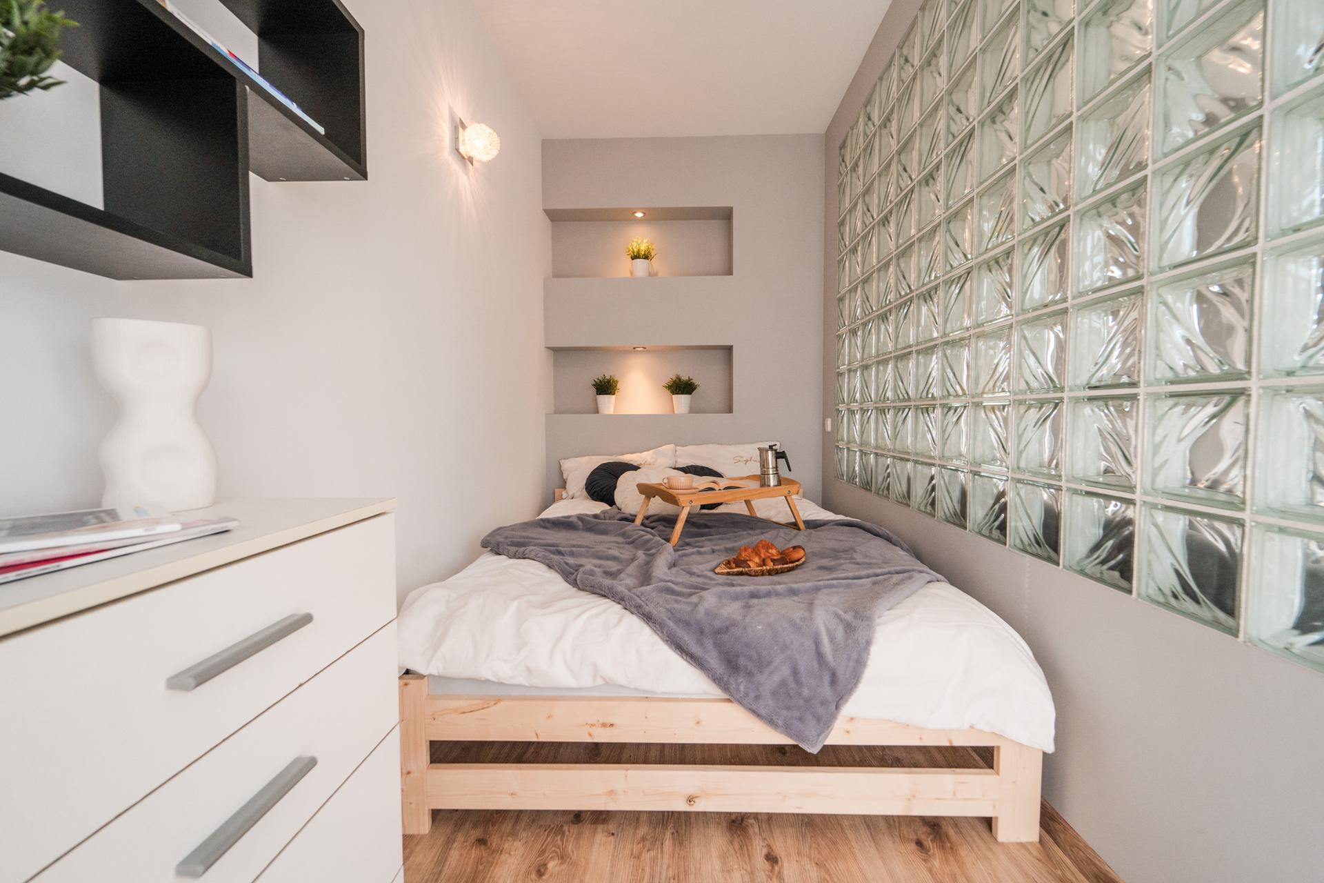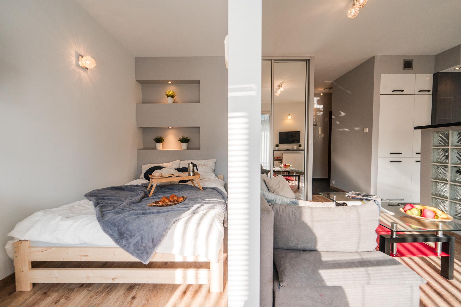 ☀️ Na wyposażeniu wygodne łóżko , pojemna szafa z lustrami, komoda do przechowywania oraz wygodna sofa ze stolikiem
