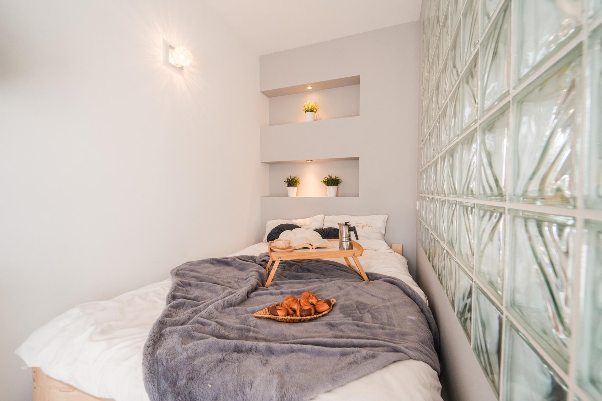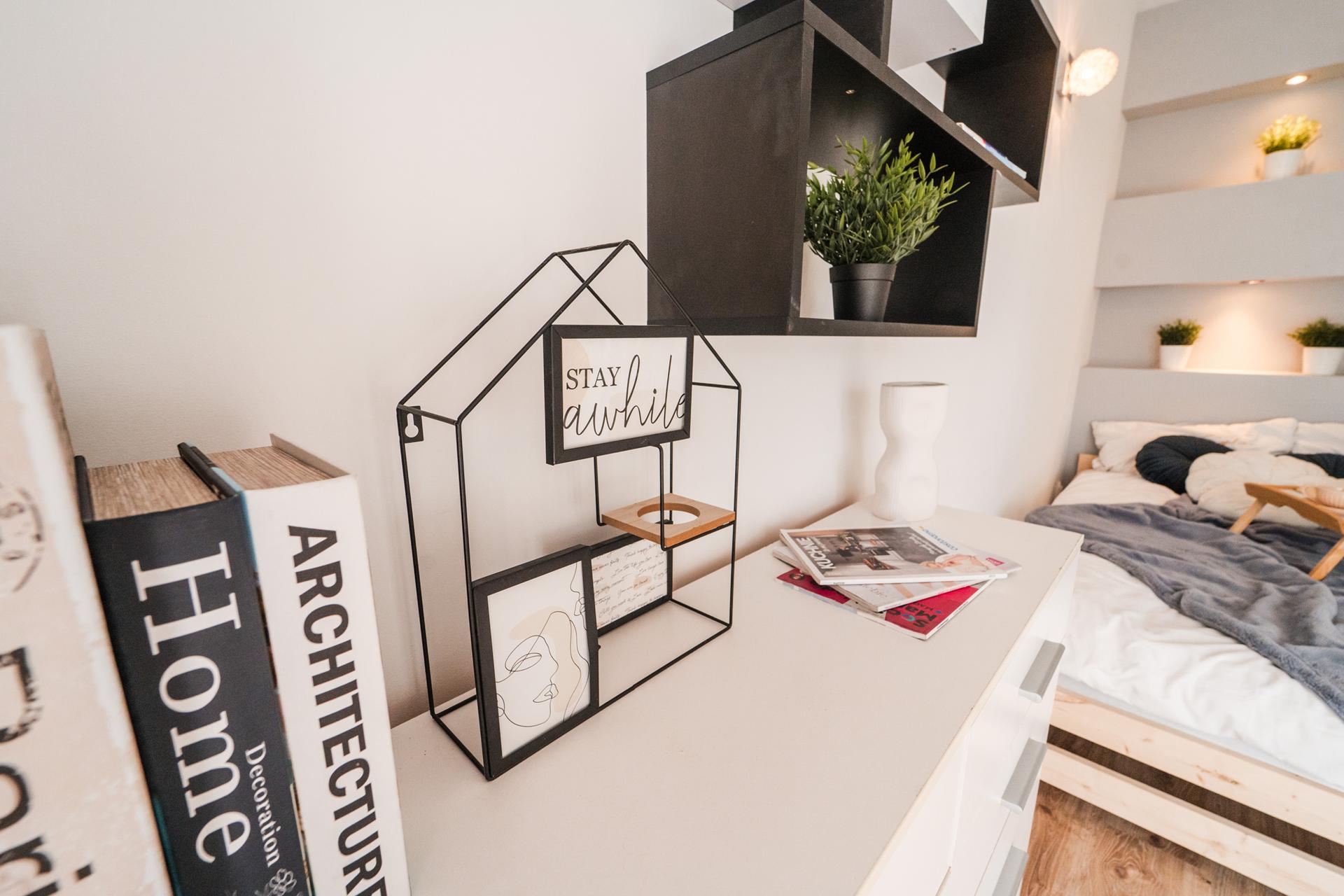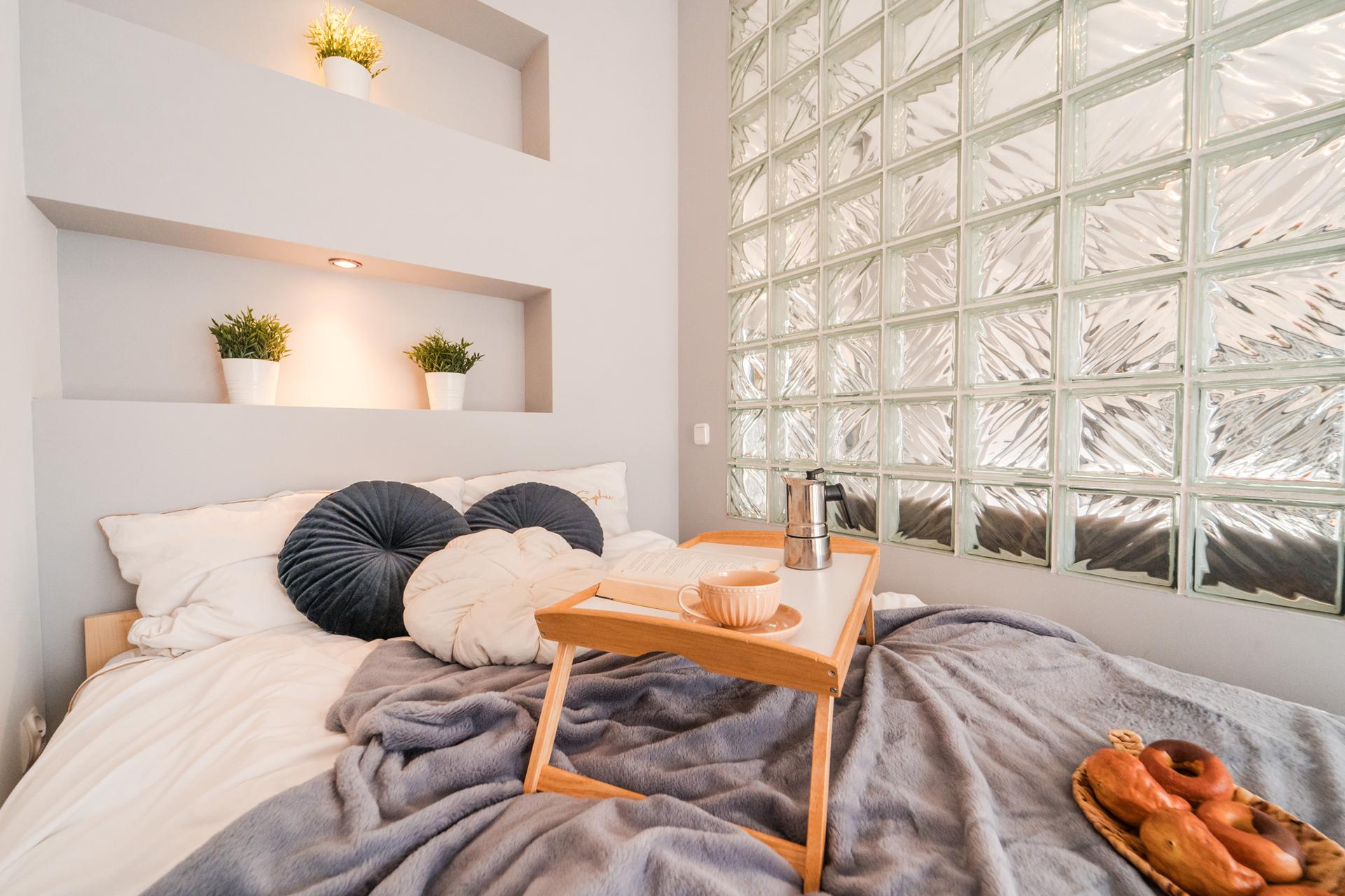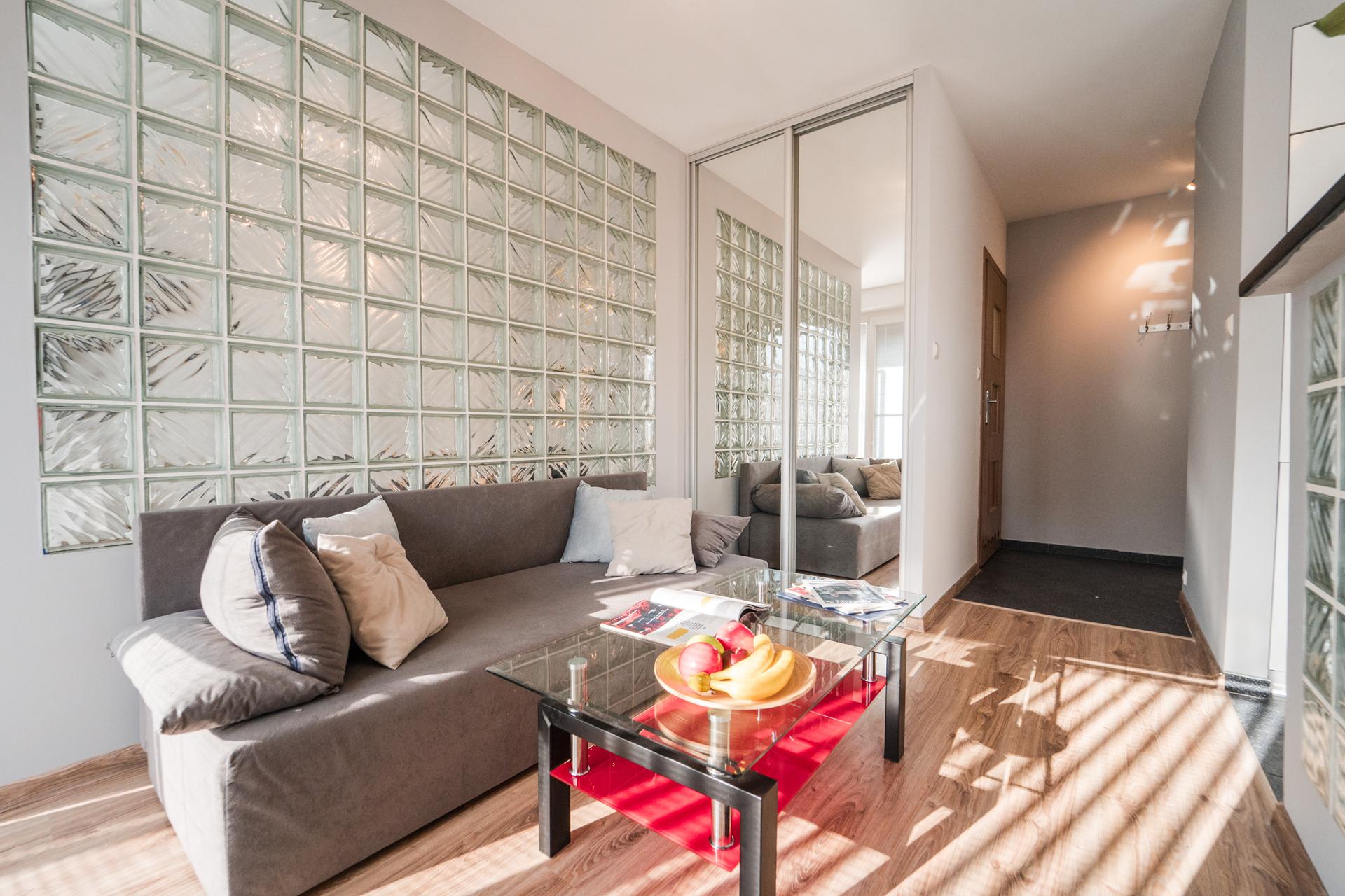 ☀️ Na wyposażeniu wygodne łóżko , pojemna szafa z lustrami, komoda do przechowywania oraz wygodna sofa ze stolikiem